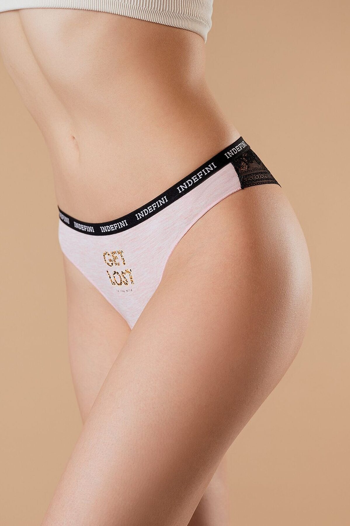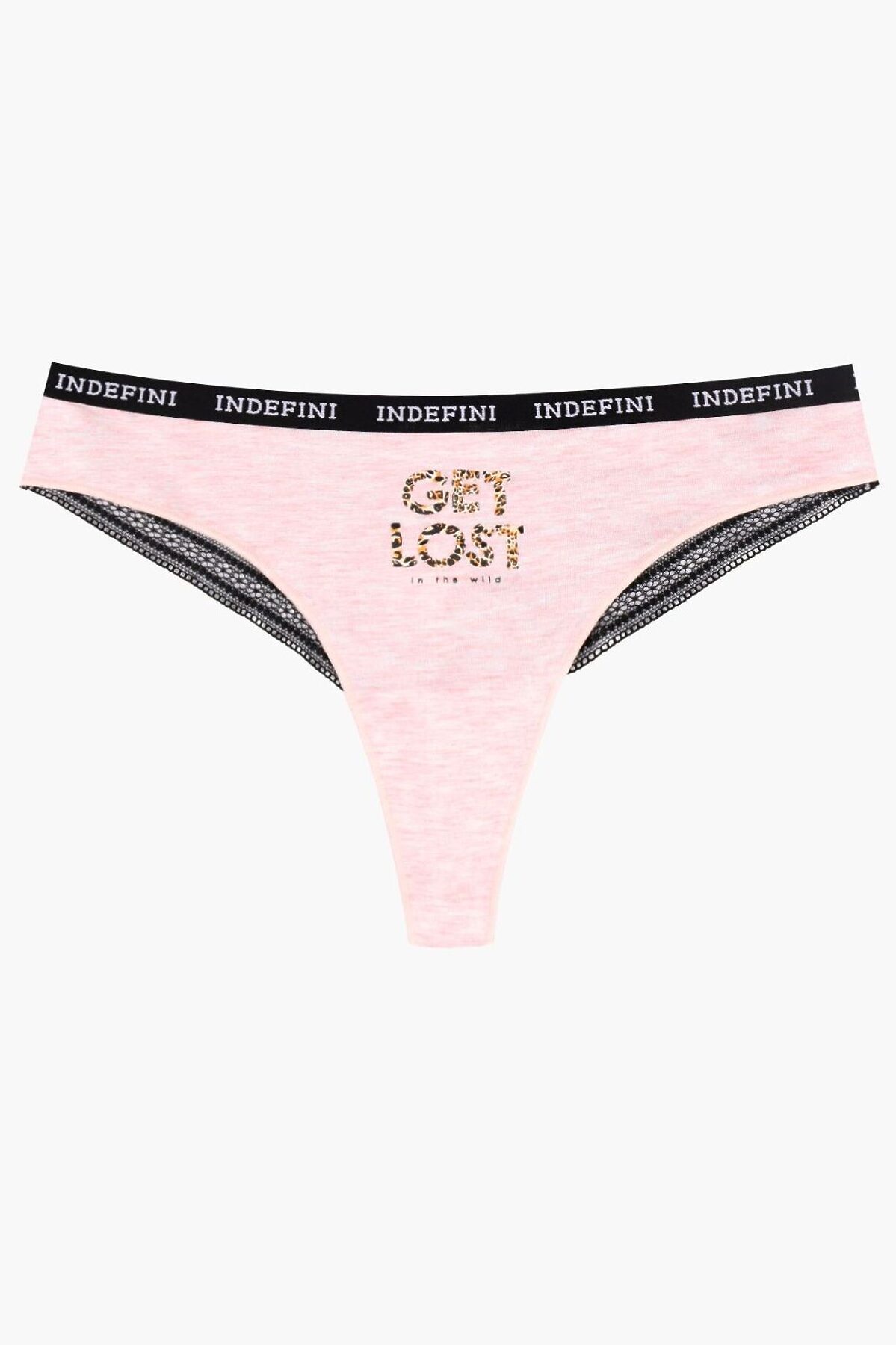 Трусы-стринги из модала, розового цвета, с принтом-надписями, с кружевной частью сзади, на мягкой резинке.