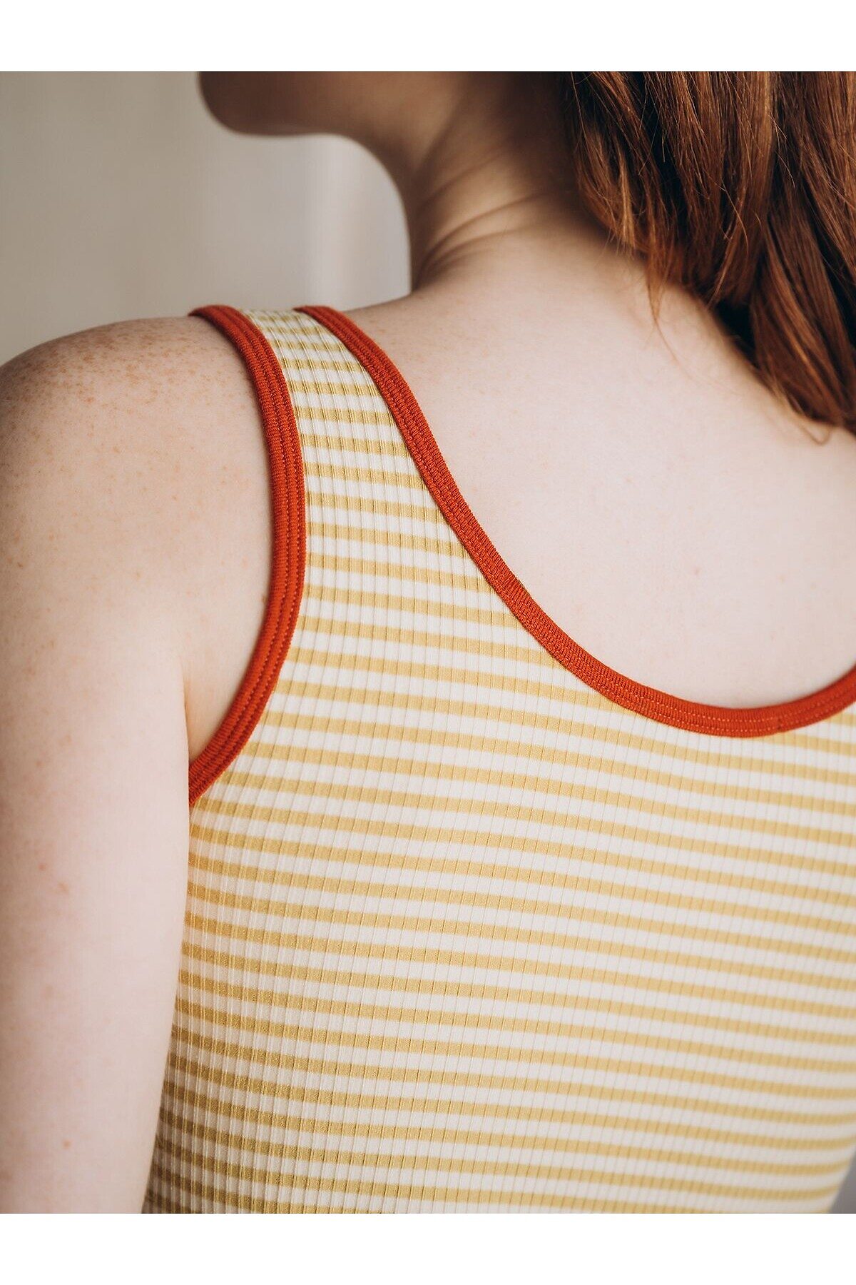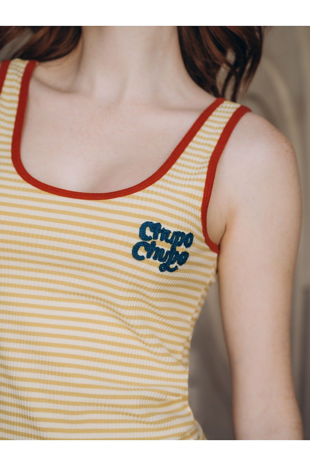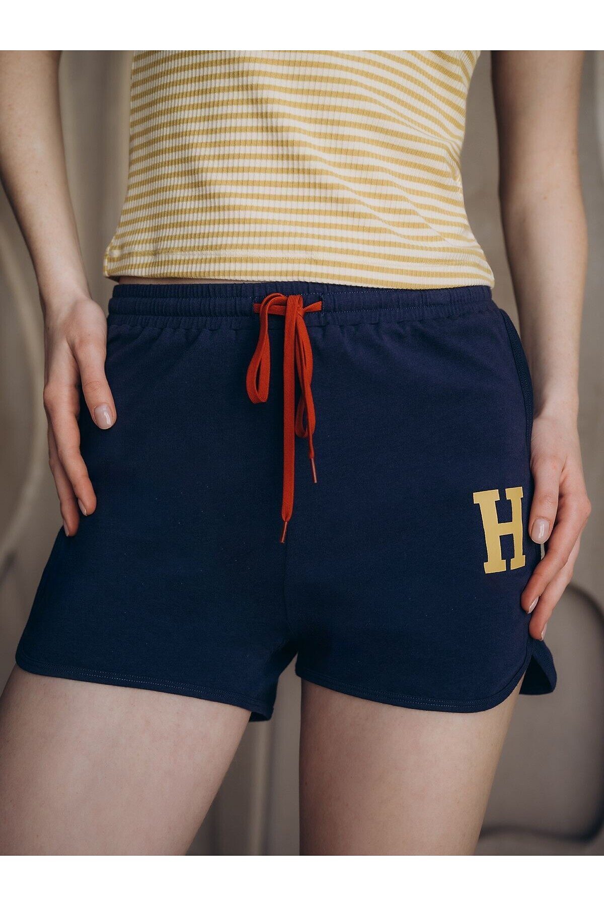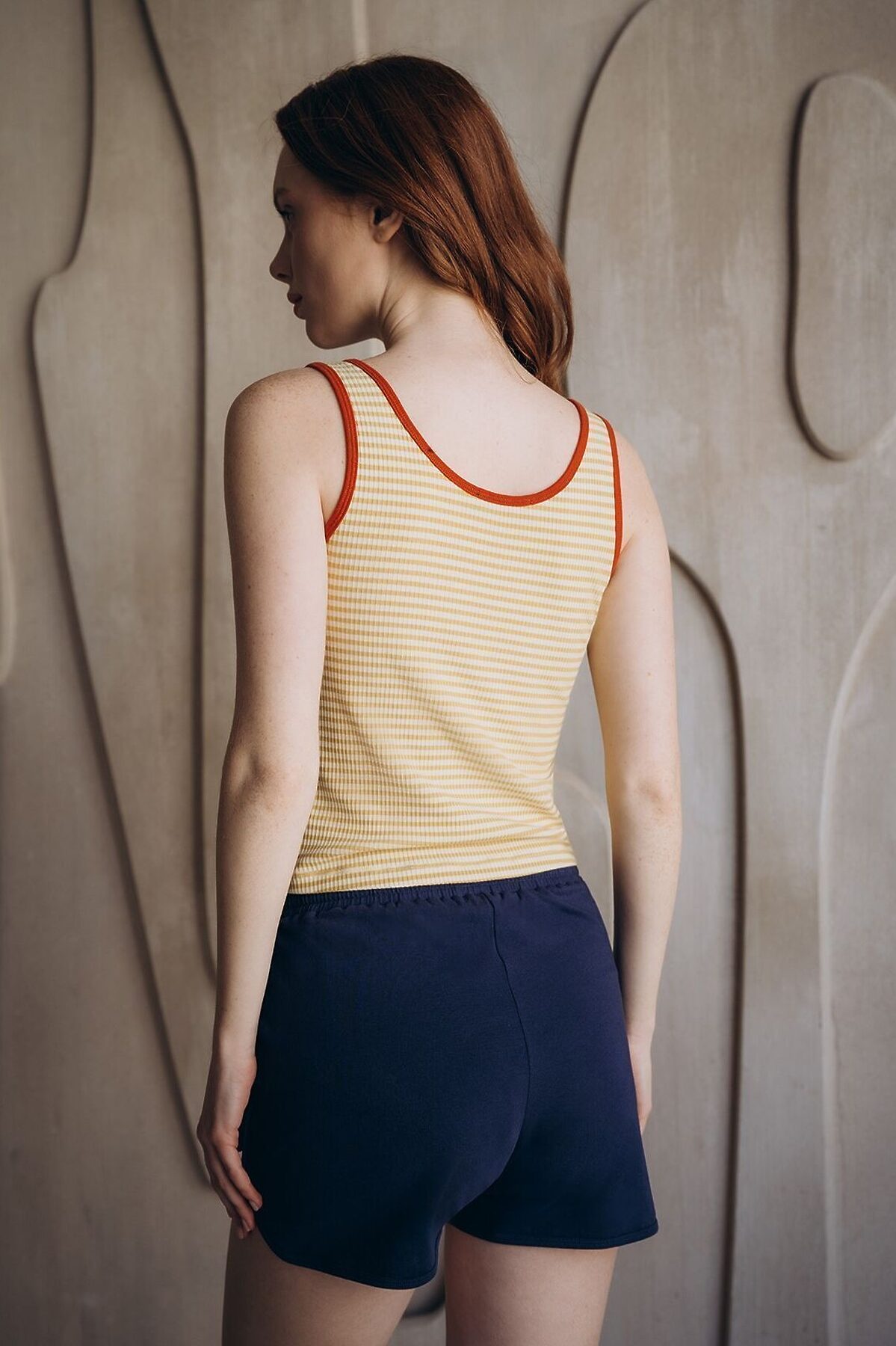 Домашняя пижама от торговой марки Indefini. В комплекте майка-топ и шорты. Майка из вискозы, желтого цвета, с принтом, в полоску, без рукавов, прилегающая. Шорты из хлопка, синего цвета, с принтом-нашивкой, прямые, прилегающие