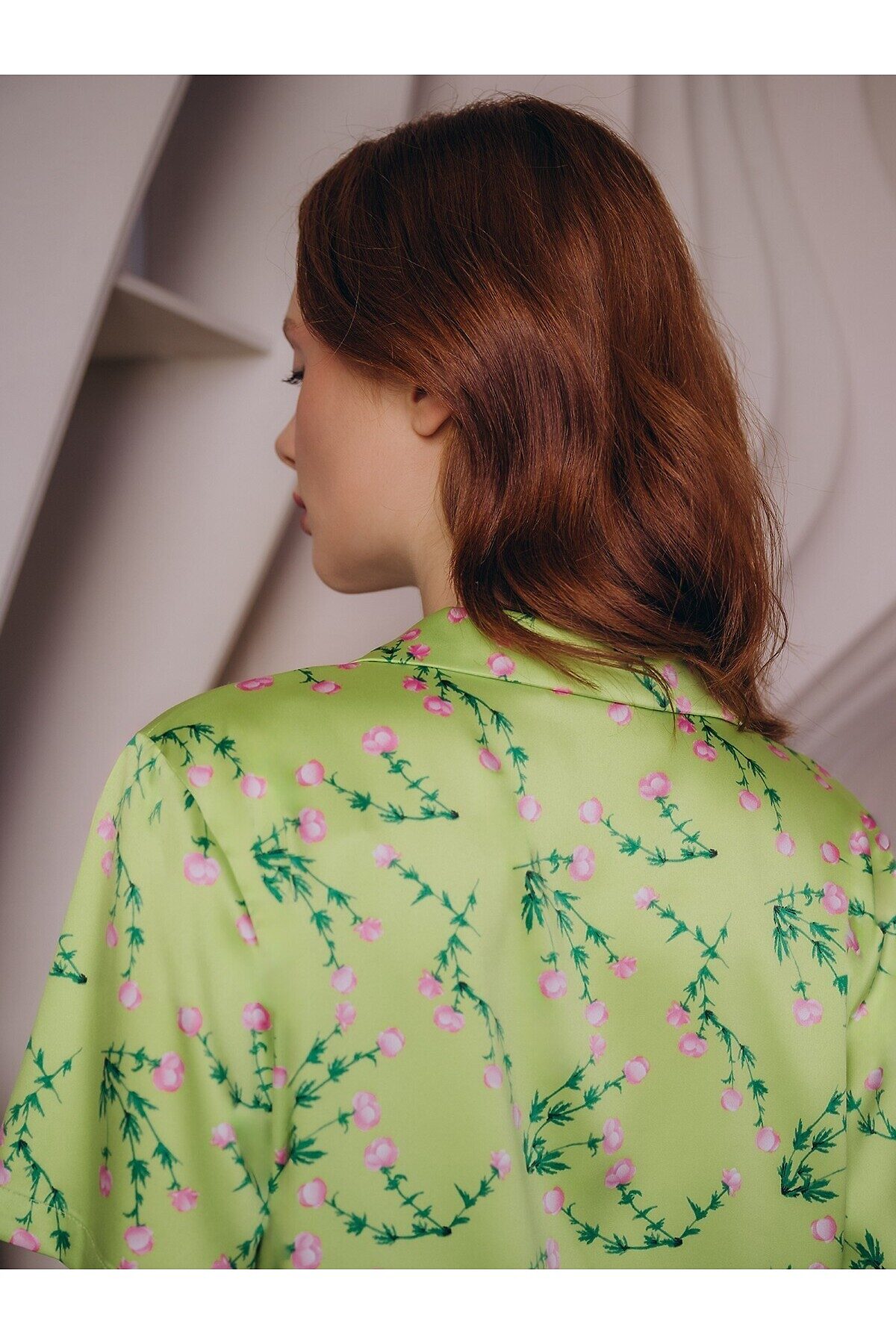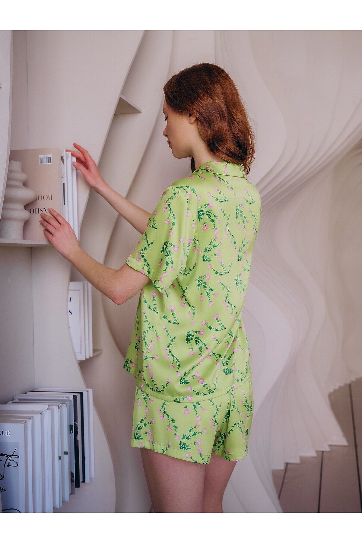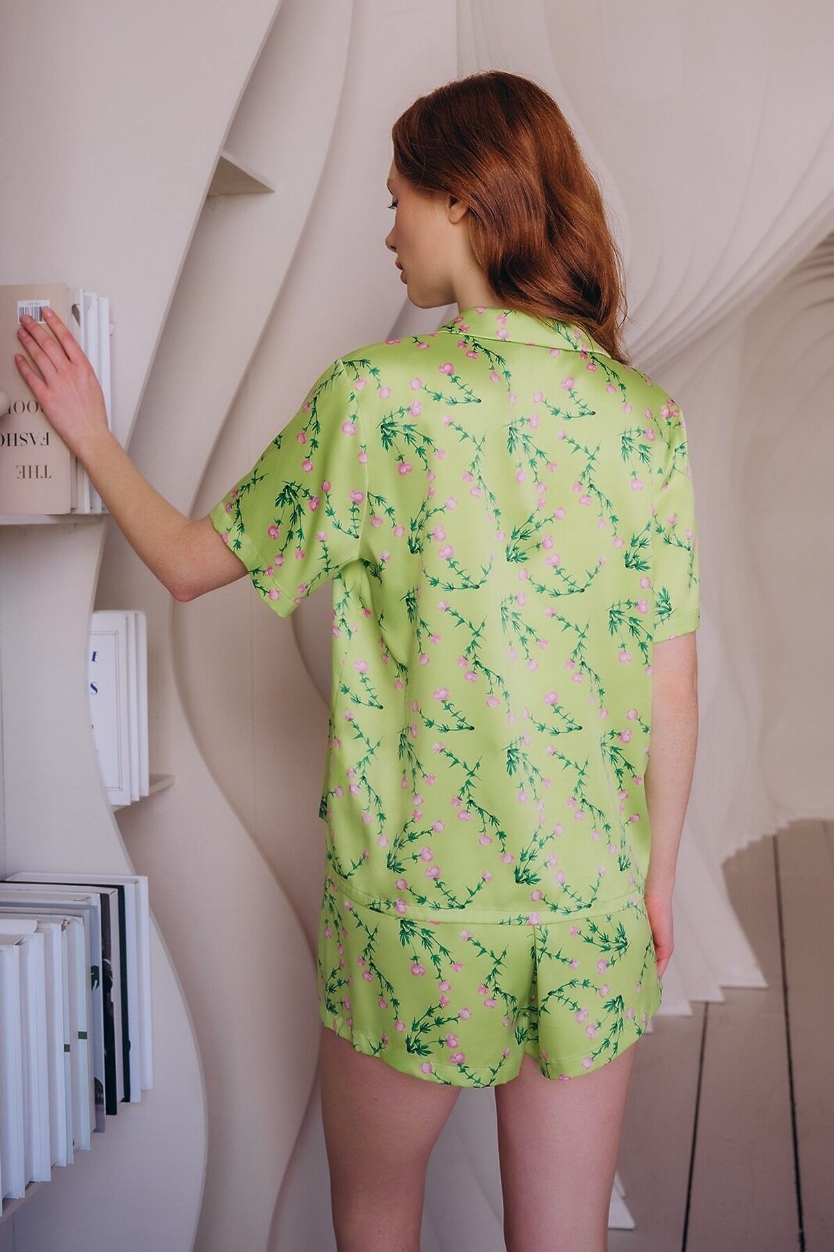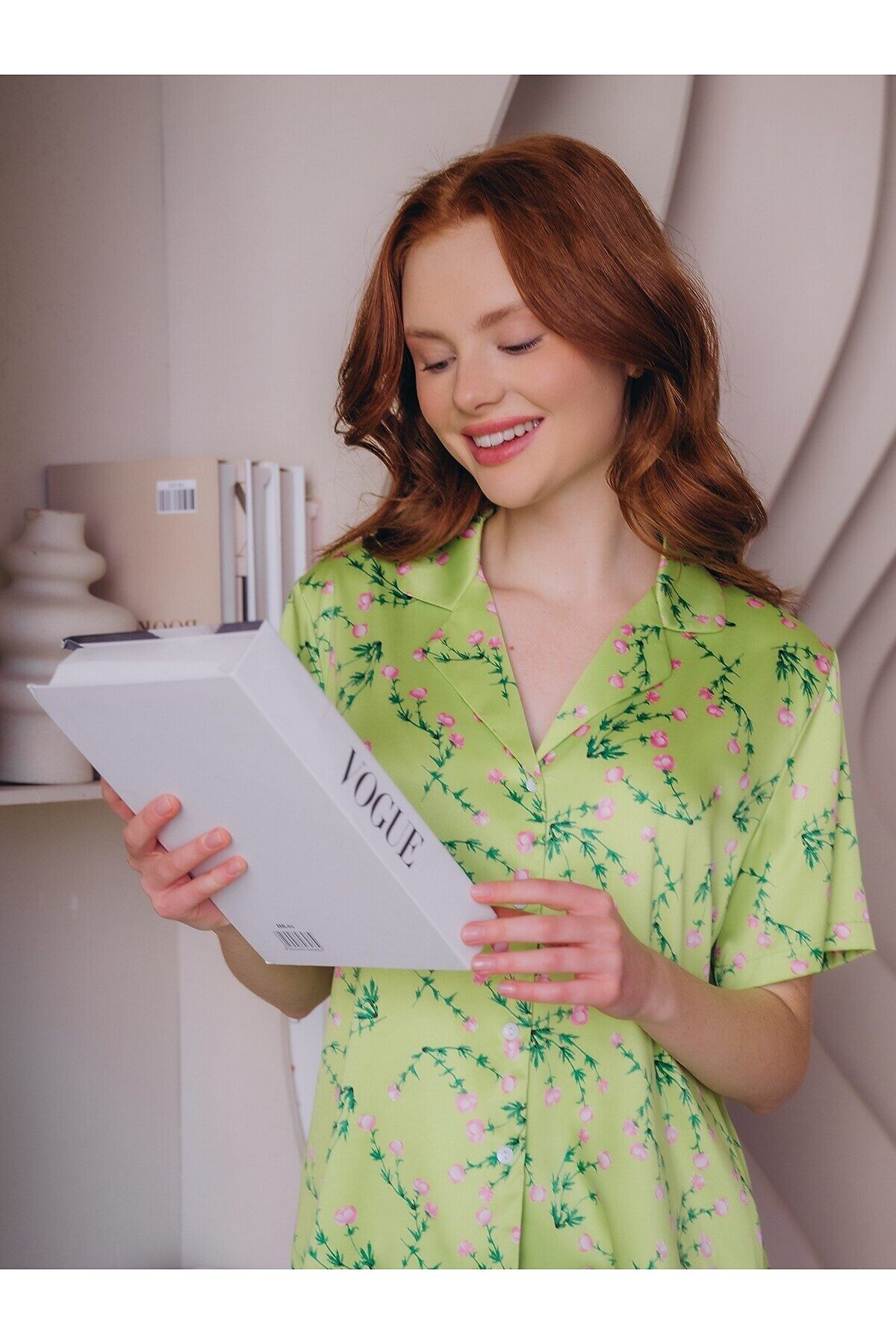 Пижама женская 3047TBD бренда Indefini, изготовленная из полиэстера, мягкая и гладкая на ощупь. В комплект входит футболка прямого свободного кроя с короткими рукавами, отложным воротником и пуговицами, что придаёт ей элегантный вид. Шорты свободного кроя на мягкой резинке с регулирующим атласным шнурком надежно сидят на талии. Пижама Indefini салатового цвета украшена нежным цветочным принтом, добавляя пижаме свежести и женственности.