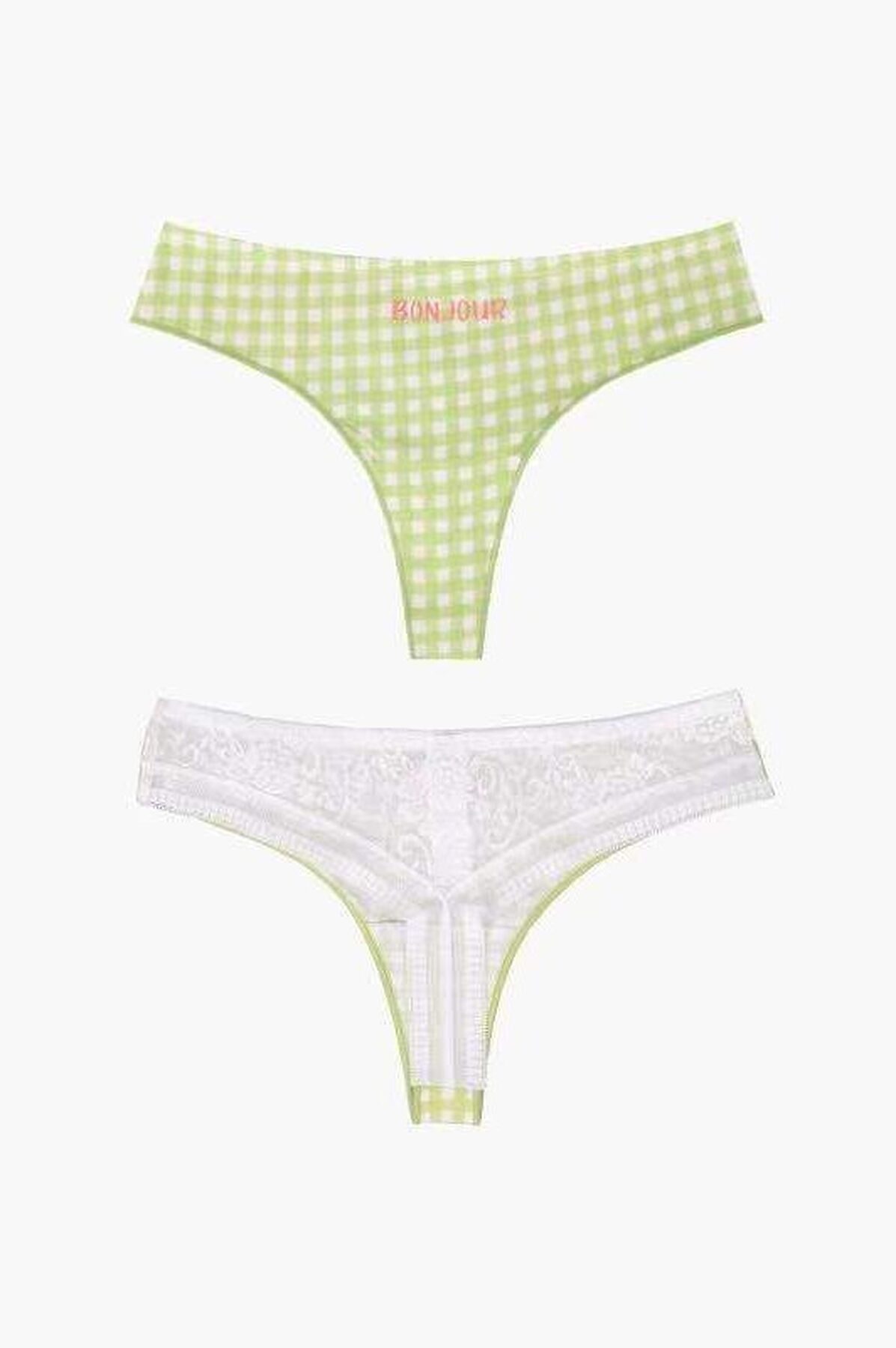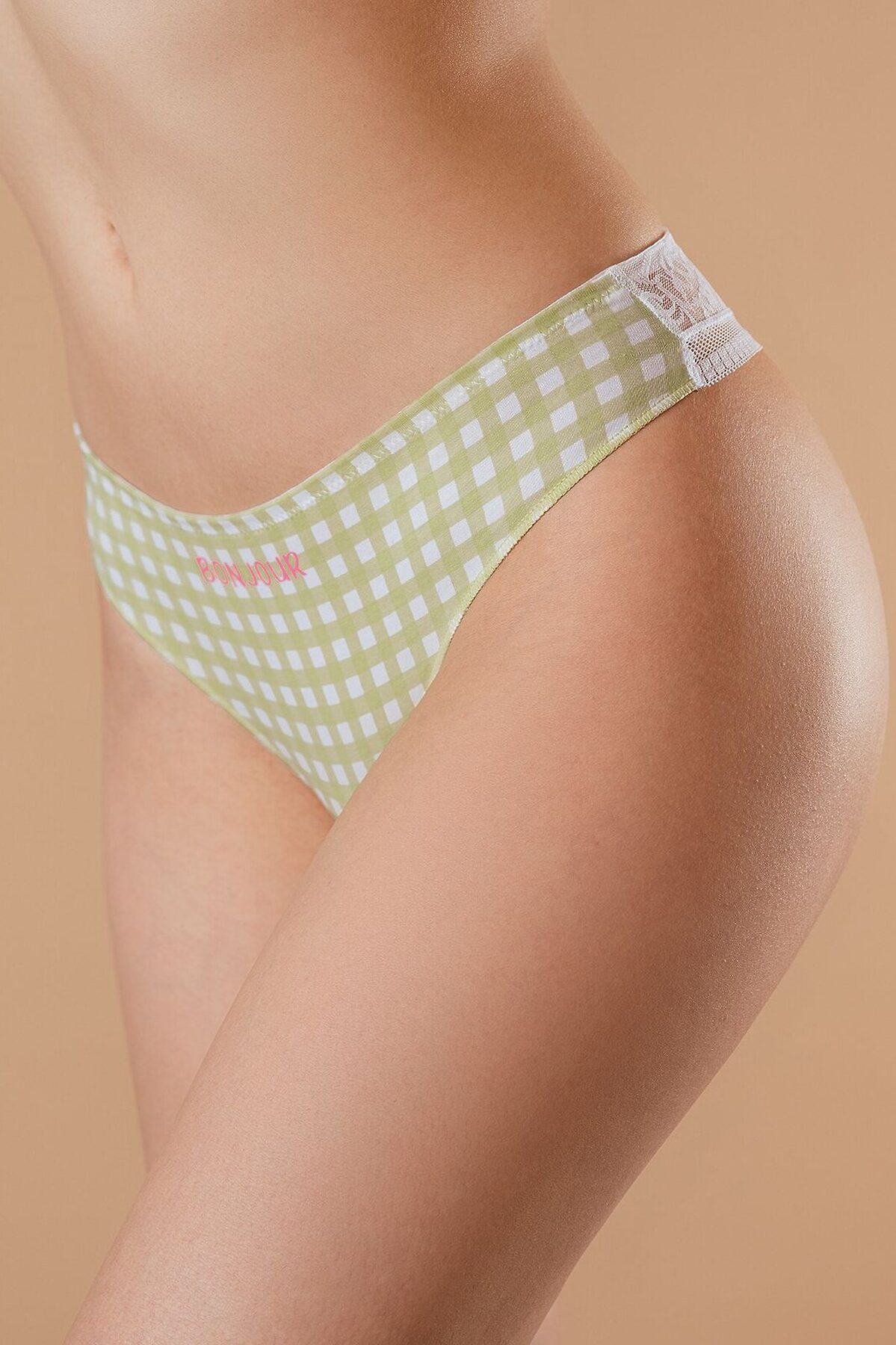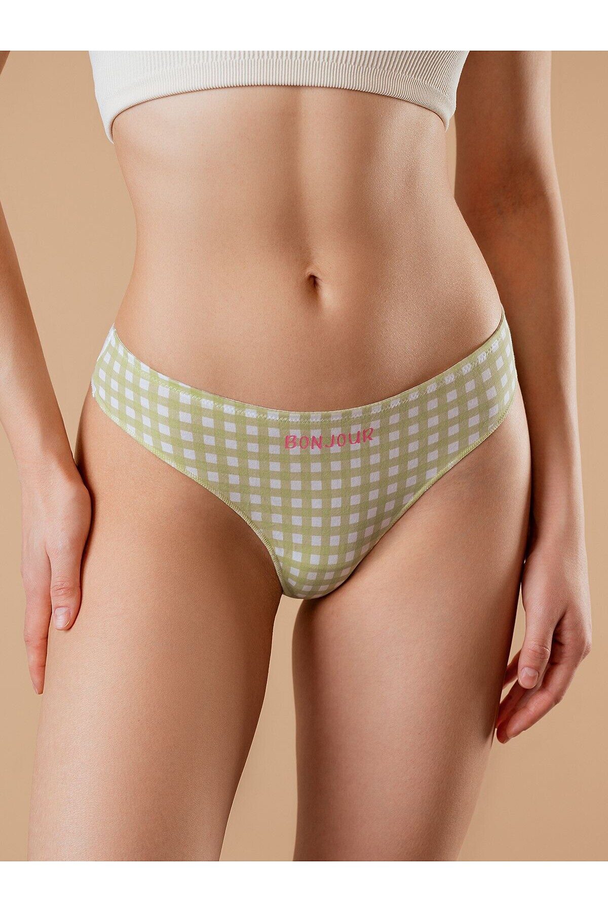 Женские трусы от торговой марки Индефини. Трусы-стринги из хлопка, зеленого цвета с принтом, с кружевной частью сзади, на мягкой резинке, средней посадки.
