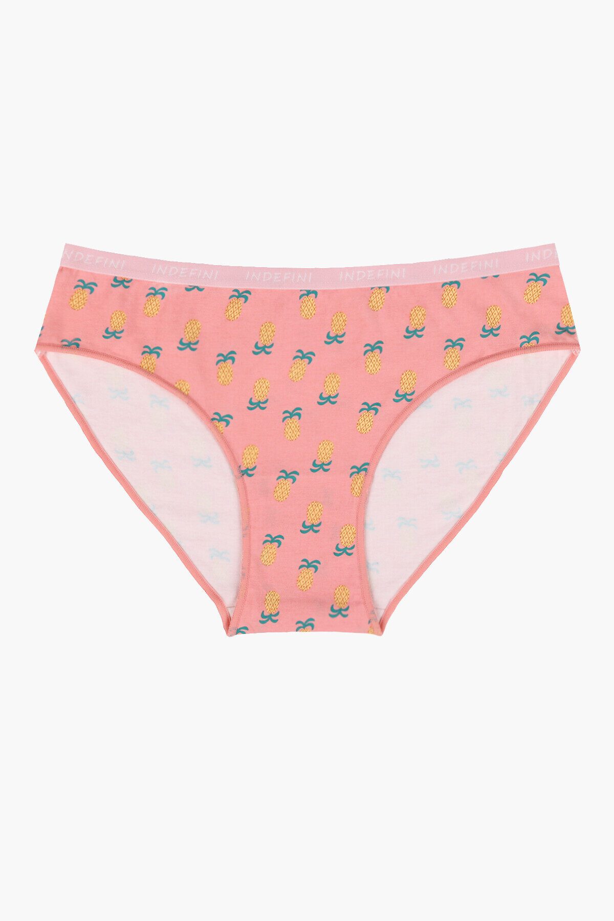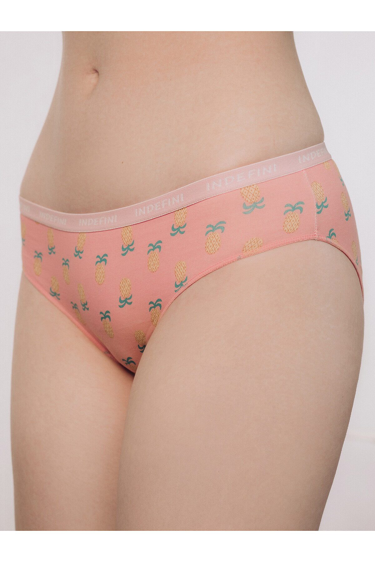Трусы слипы женские 3116LUF бренда Indefini изготовлены из хлопка. Выполнены в розовом цвете. Трусы средней посадки держатся на талии мягкой резинкой, украшенной надписью «INDEFINI». На внутренней стороне трусов имеется хлопковая ластовица. На трусы нанесён принт с изображением ананасов.