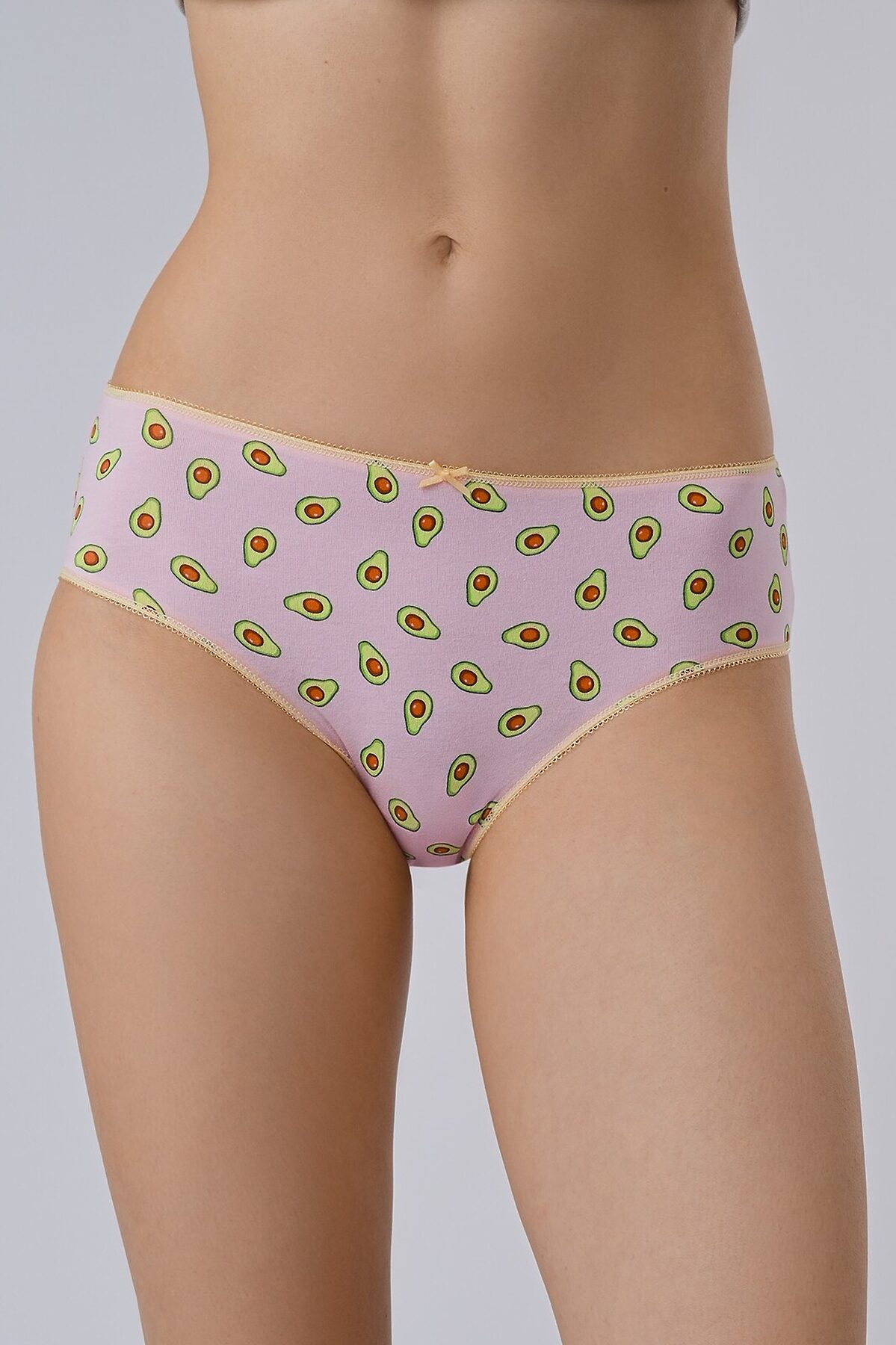 русы слипы женские изготовлены из хлопка. Они выполнены в розовом цвете с нанесенным фруктовым принтом с изображением авокадо. Трусы имеют среднюю посадку и мягкую тонкую желтую резинку на талии. На передней части имеется желтый декоративный бантик. На внутренней стороне трусов расположена хлопковая ластовица.