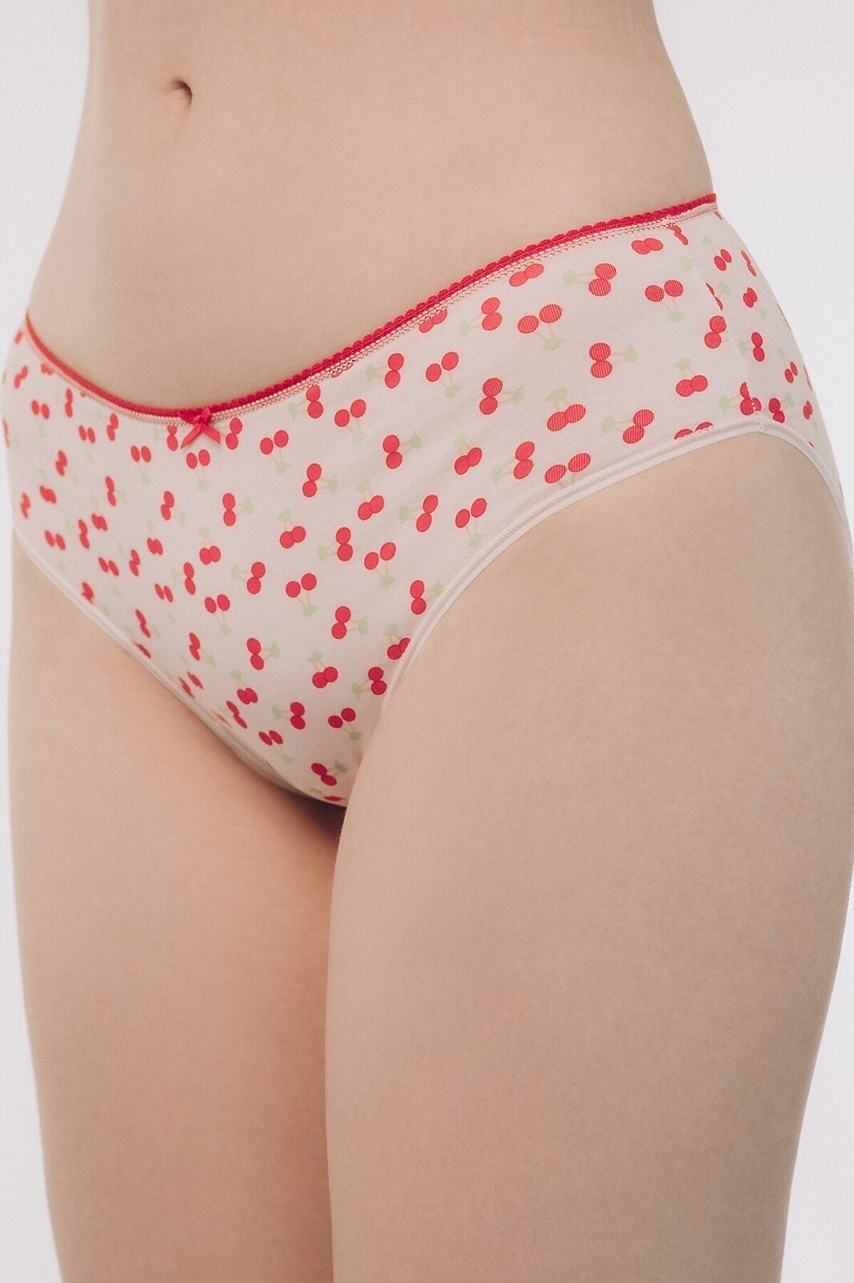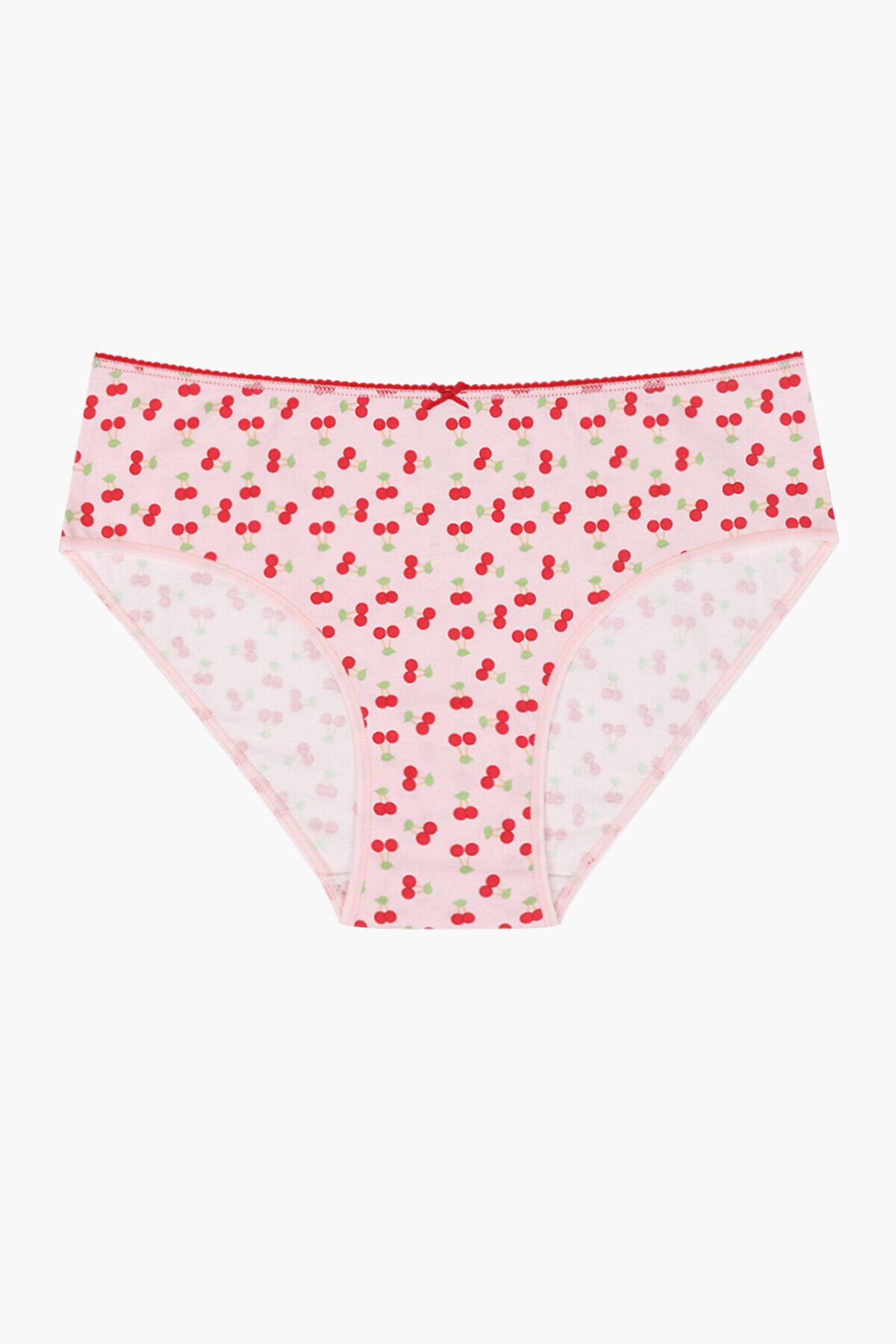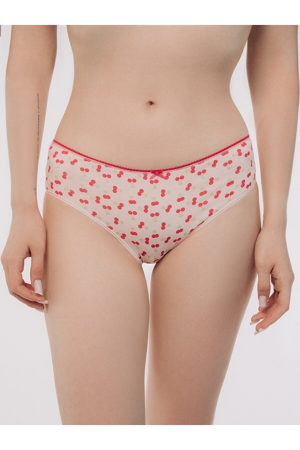 Трусы слипы женские 3128LUB бренда Indefini изготовлены из хлопка. Выполнены в розовом цвете. Трусы средней посадки держатся на талии мягкой зелёной резинкой. На передней стороне резинки расположен маленький красный декоративный бантик. На внутренней стороне трусов имеется хлопковая ластовица. На трусы нанесён принт с изображением вишни.