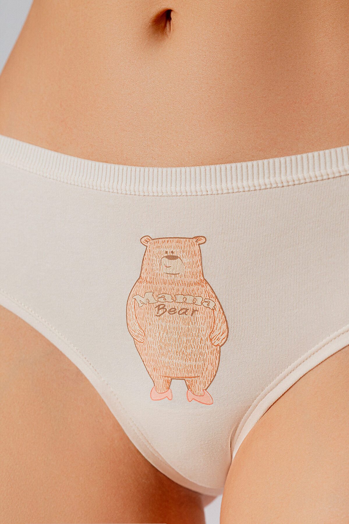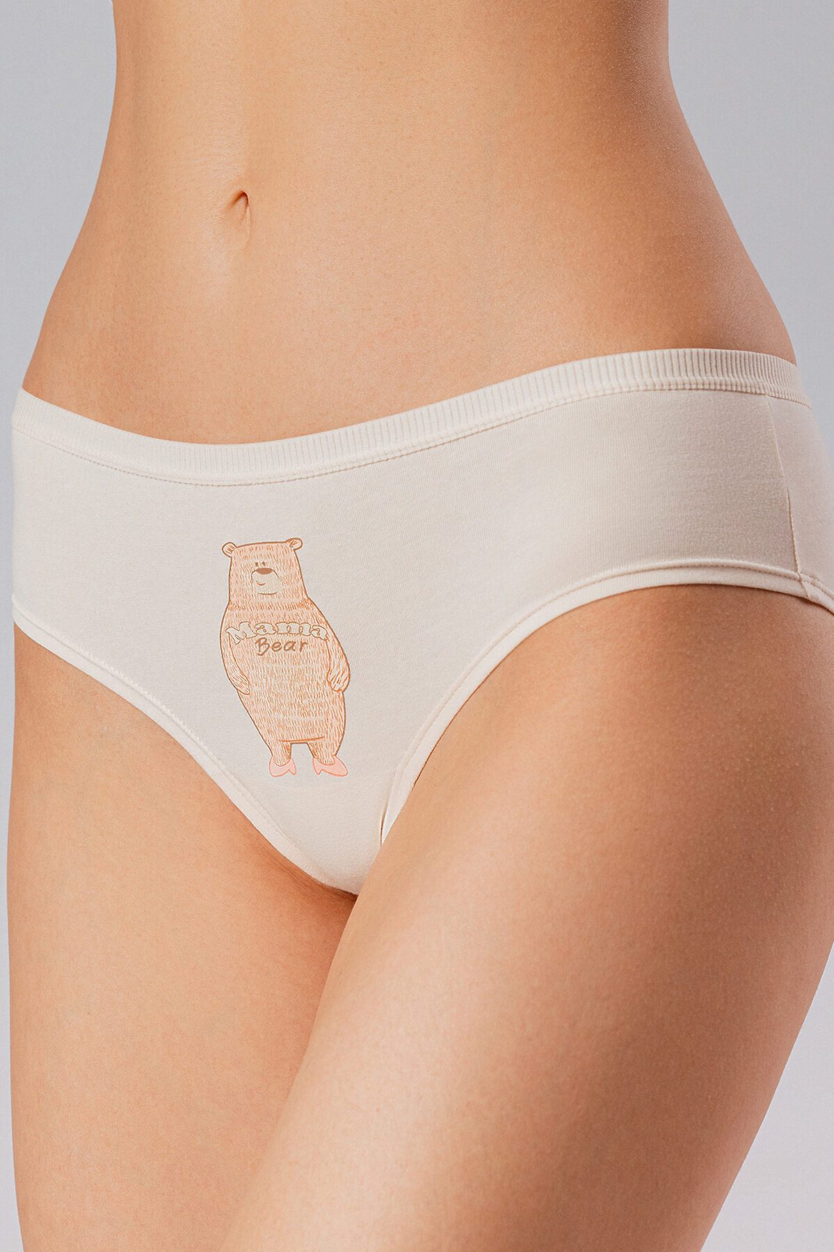 Мягкие трусы-слипы бежевого цвета из натурального хлопка с забавным принтом в виде рисунка медведя и надписью "Mama bear". Уютная и удобная модель для повседневной носки. Особенности: — Состав: 95% хлопок — гипоаллергенный, дышащий материал для комфорта в течение дня — Милый принт с медведем и надписью "Mama bear" — игривый и трогательный дизайн — Классический крой — удобная посадка без стягивания — Мягкая резинка — не давит и не оставляет следов на коже Идеальный вариант для тех, кто хочет добавить нотку тепла и позитива в повседневный образ.