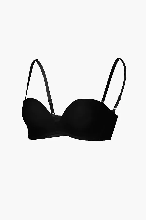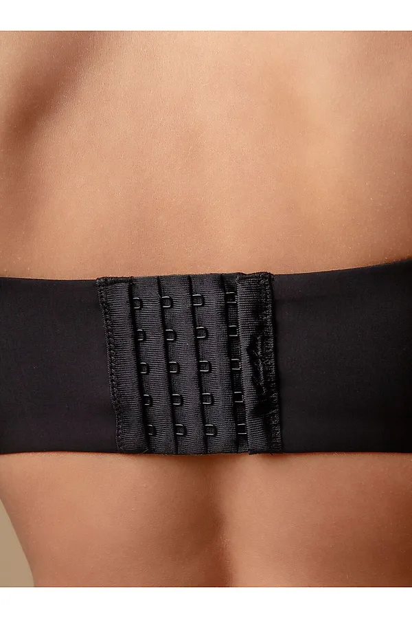 Бюстгальтер от торговой марки Индефини. Бюстгальтер из полиамида, черного цвета, на косточках, с формованными чашками, с Push-up, на широком поясе, с косточками сбоку, на застежках, на тонких лямках, лямки отстегиваются, лямки регулируются.
