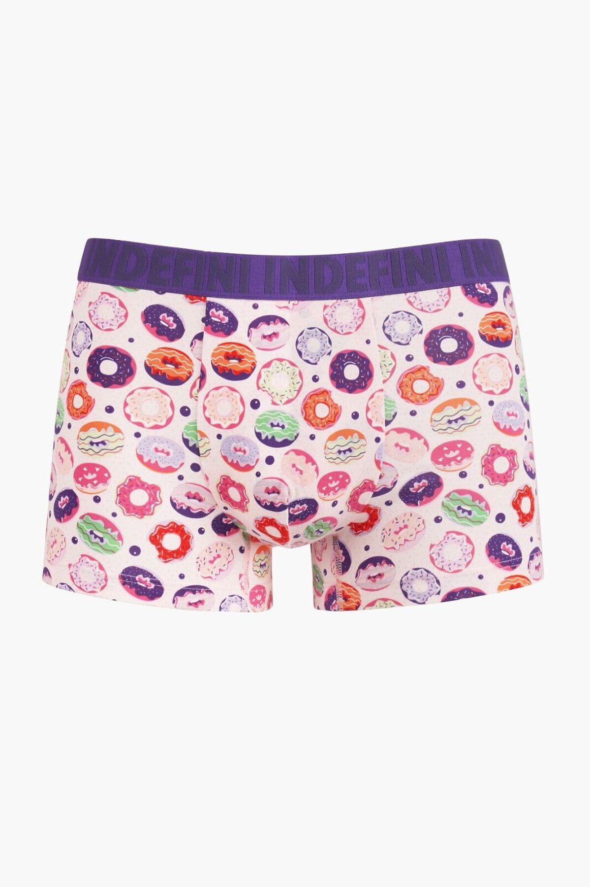 Мужские трусы изготовлены из мягкой хлопковой ткани с добавлением эластана. Выполнены в белом цвете с ярким и веселым принтом, изображающим разноцветные пончики с глазурью и посыпкой. Трусы средней посадки с широкой фиолетовой эластичной резинкой на талии, украшенной повторяющимся логотипом бренда indefini. Идеальный выбор для тех, кто ценит стиль, комфорт и позитивное настроение в повседневной одежде.