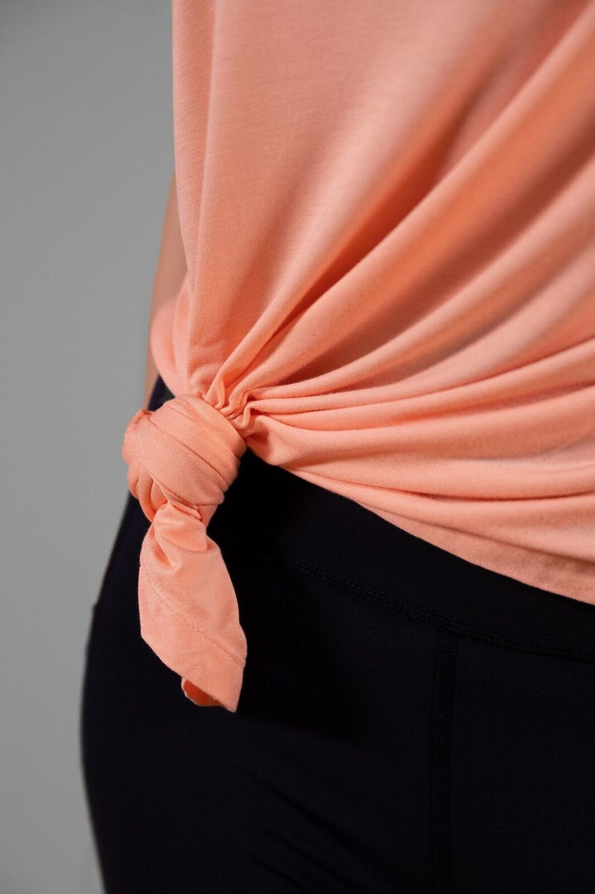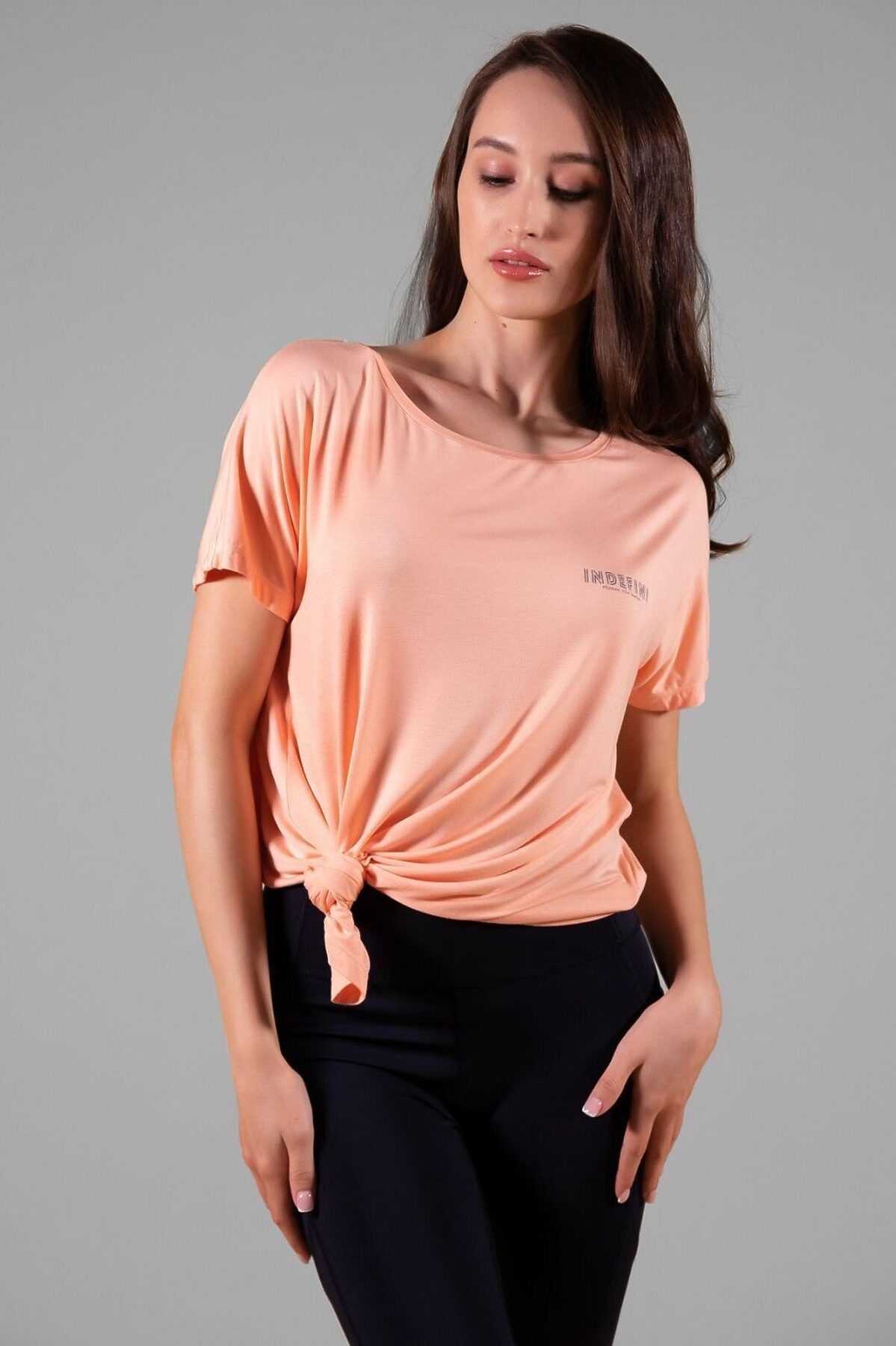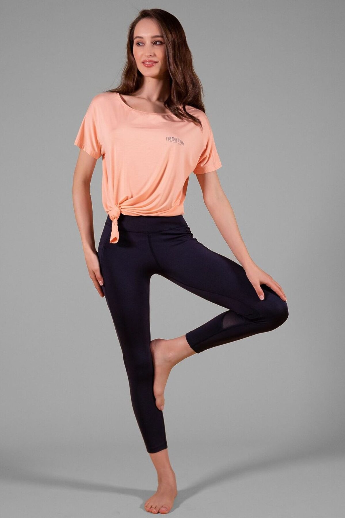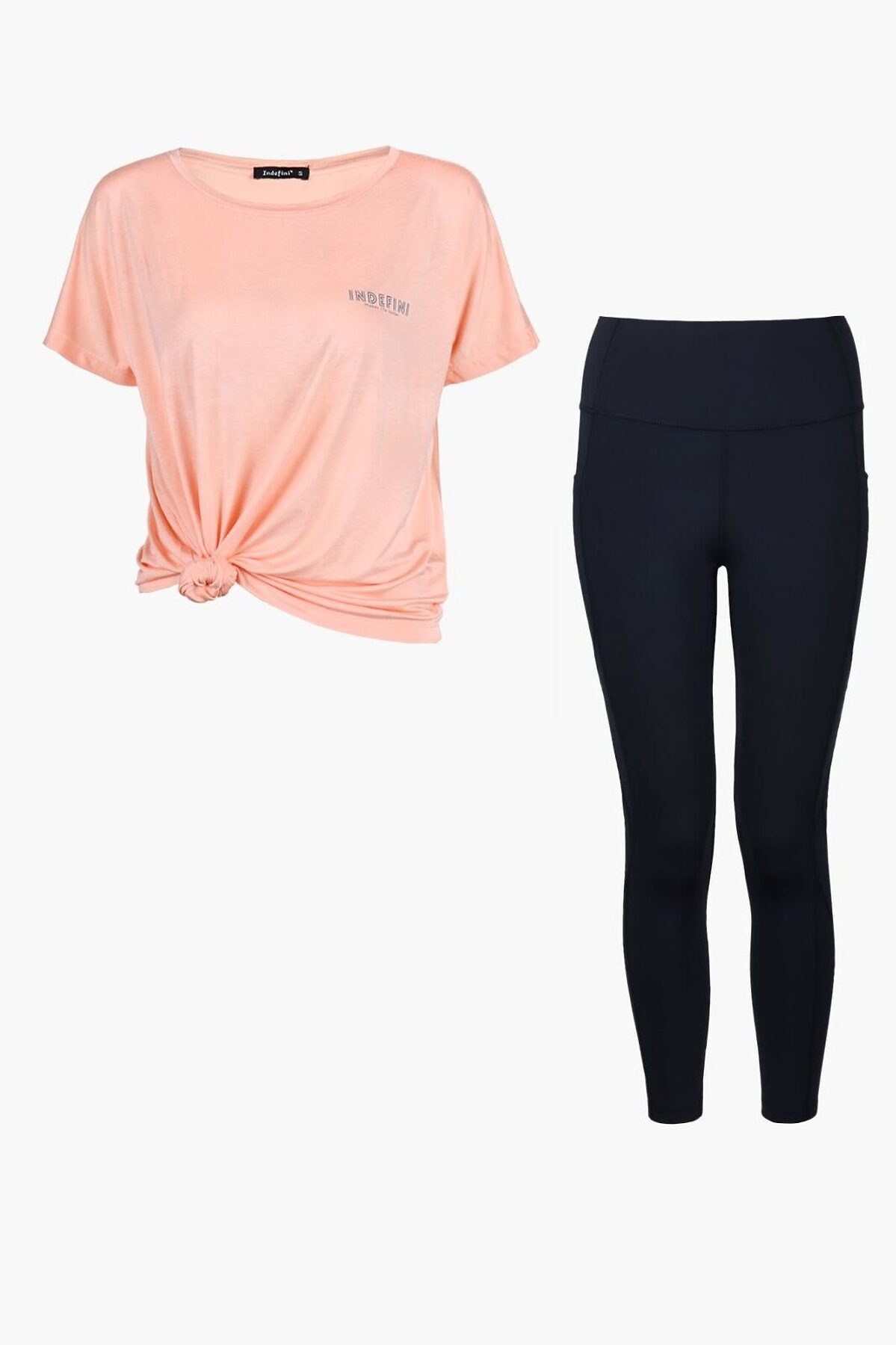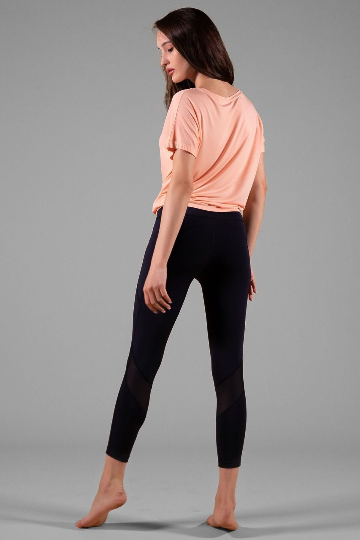 В комплекте футболка с леггинсами. Футболка из бамбука, лососевого цвета, с принтом, с короткими рукавами, укороченная, с декоративной сборкой спереди, свободного кроя. Леггинсы черного цвета, со вставками из микросетки, средней посадки.
