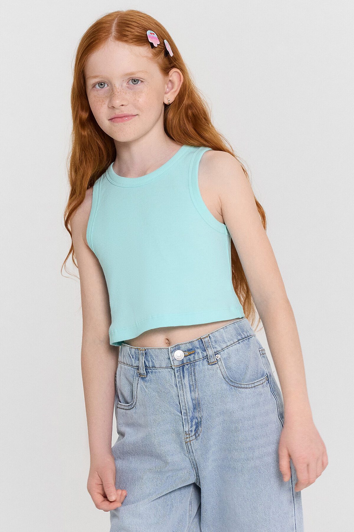 Топ для девочек прилегающего силуэта. Горловина круглая. Проймы и горловина окантованы бейкой из основного полотна. Низ изделия обработан швом в подгибку.
