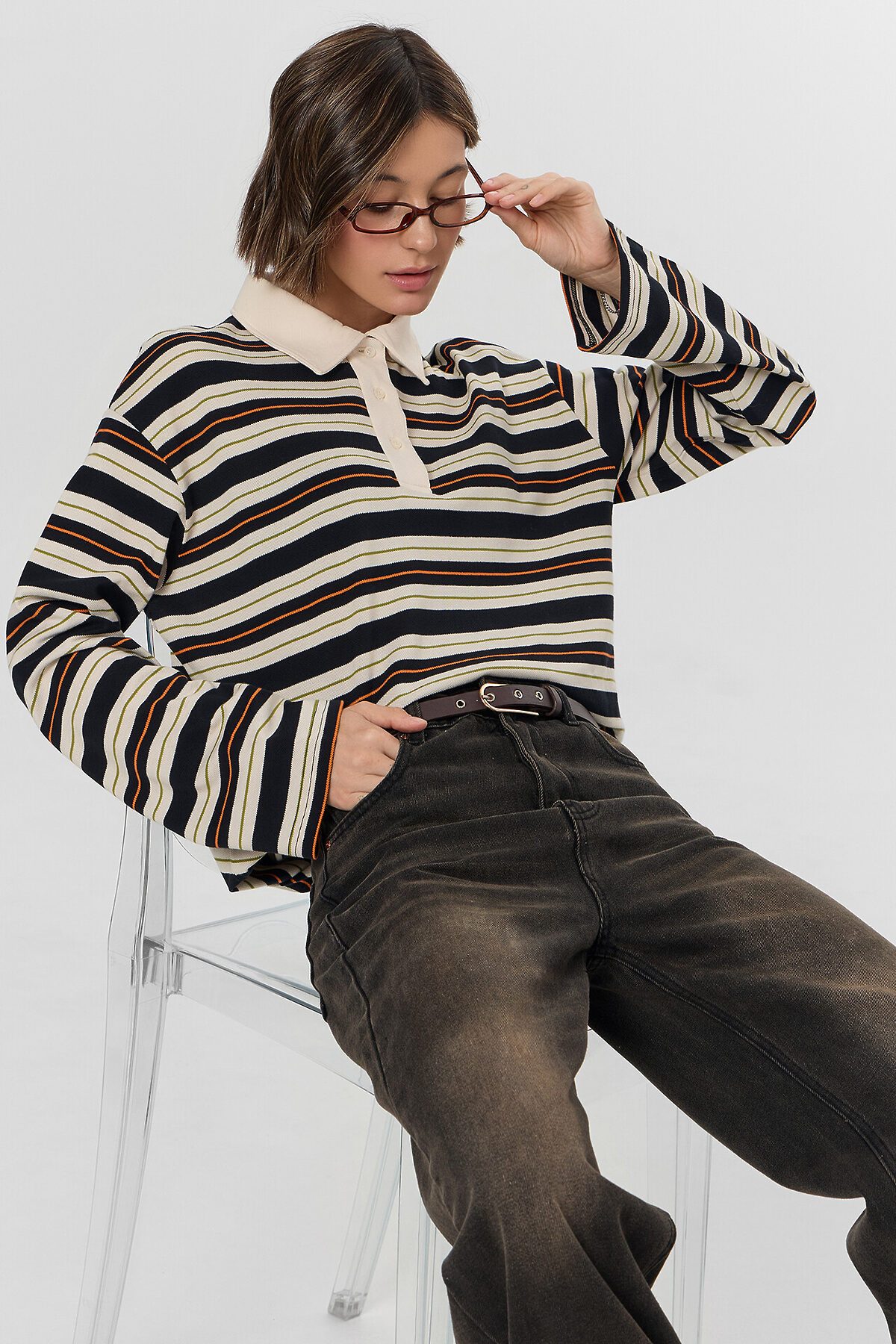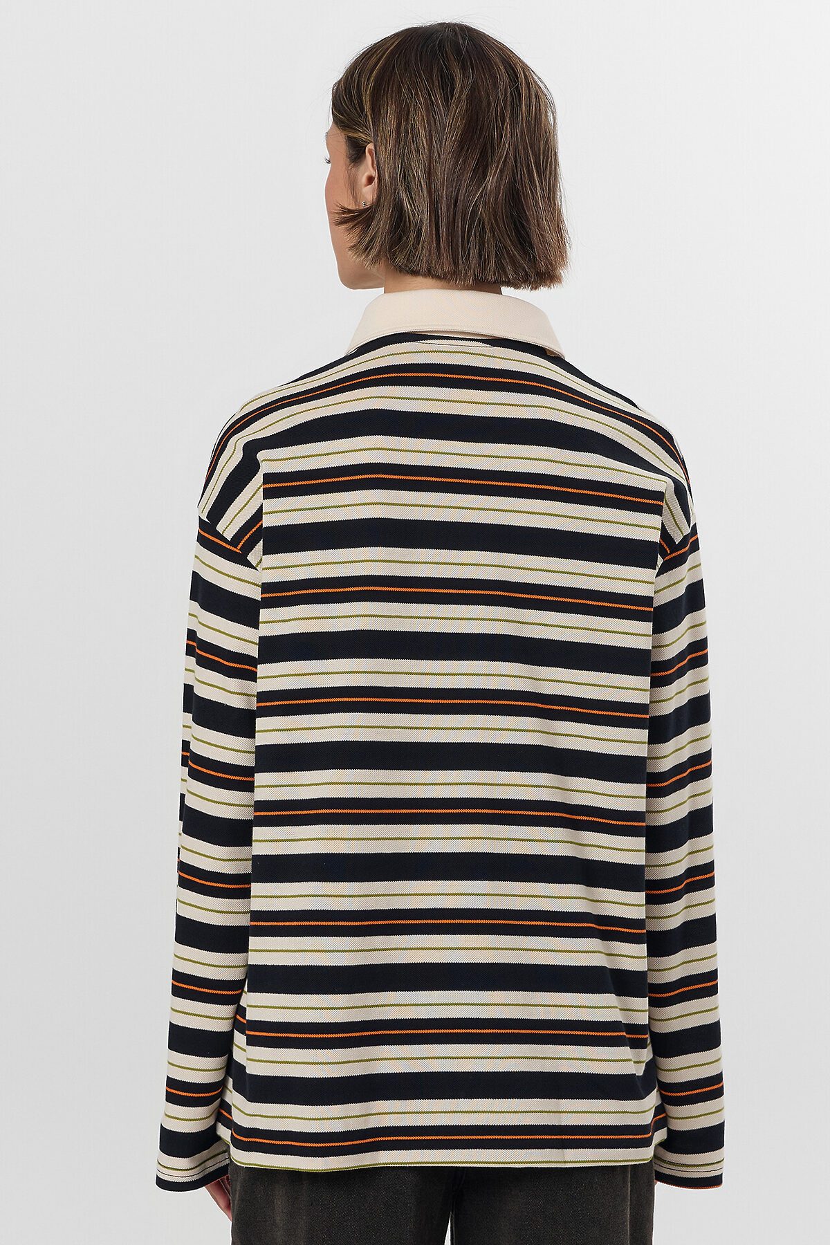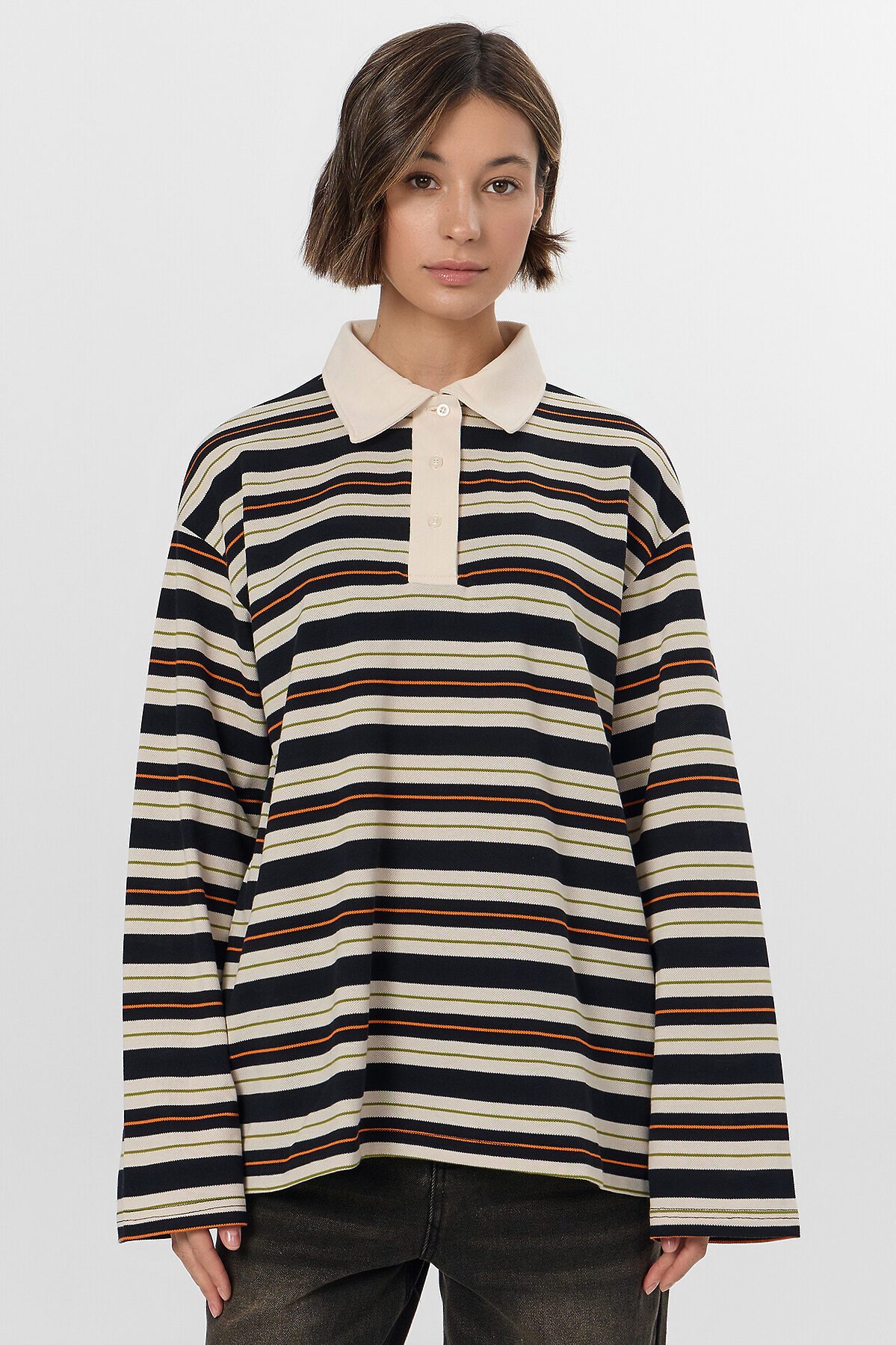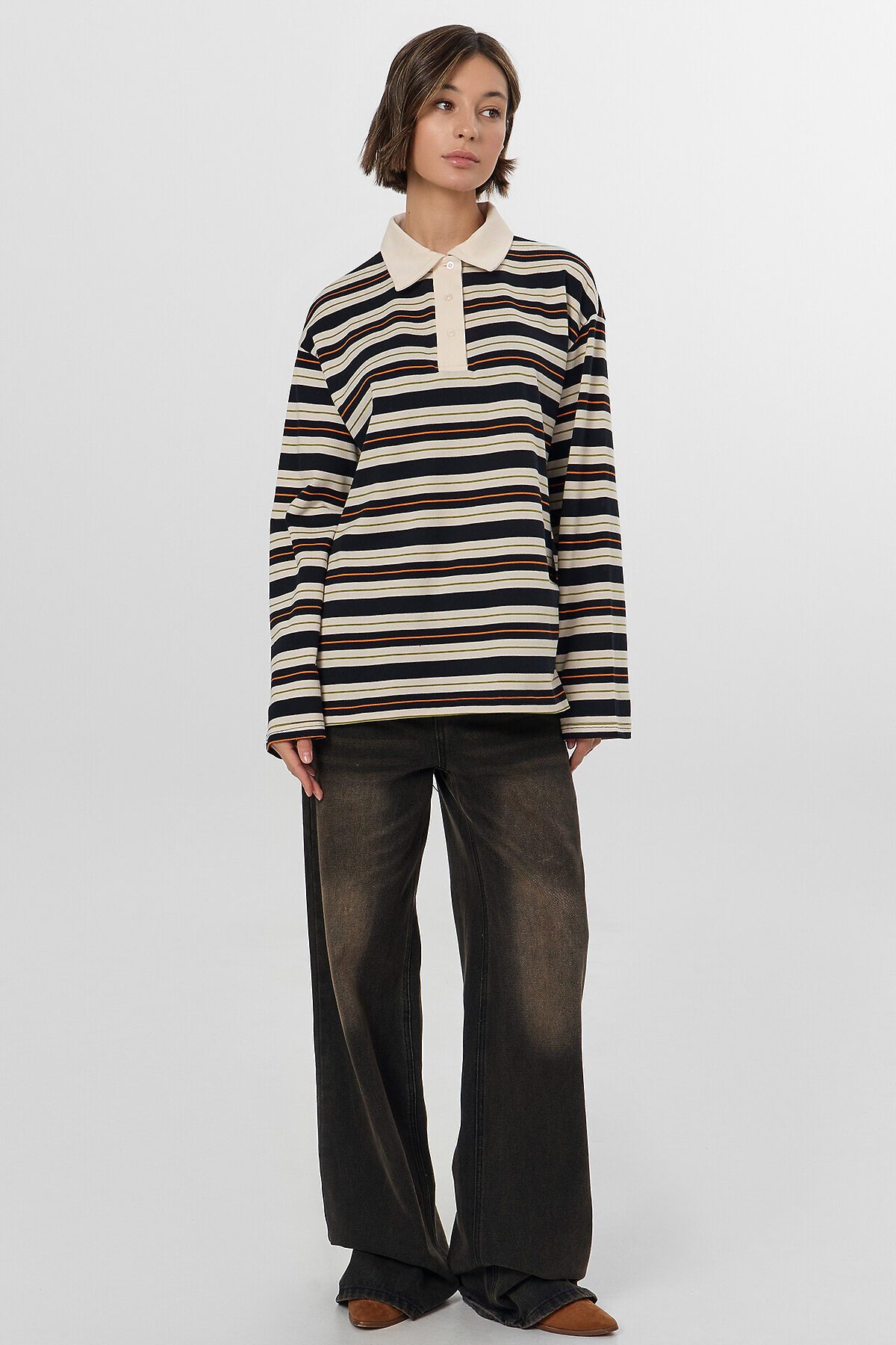 Поло прямое, свободное. Рукава втачные длинные, плечо спущено. Перед с застежкой "поло". Верхняя планка отрезная. Застежка на 3 петли и пуговицы (D 10мм). Воротник из основного полотна. Шов втачивания воротника закрыт бейкой из основного полотна. Низ поло и рукавов обработан швом вподгибку.