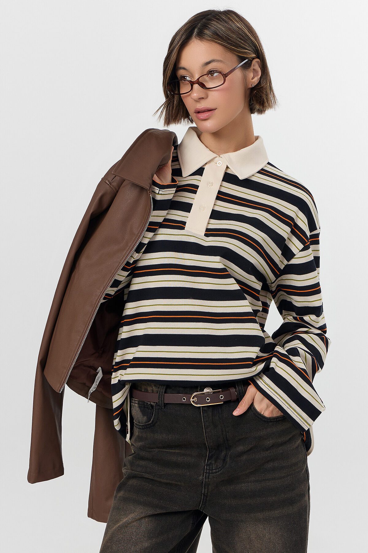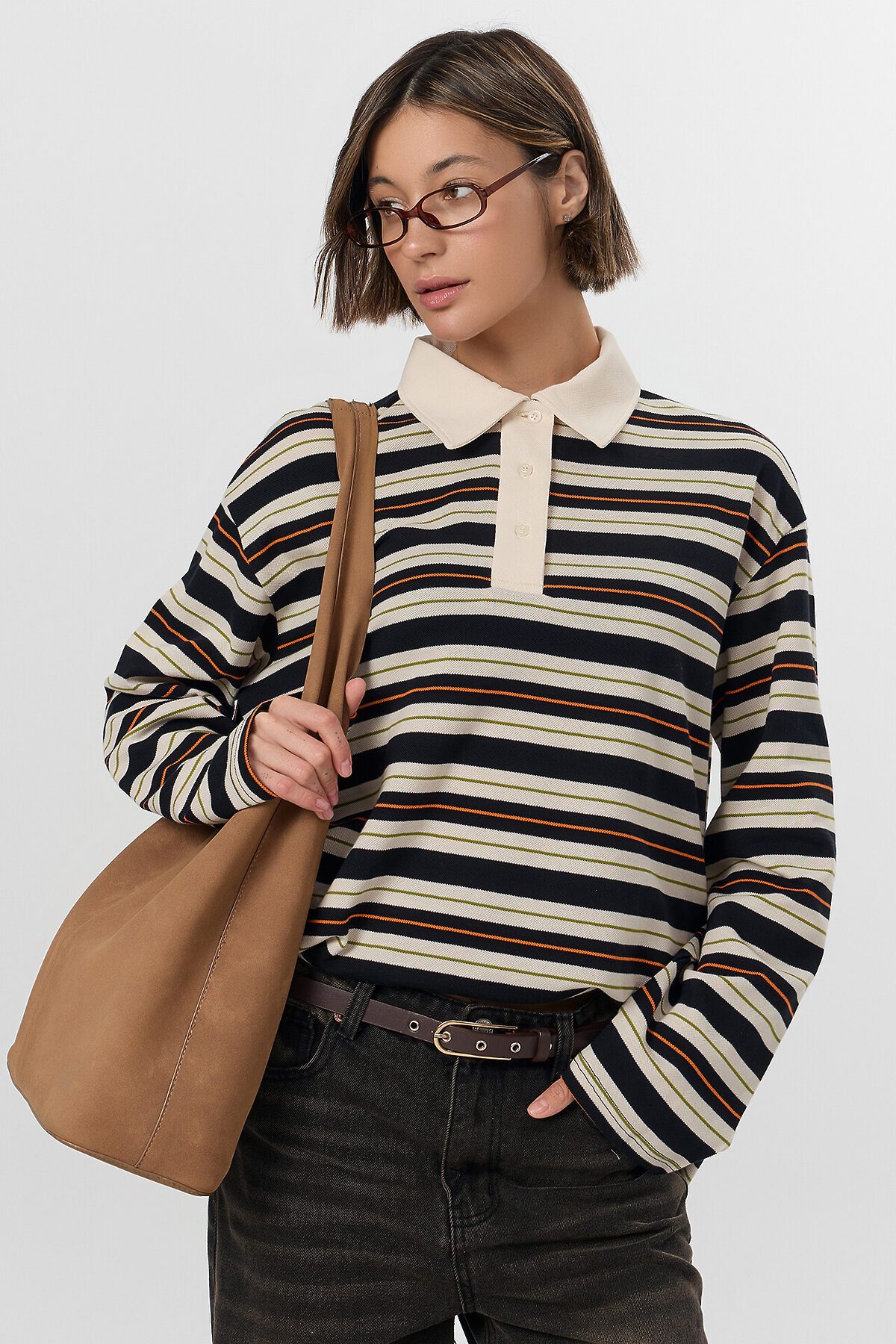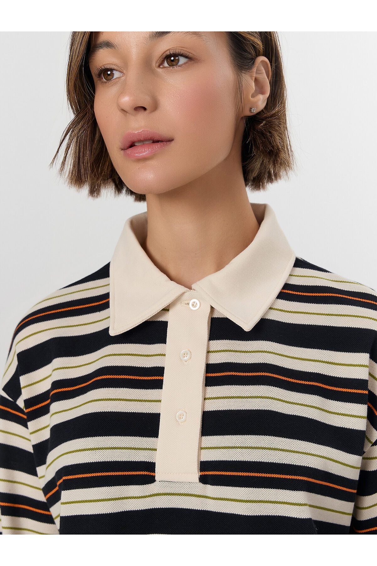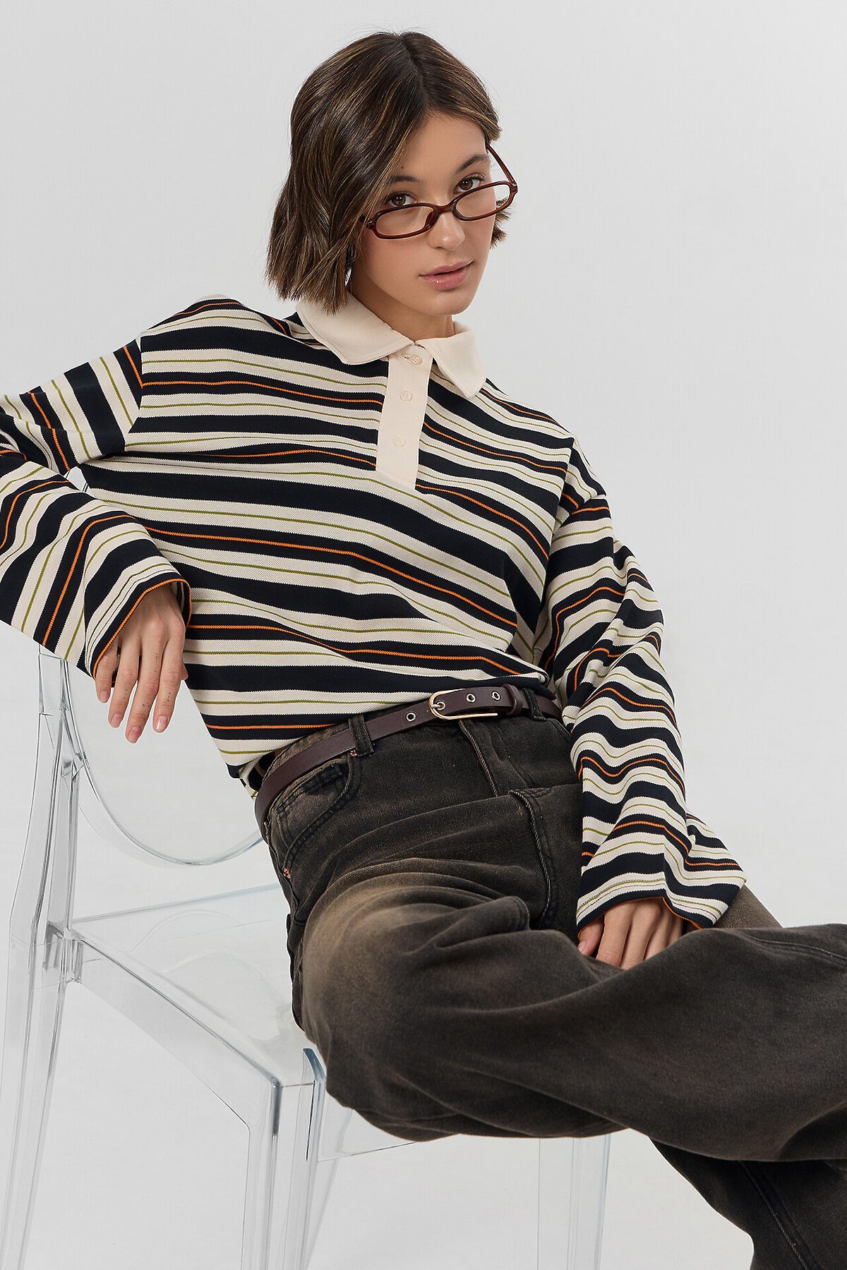 Поло прямое, свободное. Рукава втачные длинные, плечо спущено. Перед с застежкой "поло". Верхняя планка отрезная. Застежка на 3 петли и пуговицы (D 10мм). Воротник из основного полотна. Шов втачивания воротника закрыт бейкой из основного полотна. Низ поло и рукавов обработан швом вподгибку.