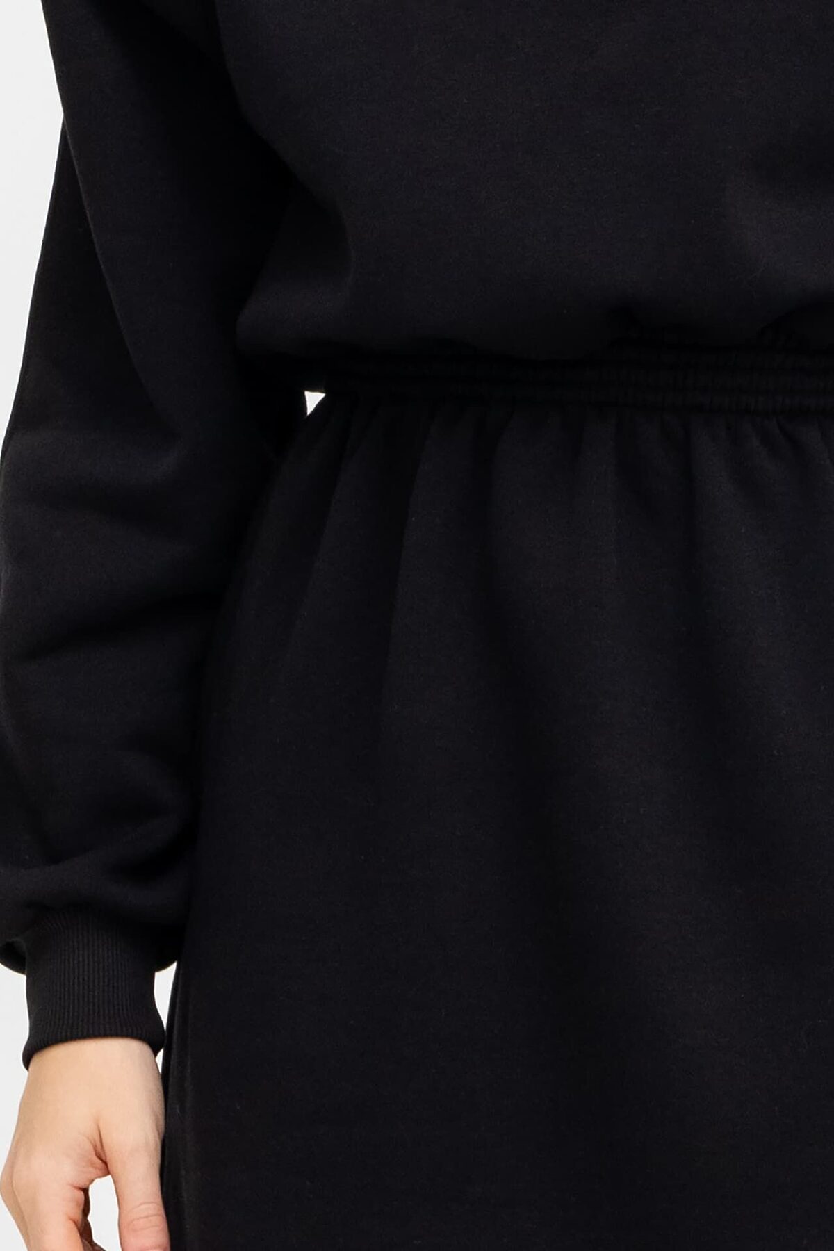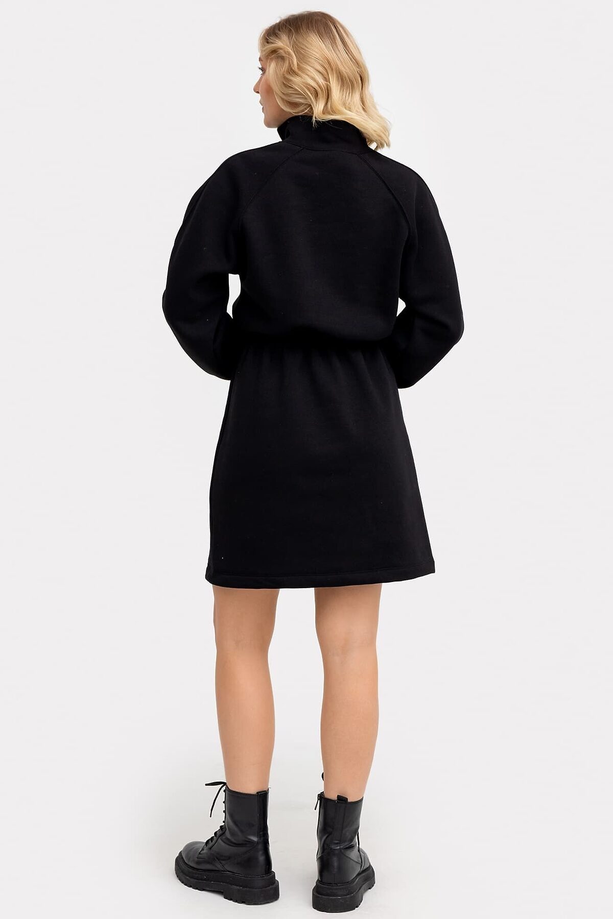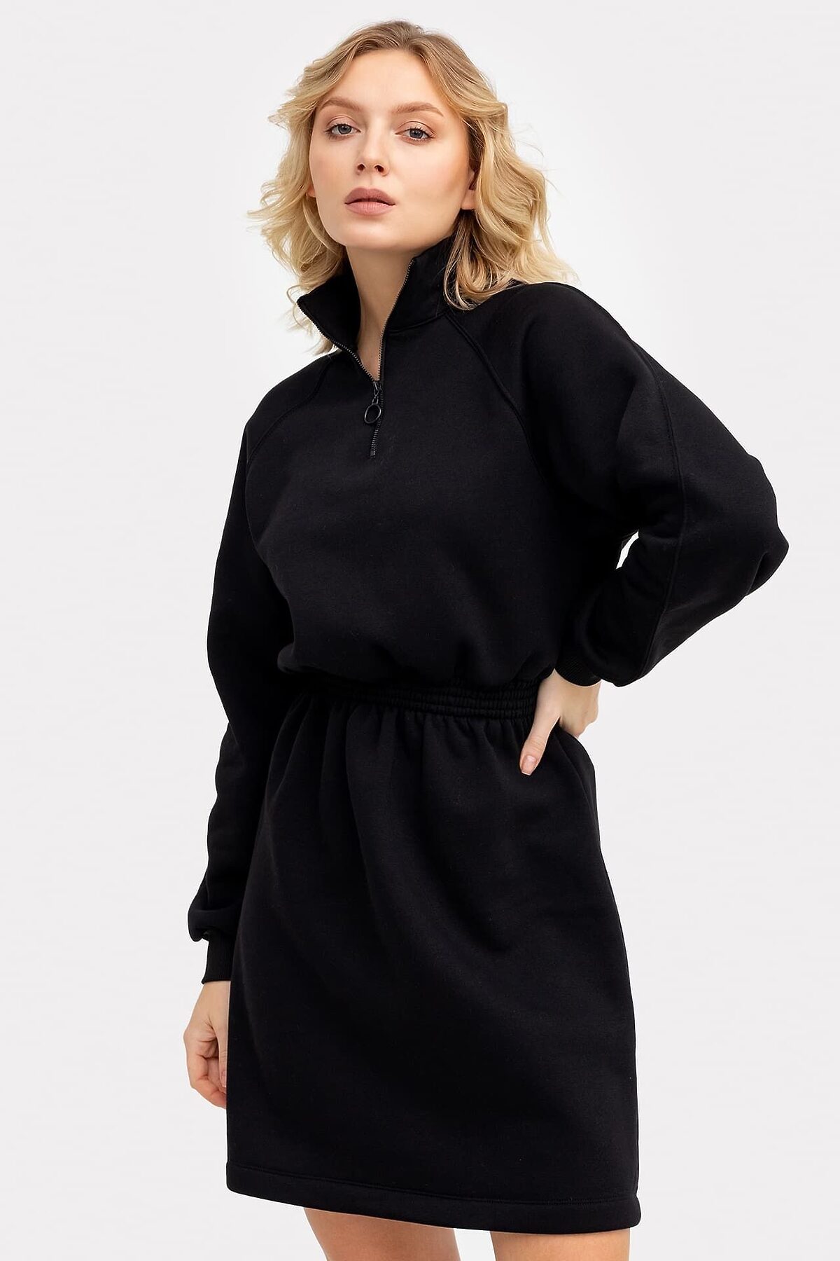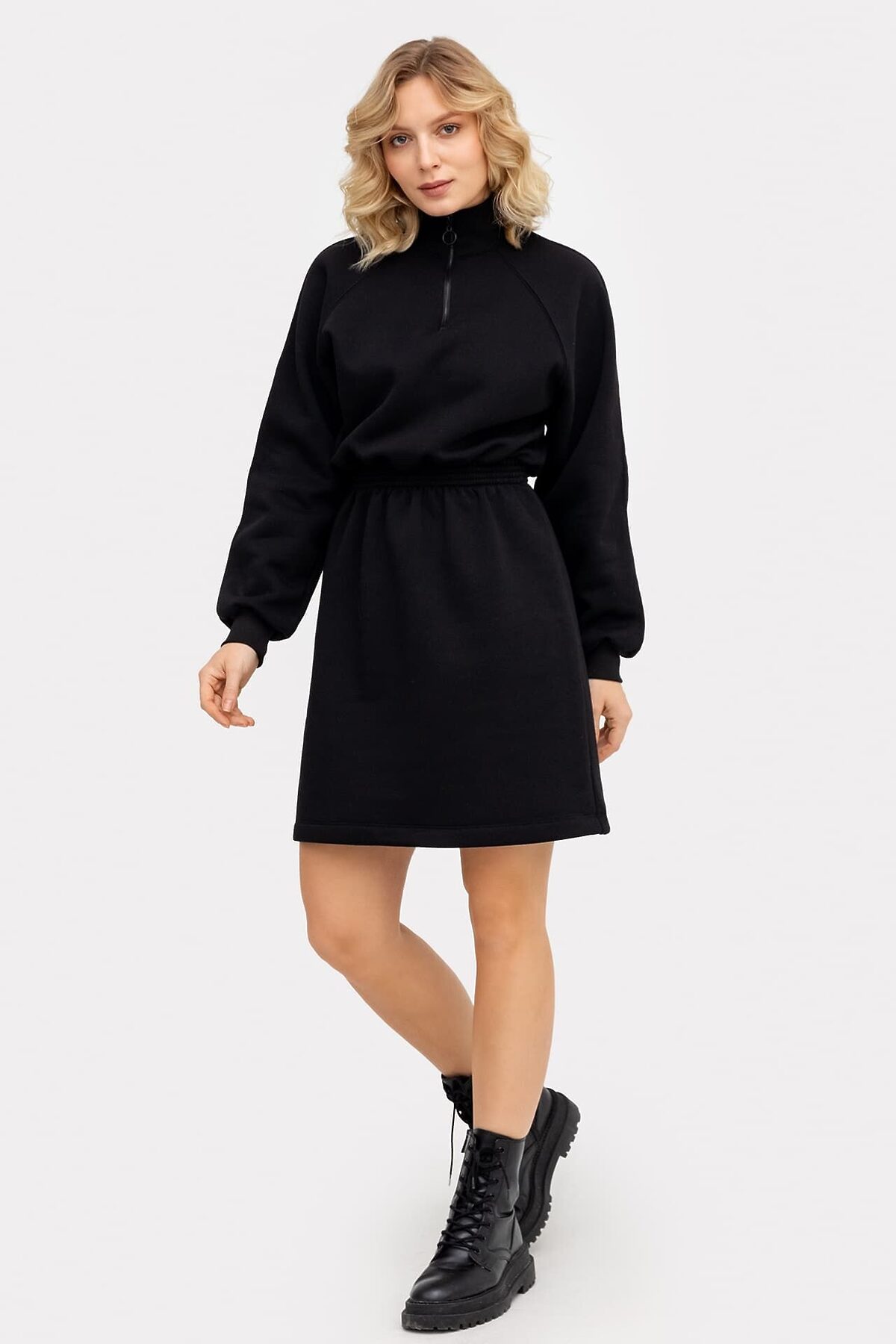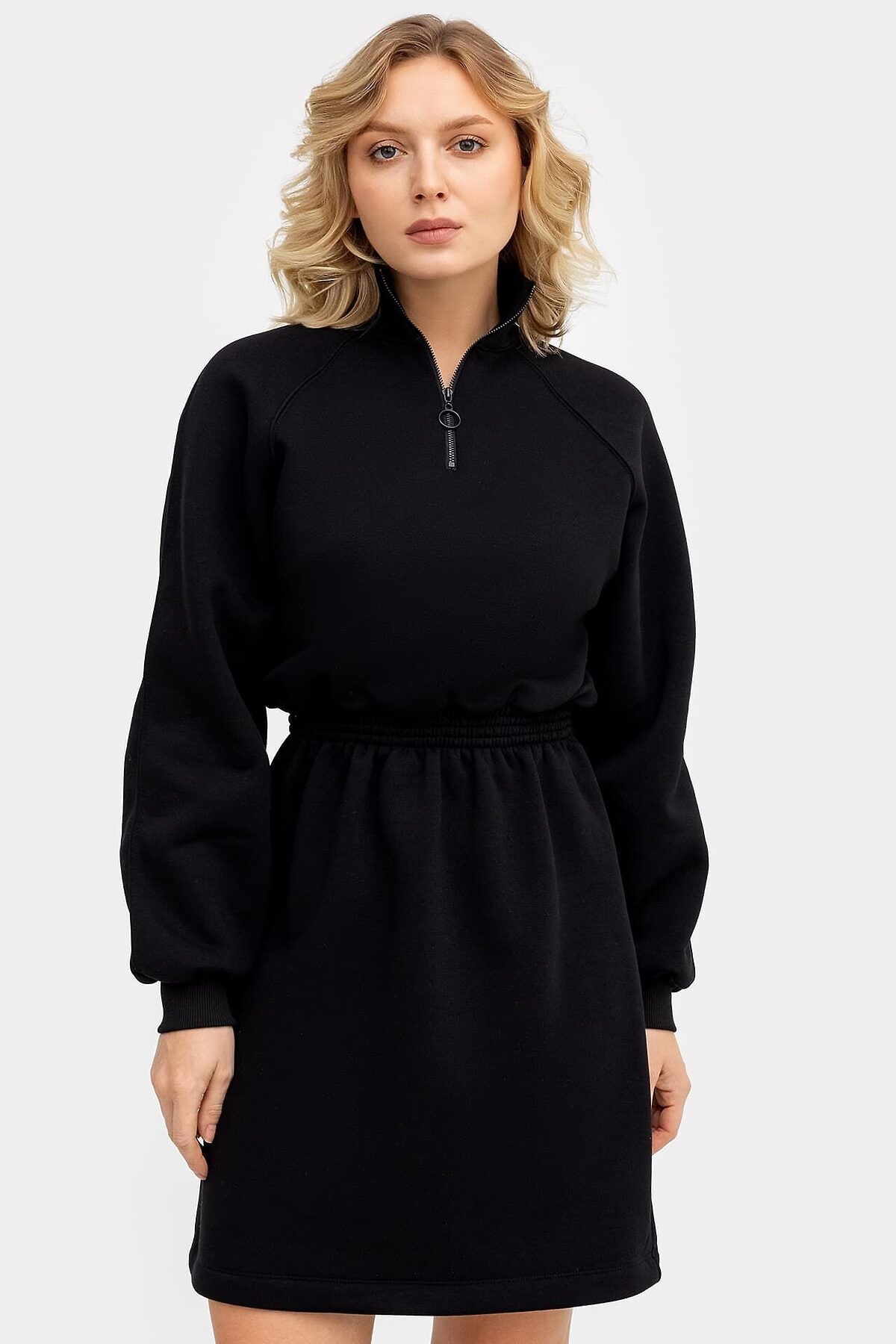 Стильное женское платье длины мини из нежного и приятного к телу трикотажного футера. Силуэт свободный, вырез круглый, с воротником-стойкой. Рукава длинные и объемные, на манжетах. По шее проходит вертикальная застежка-молния. Эластичная тесьма в поясе с декоративными строчками акцентирует внимание на талии.