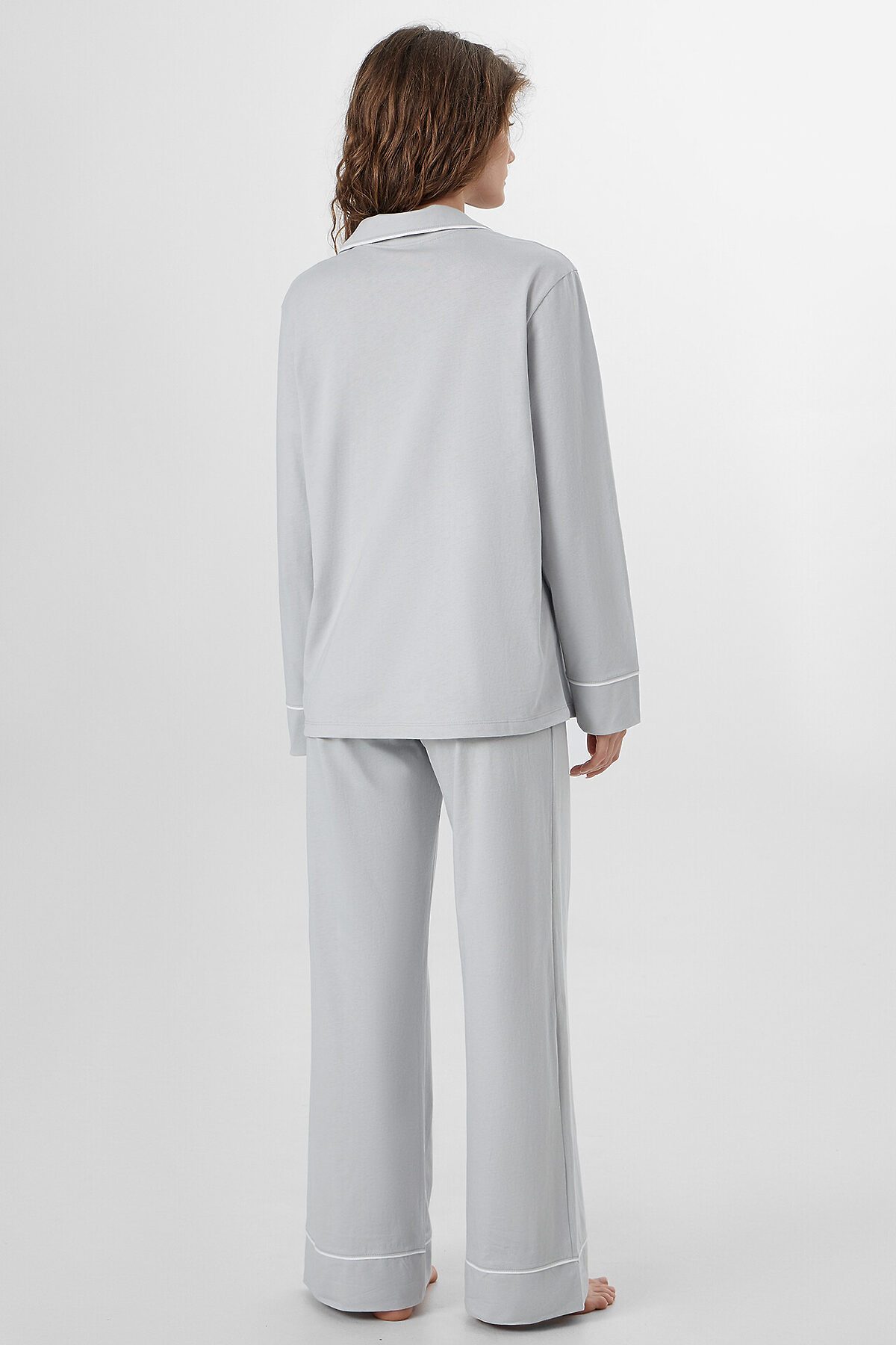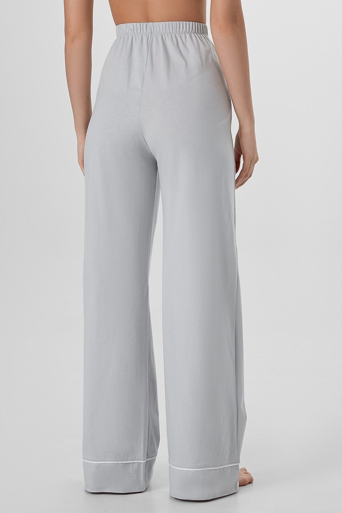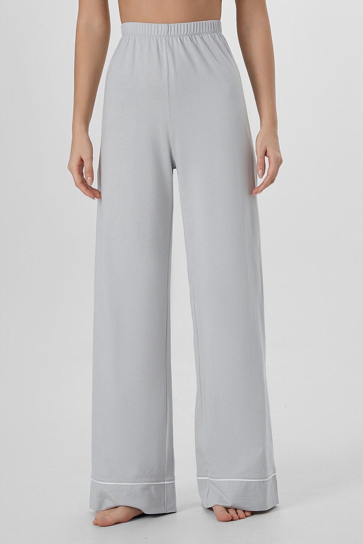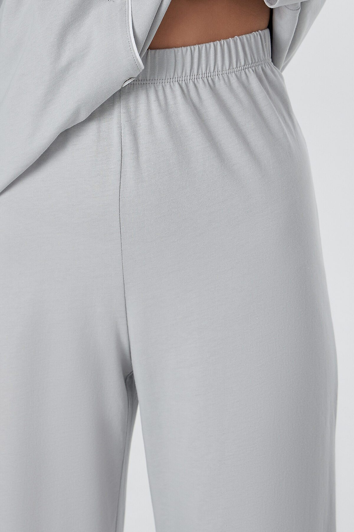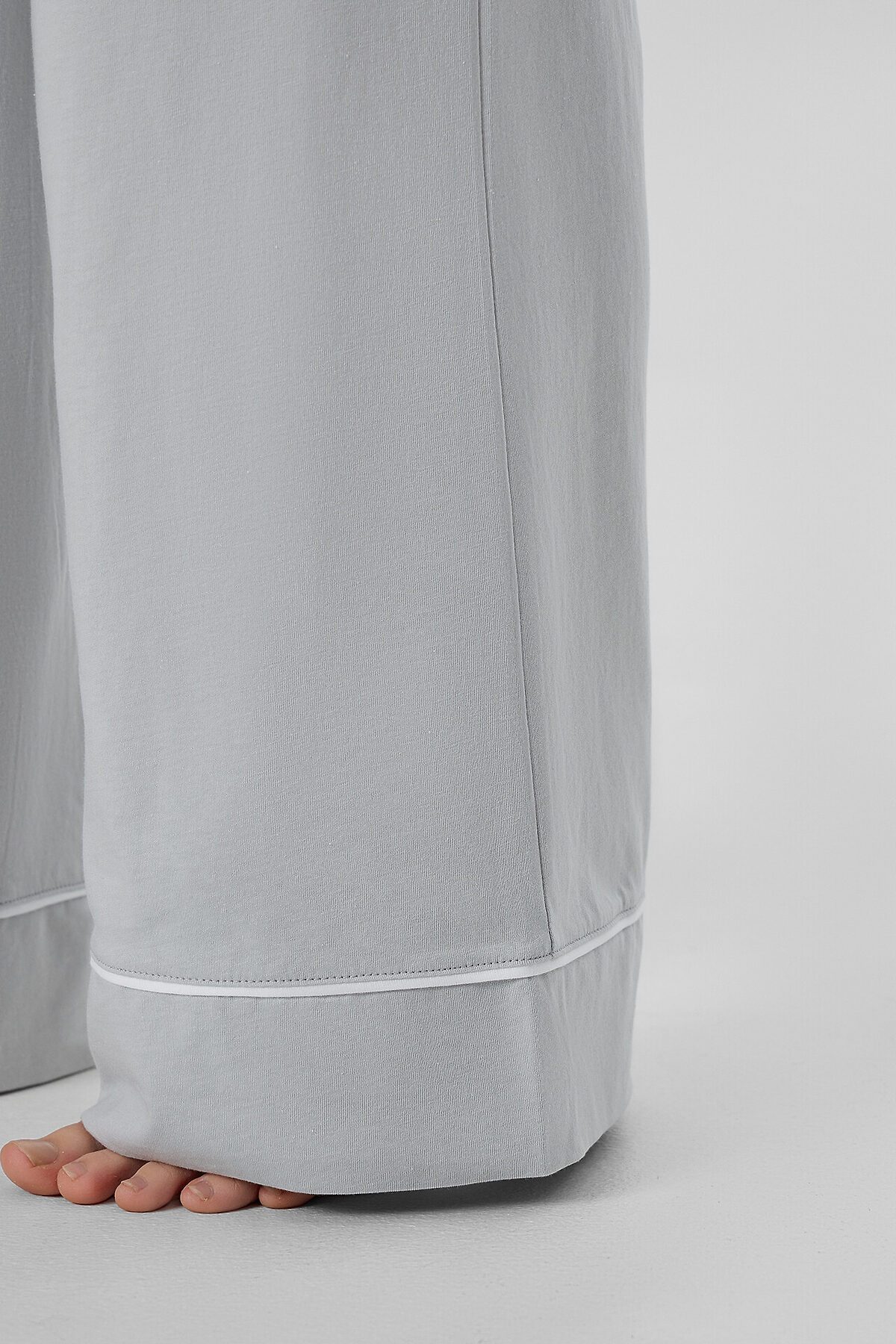 Жакет прямого силуэта. Горловина V-образной формы с отложным воротником и лацканами. По переду обработана центральная застежка на петли и пуговицы. Край борта и воротника оформлен кантом. Рукава втачные длинные, низ рукавов с отрезными манжетами и кантами. На левой половинке переда накладной карман (по заданию). Нижний срез жакета обработан швом вподгибку. Брюки прямые, свободные. Посадка средняя. Пояс цельнокроеный с эластичной тесьмой внутри (внутр. 30мм 30RV). По низу брюк отрезные манжеты с кантами.