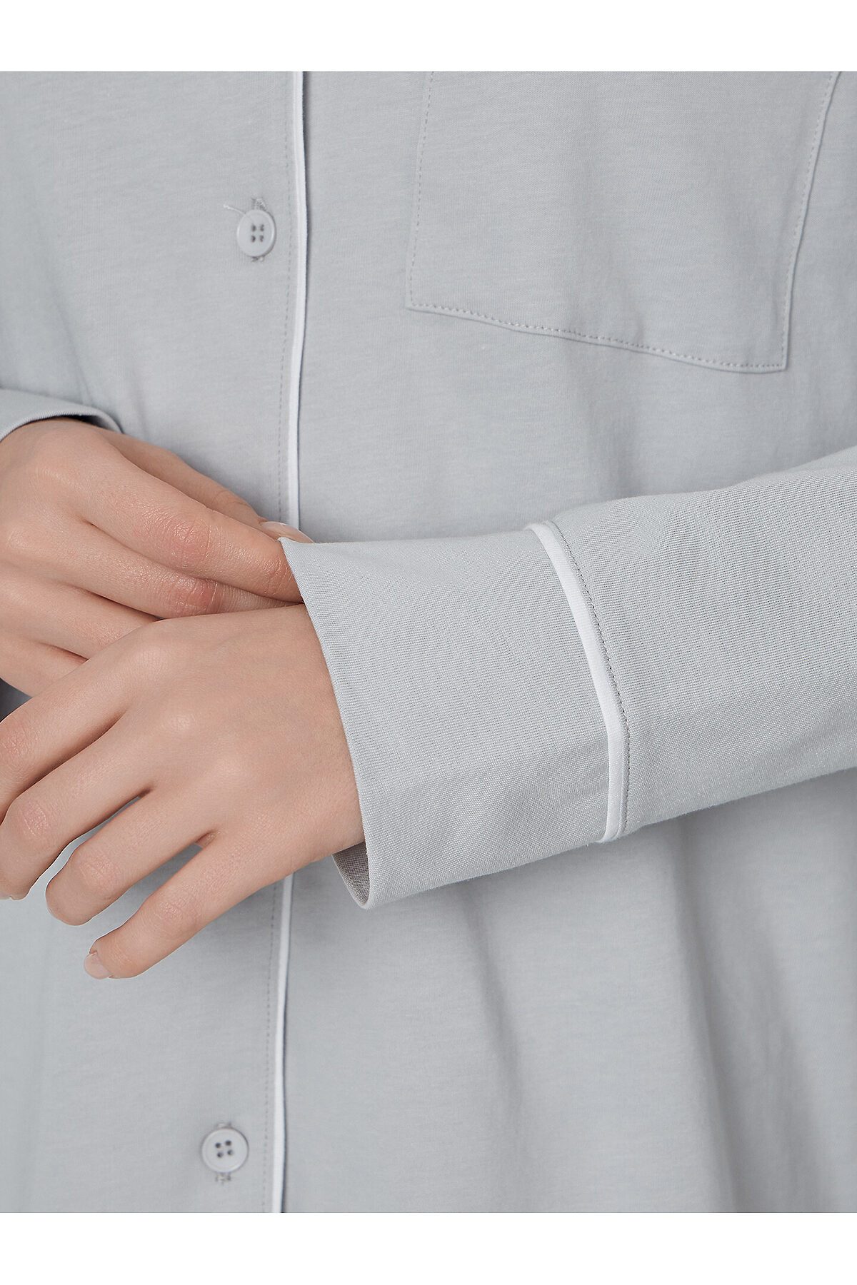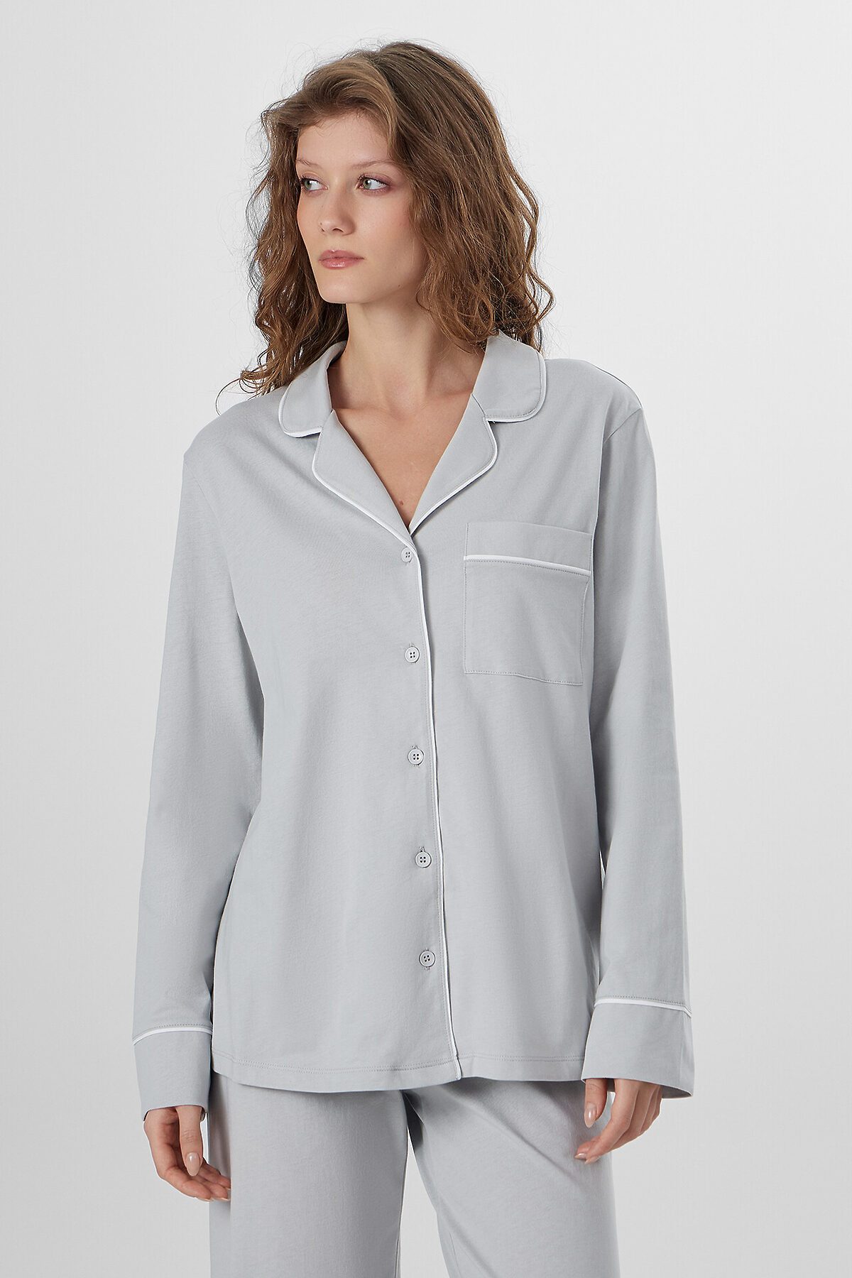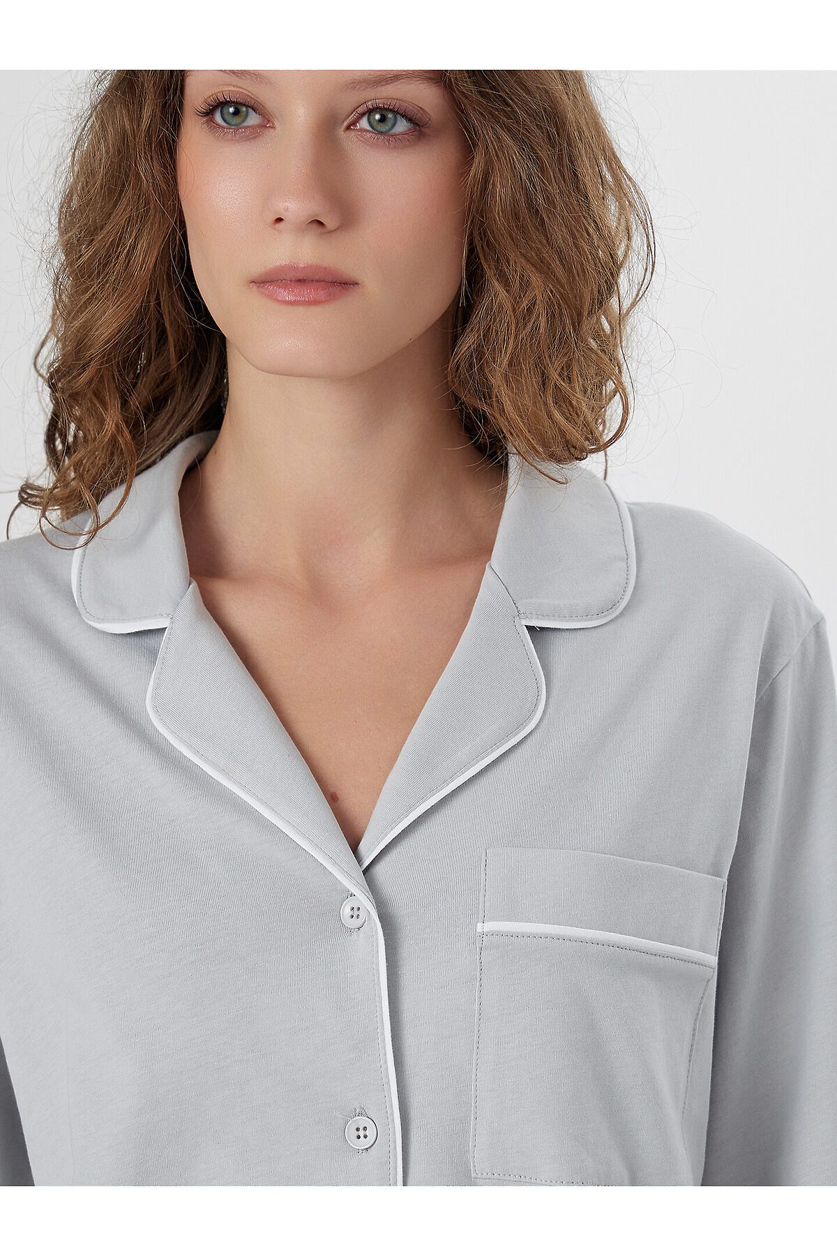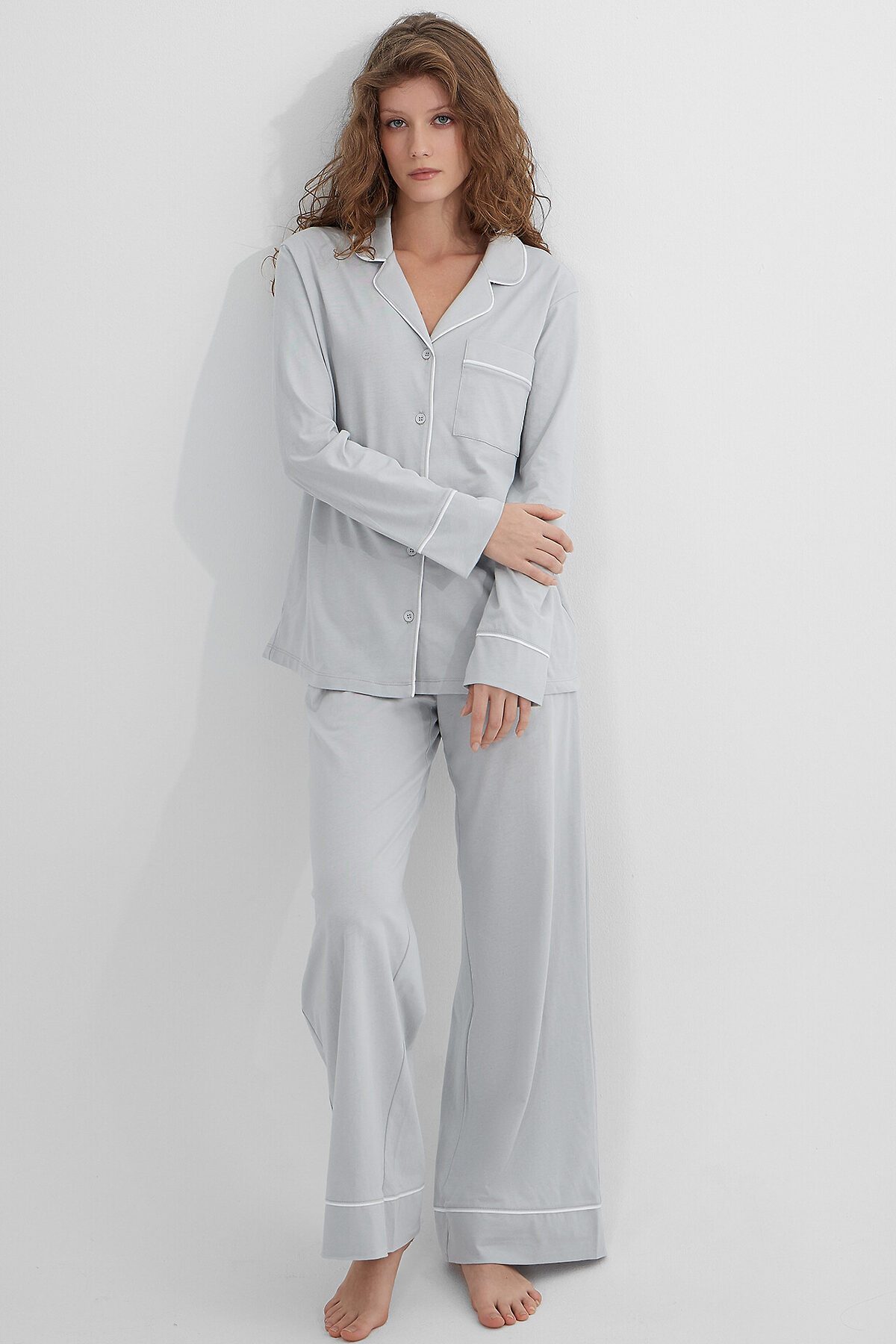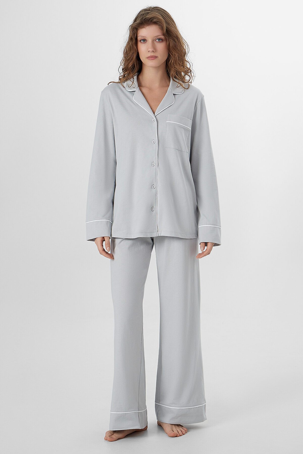 Жакет прямого силуэта. Горловина V-образной формы с отложным воротником и лацканами. По переду обработана центральная застежка на петли и пуговицы. Край борта и воротника оформлен кантом. Рукава втачные длинные, низ рукавов с отрезными манжетами и кантами. На левой половинке переда накладной карман (по заданию). Нижний срез жакета обработан швом вподгибку. Брюки прямые, свободные. Посадка средняя. Пояс цельнокроеный с эластичной тесьмой внутри (внутр. 30мм 30RV). По низу брюк отрезные манжеты с кантами.