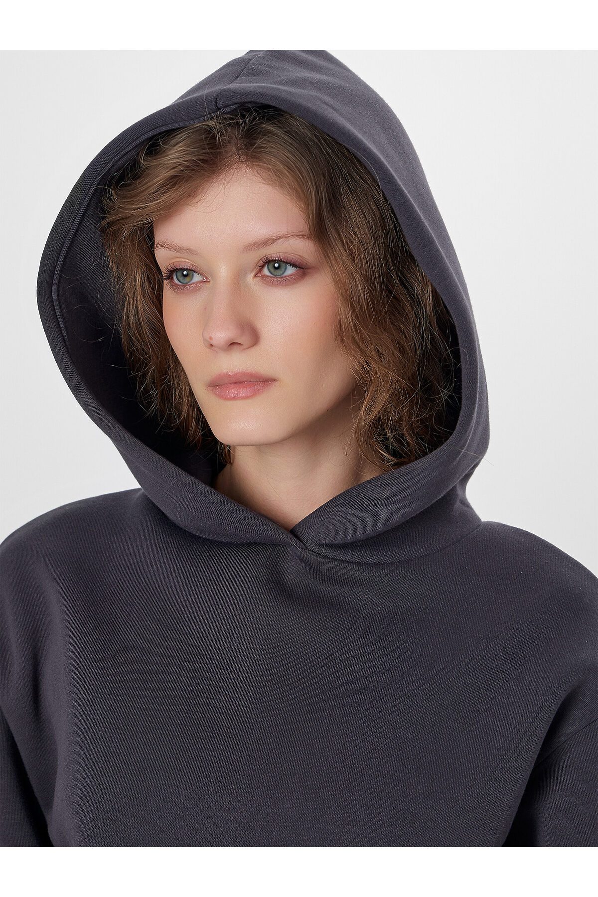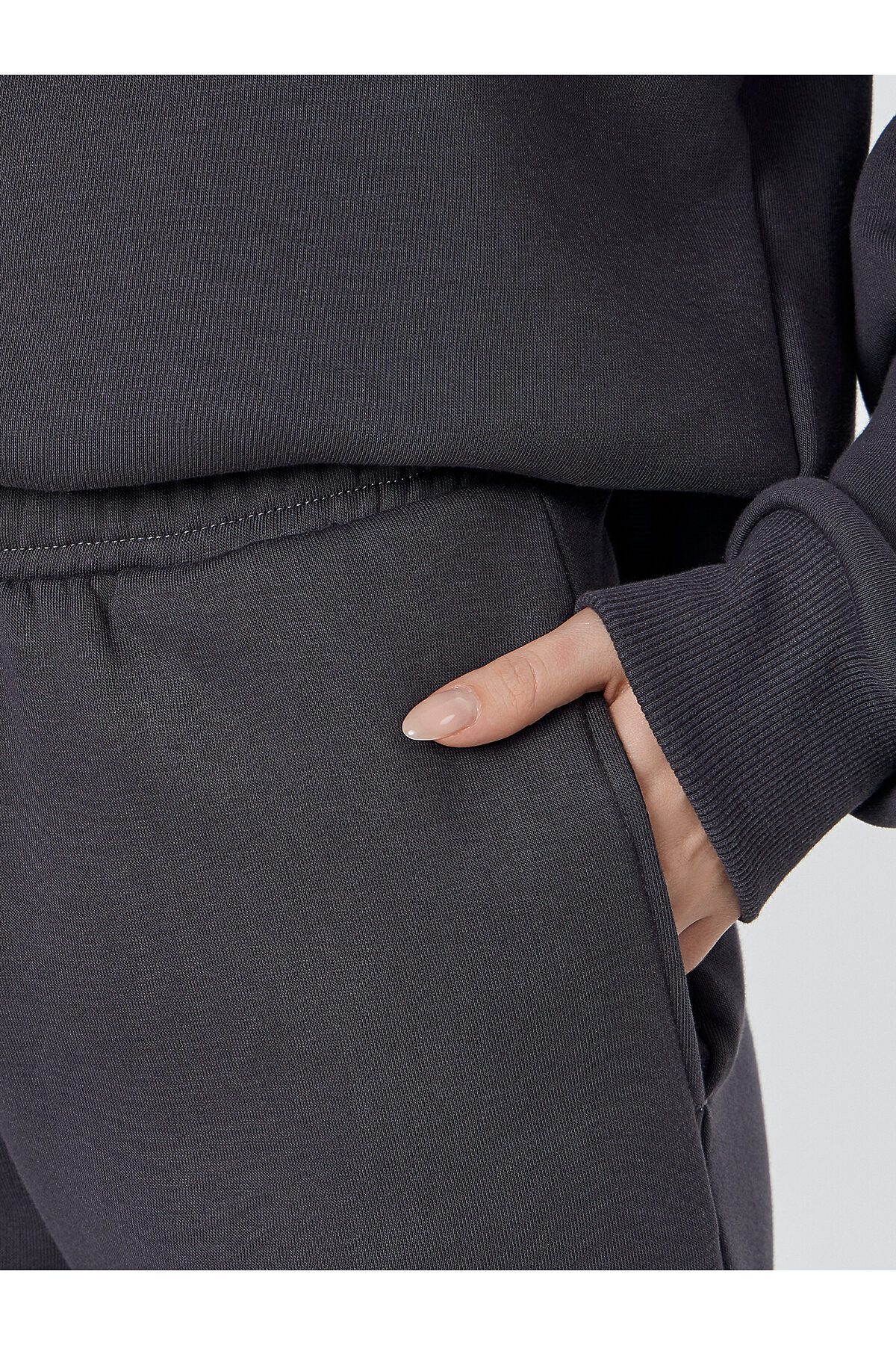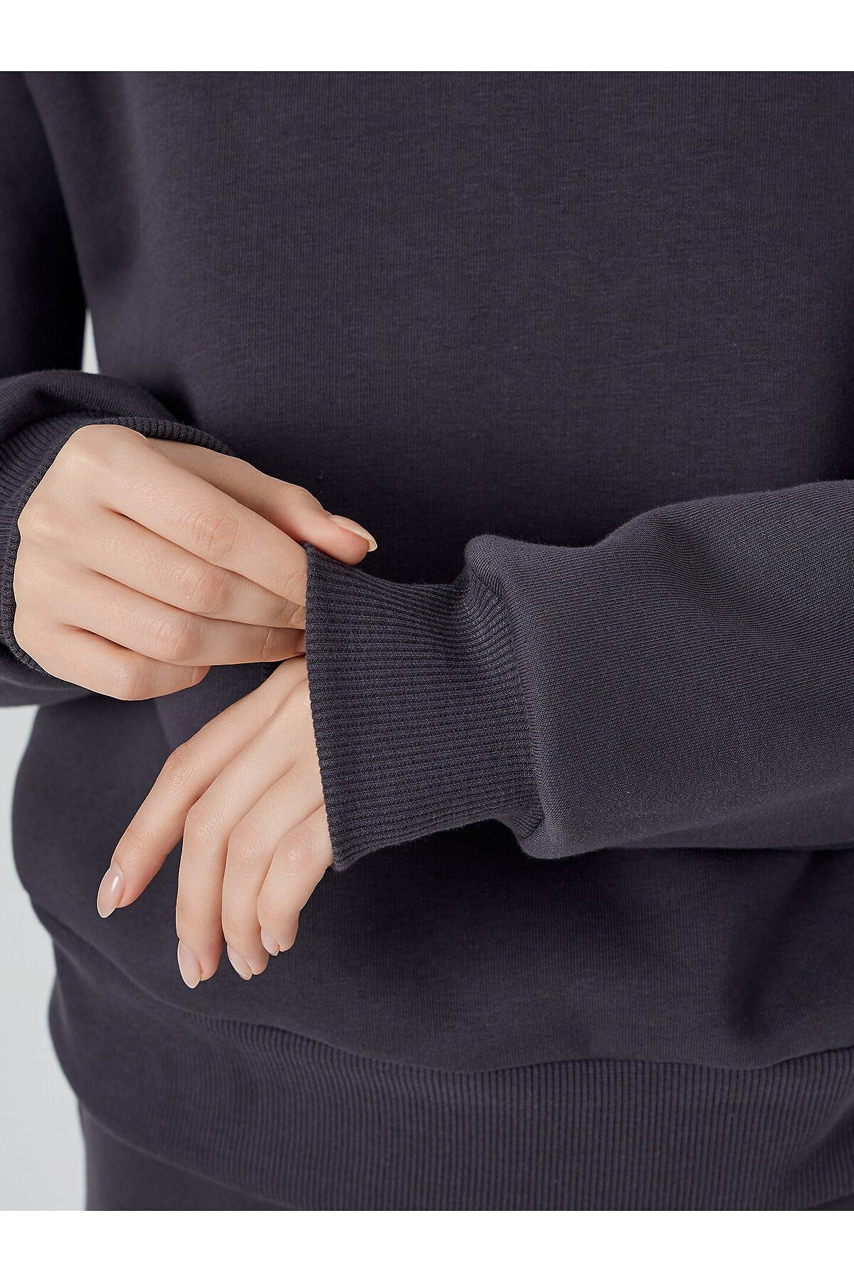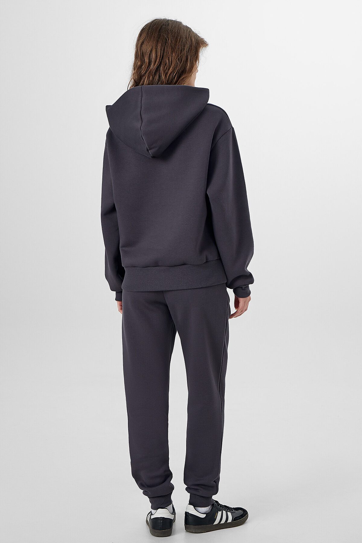Комплект выполнен из трикотажного полотна футер. Анорак прямого силуэта, укороченный. Горловина округлой формы. Капюшон одношовный, цельнокроеный с подкладкой. Рукава втачные длинные, плечо спущено. Пояс и манжеты отрезные широкие из рибаны Брюки прямые, свободные. Пояс цельнокроеный с эластичной тесьмой внутри. В боковых швах расположены карманы, подкладка из основного полотна. Низ брюк обработан швом в подгибку с эластичной тесьмой внутри.