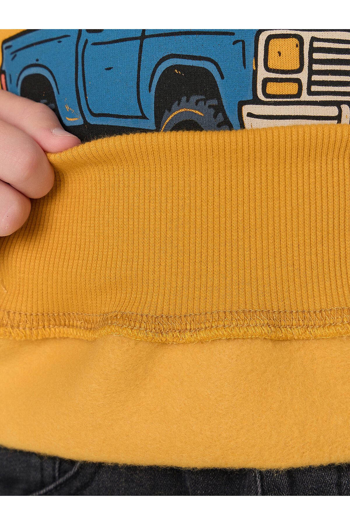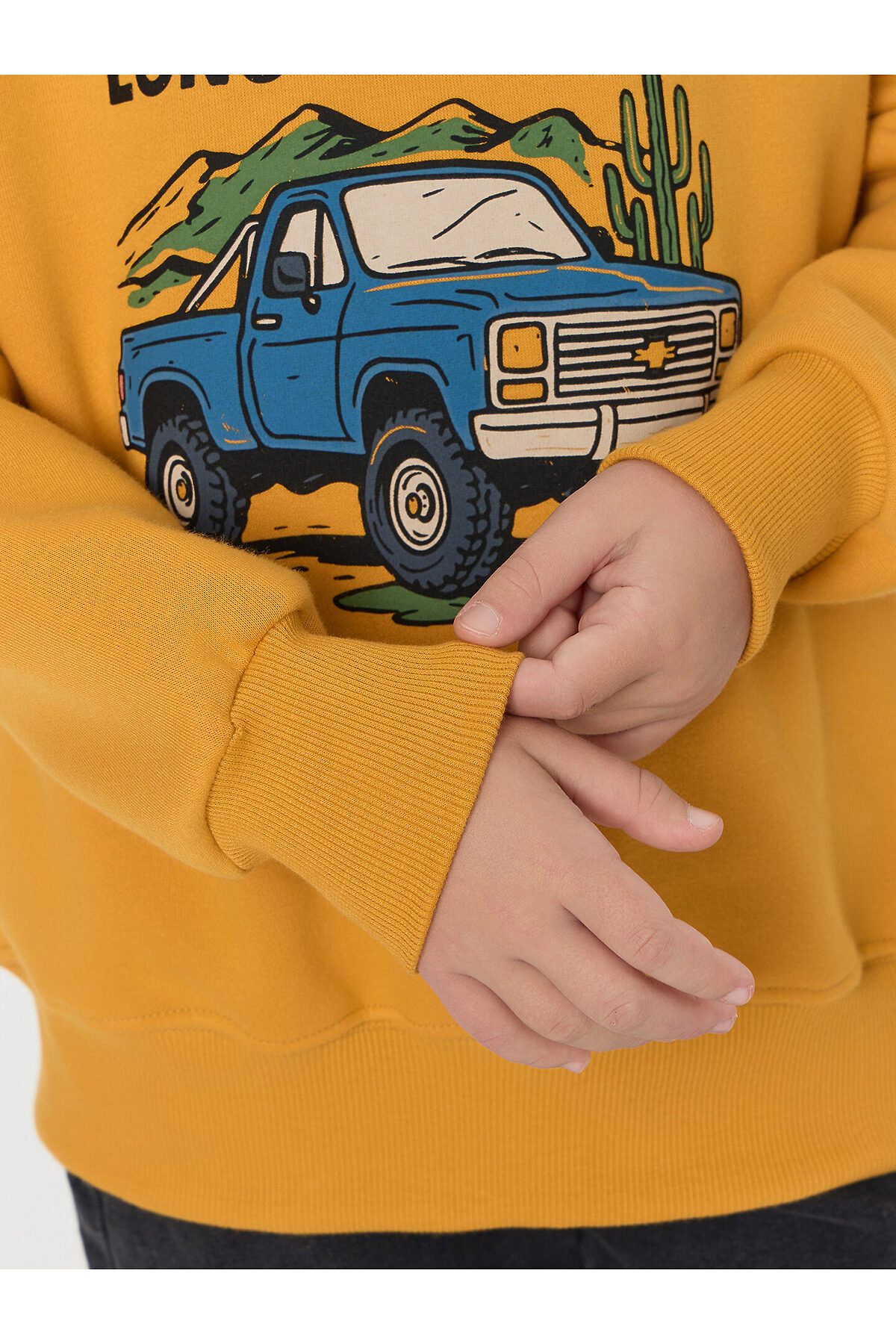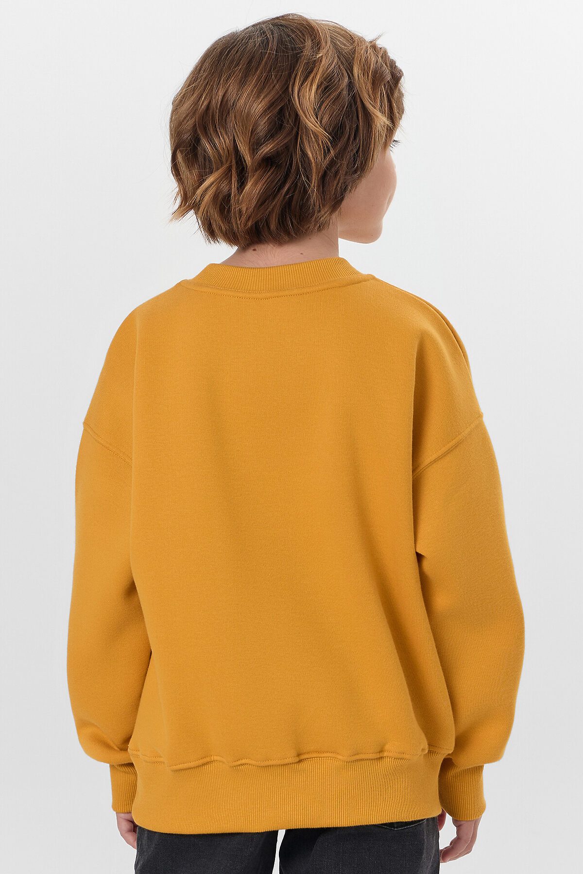 Свитшот свободного силуэта. Рукава длинные, втачные. Линия плеча спущена. По переду декоративное членение. Горловина круглой формы c окантовкой из трикотажного полотна рибаны. Низ рукавов и изделия обработаны трикотажным полотном рибана .