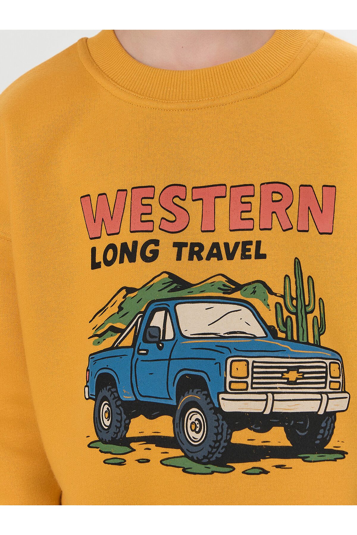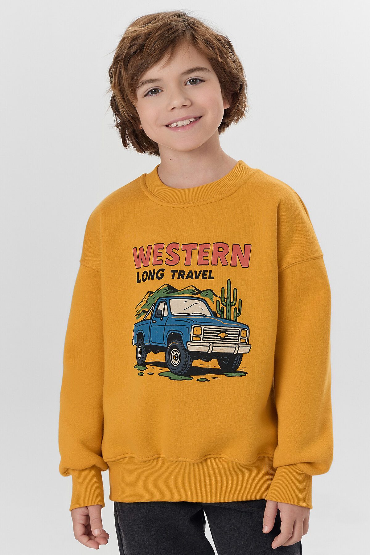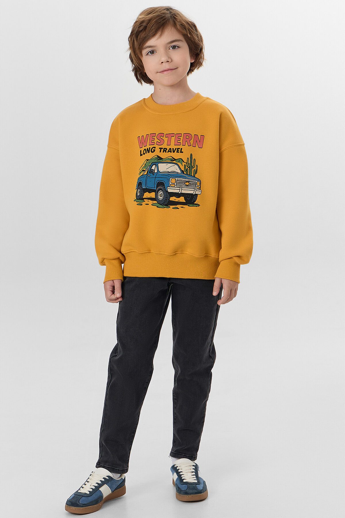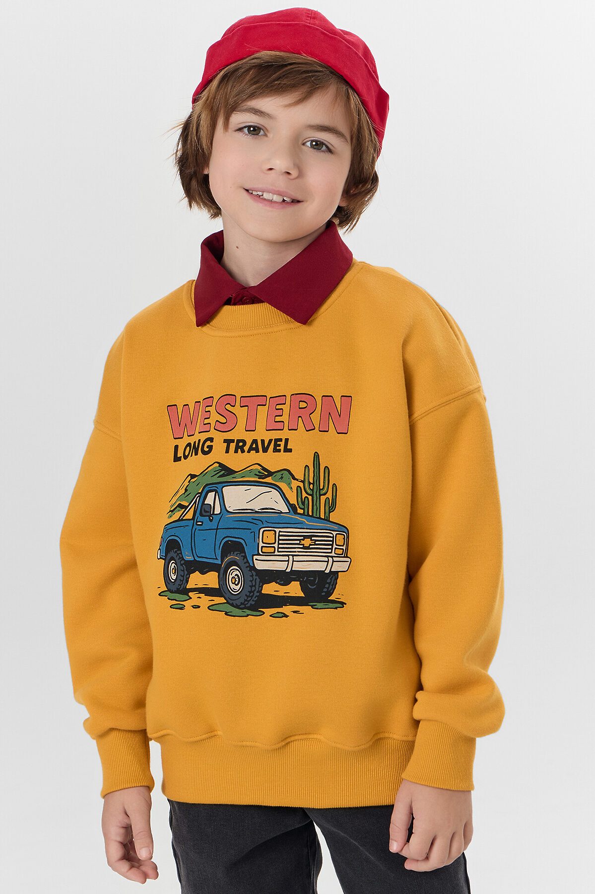Свитшот свободного силуэта. Рукава длинные, втачные. Линия плеча спущена. По переду декоративное членение. Горловина круглой формы c окантовкой из трикотажного полотна рибаны. Низ рукавов и изделия обработаны трикотажным полотном рибана .