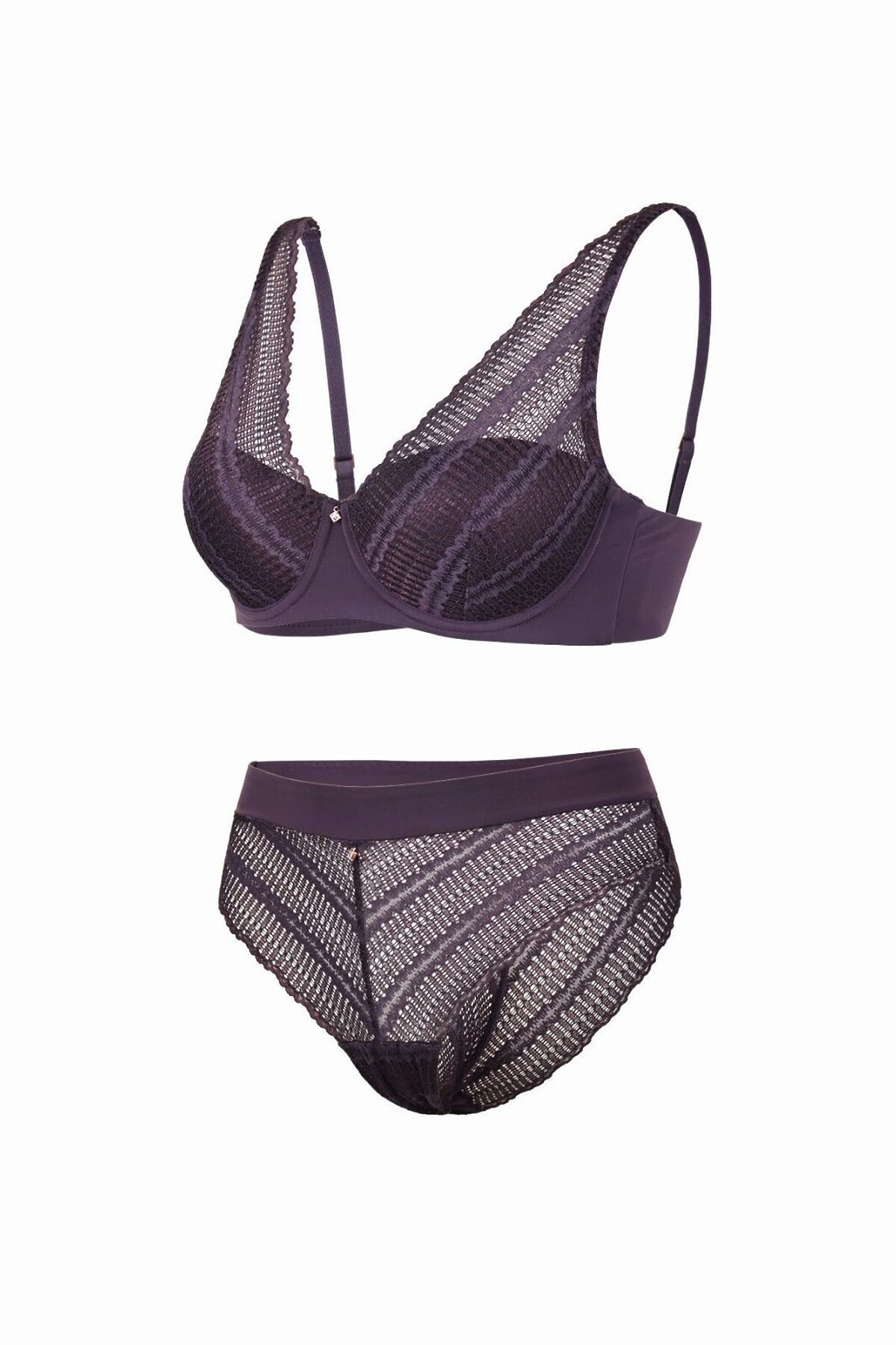 Комплект нижнего белья от торговой марки Индефини. В комплекте бюстгальтер и трусики. Бюстгальтер из полиамида, фиолетового цвета, на косточках, с тонкой поролоновой чашкой, без Push-up, с кружевными вставками и обрамлением, на тонких регулируемых лямках. Трусы-слипы из полиамида, фиолетового цвета, с кружевными вставками и обрамлением, средней посадки, на мягкой резинке. К бюстгальтеру идут трусы слипы, размером: 75B-S, 75C-M, 80B-M, 80C-L, 85B-XL.