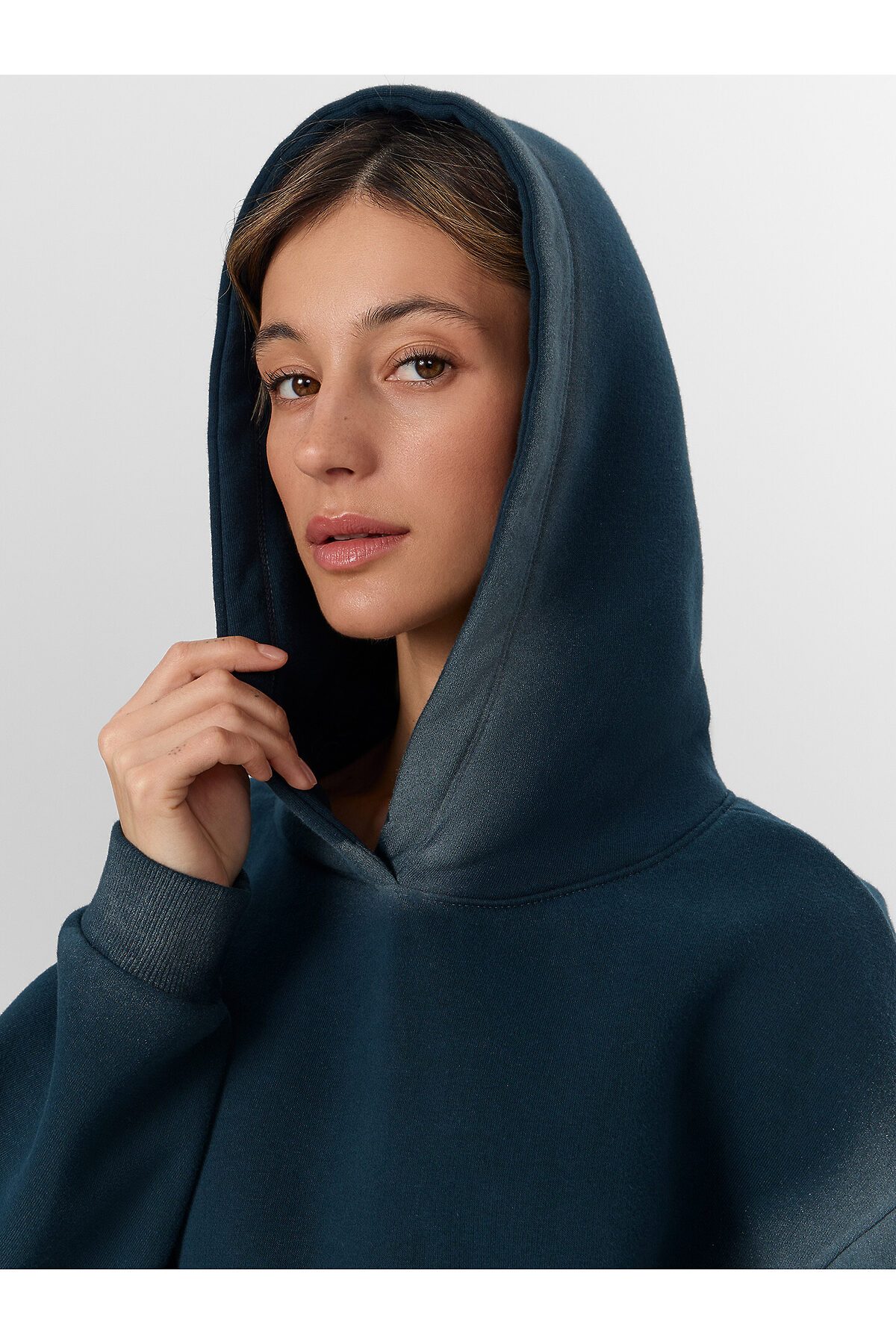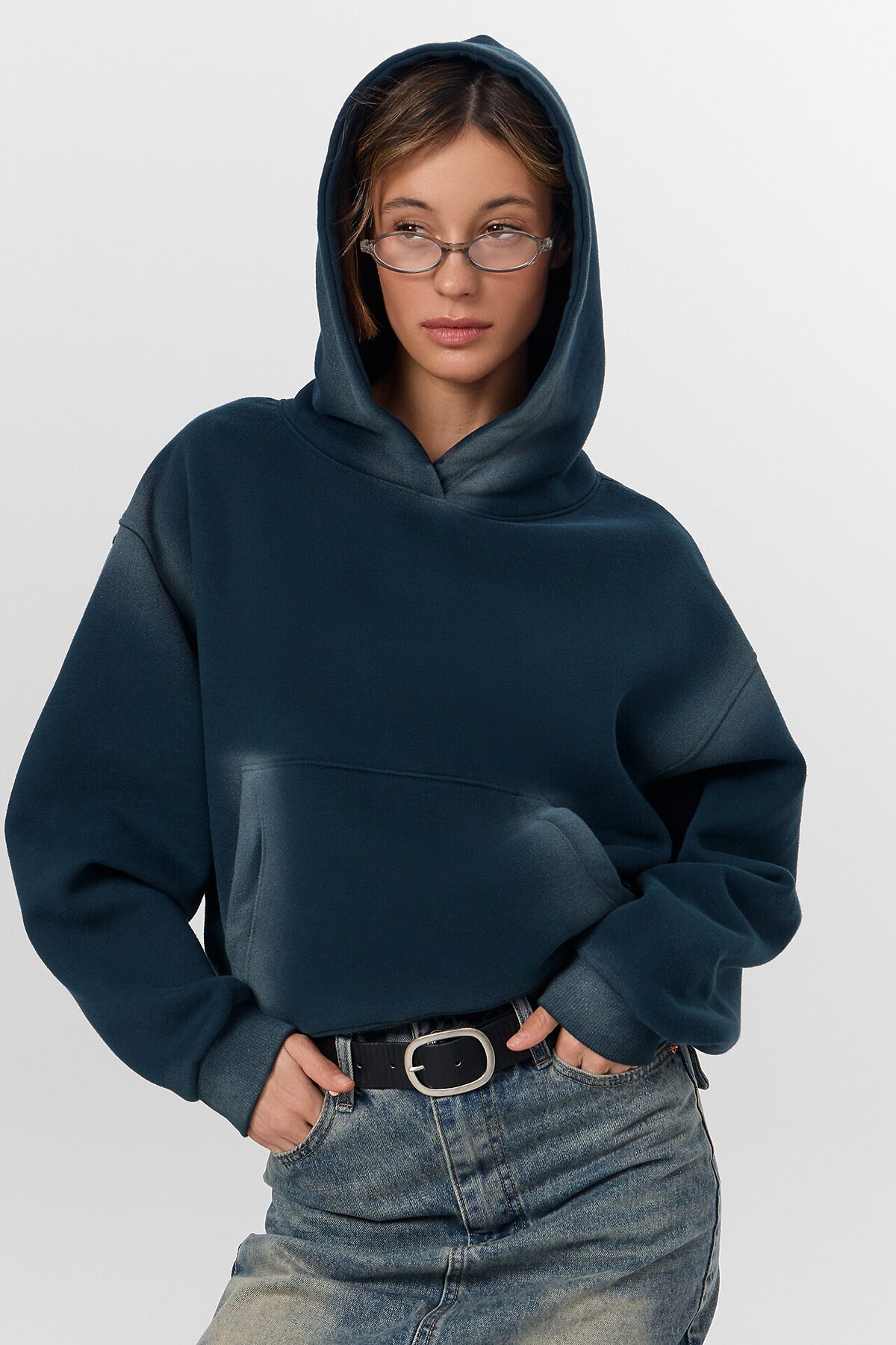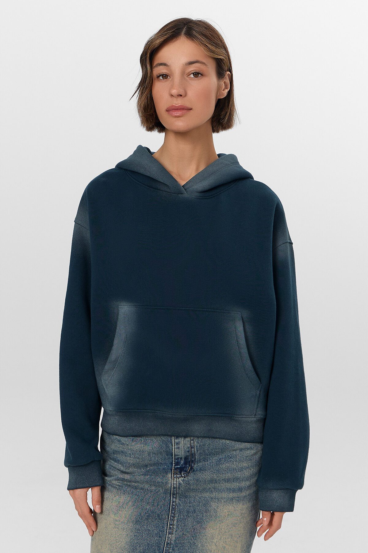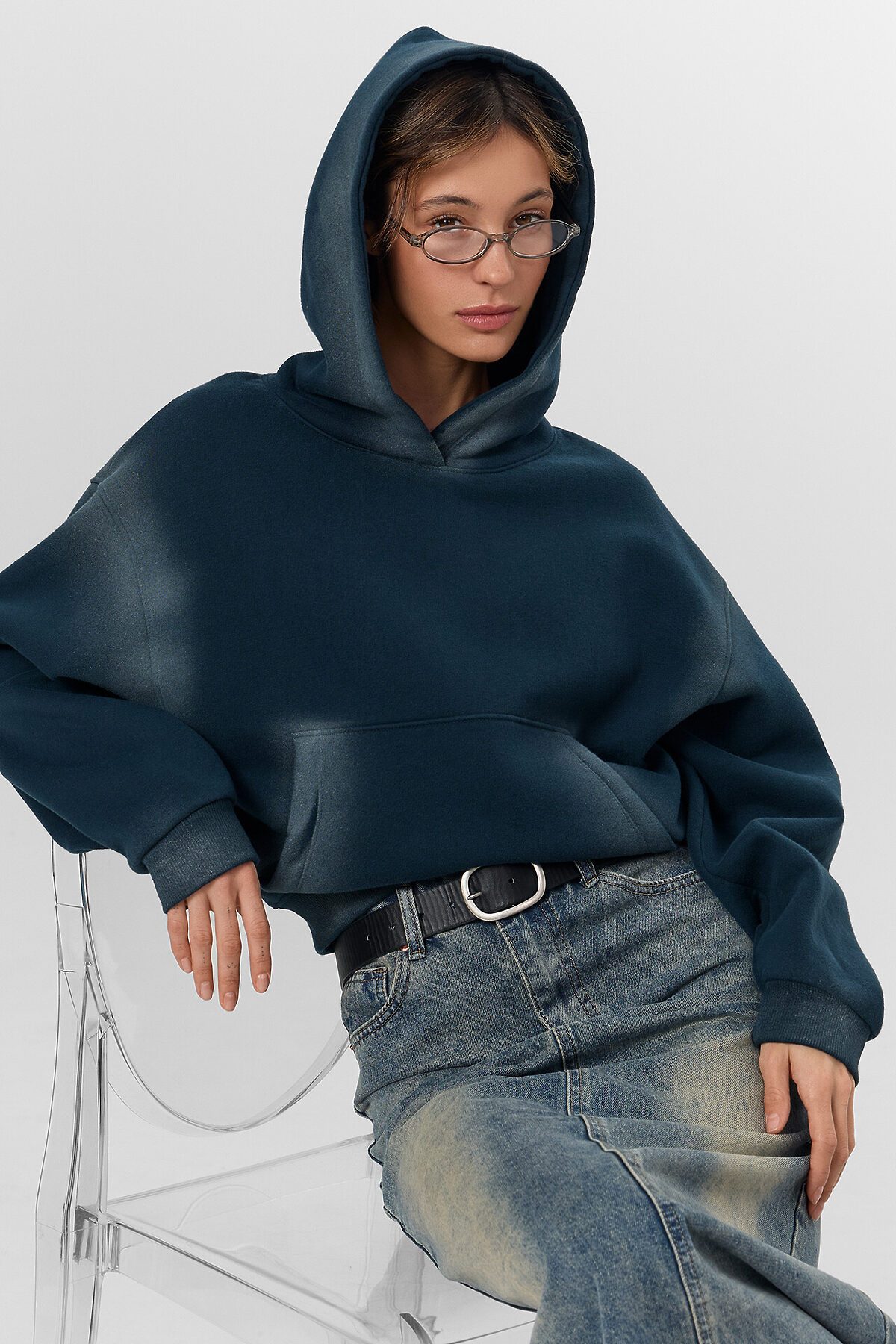 Худи женское свободного силуэта. Перед и спинка цельнокроеные. Рукав втачной, длинный, спущенный. По низу изделия и рукавов пояс и манжеты из рибаны. Худи с капюшоном и накладным карманом спереди. На краях капюшона, кармана, пояса и манжетов потертости с микронадрывами (как декор).
