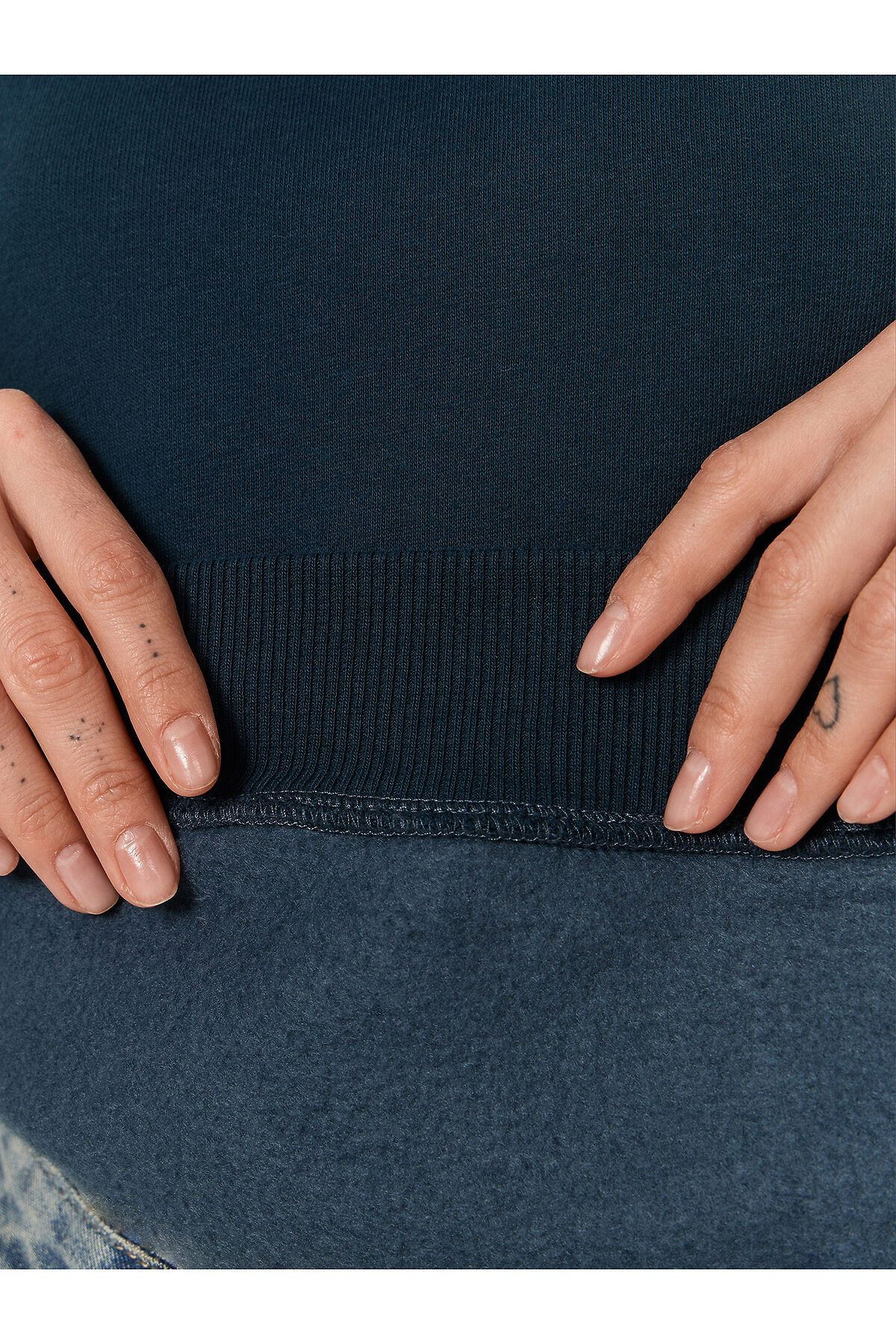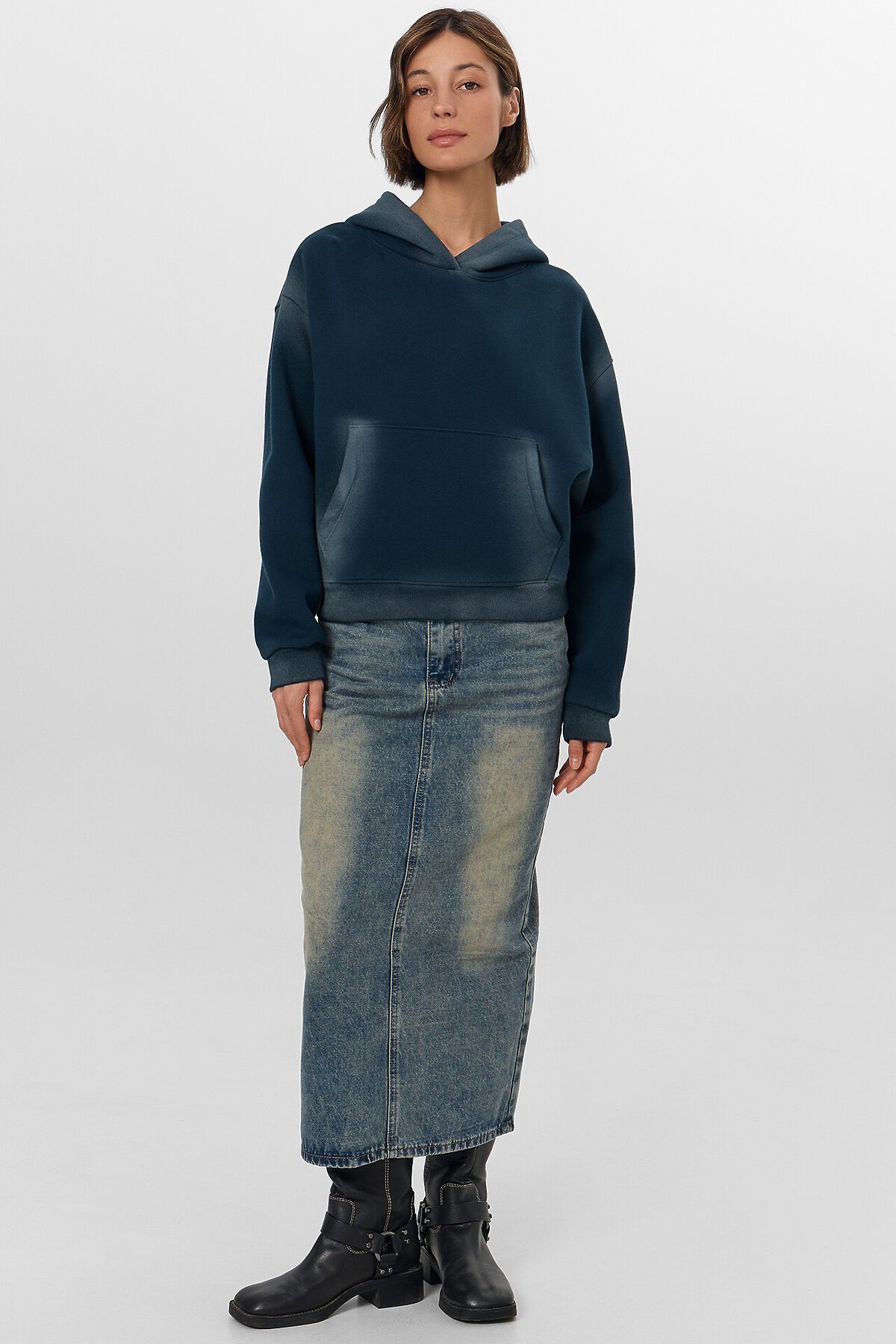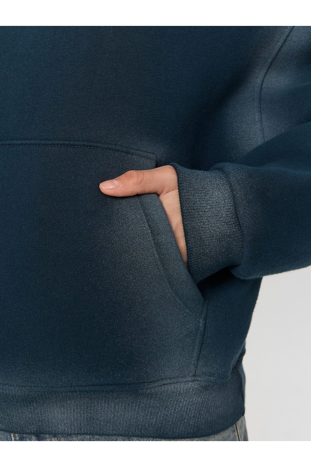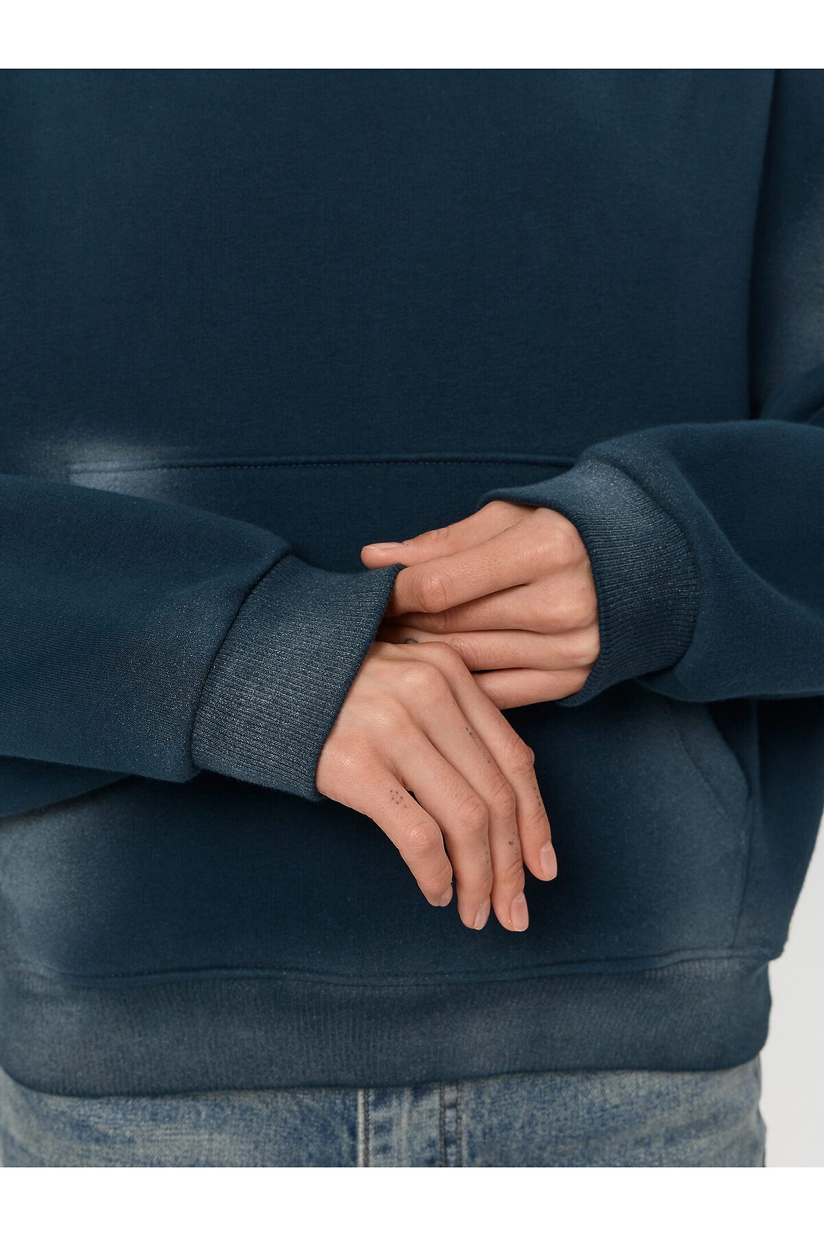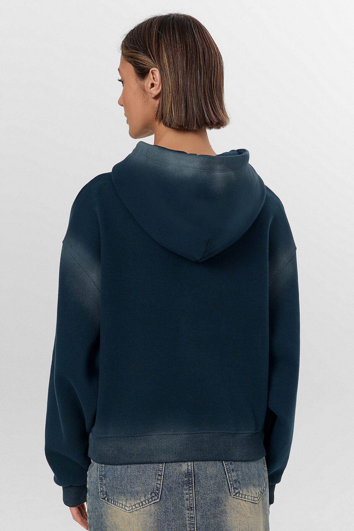 Худи женское свободного силуэта. Перед и спинка цельнокроеные. Рукав втачной, длинный, спущенный. По низу изделия и рукавов пояс и манжеты из рибаны. Худи с капюшоном и накладным карманом спереди. На краях капюшона, кармана, пояса и манжетов потертости с микронадрывами (как декор).