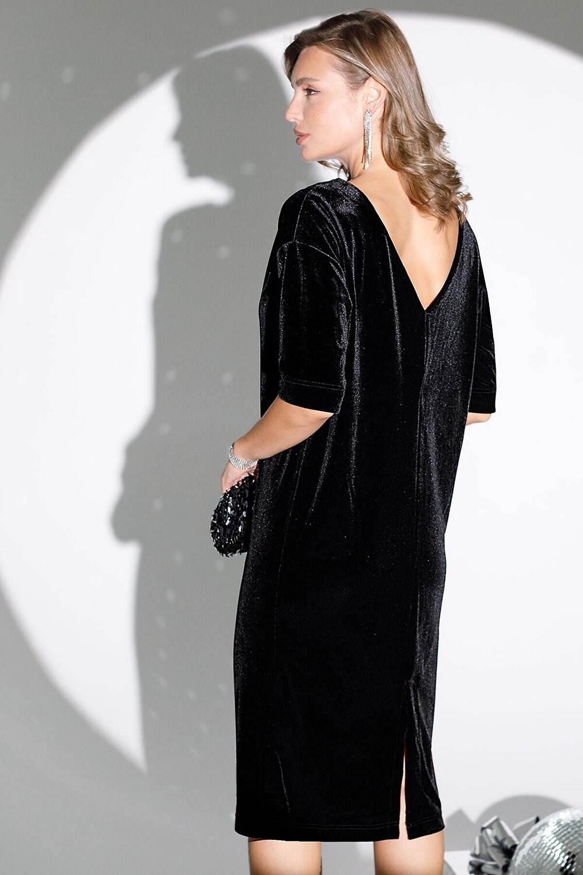 Невероятно изысканное платье длины миди выполнено из бархатистого материала в черном насыщенном цвете, который дарит тактильно приятное ощущение и мягкое прикосновение к коже. Благородный и лаконичный блеск ткани создает эффектность образу. Аккуратный небольшой разрез добавляет элегантности и женственности. Особое внимание привлекает глубокий, но не вызывающий V вырез на спине, создающий интересный акцент и подчеркивающий красивую линию спины. Элегантное платье подчеркивает стиль и комфорт благодаря свободному силуэту, а бархатистая ткань придает красивому платью приятную текстуру и визуальную глубину, делая его подходящим для различных мероприятий. Эластичность материала помогает сохранить форму изделия после стирки и длительного использования, ткань отличается дышащими свойствами, поэтому сохраняет оптимальный микроклимат тела. Платье средней длины, оно отлично сидит на любой фигуре, в том числе и на женщинах плюс сайз, обеспечивая удобство и свободу движений. Рукав длиной до локтя добавляет изящности и