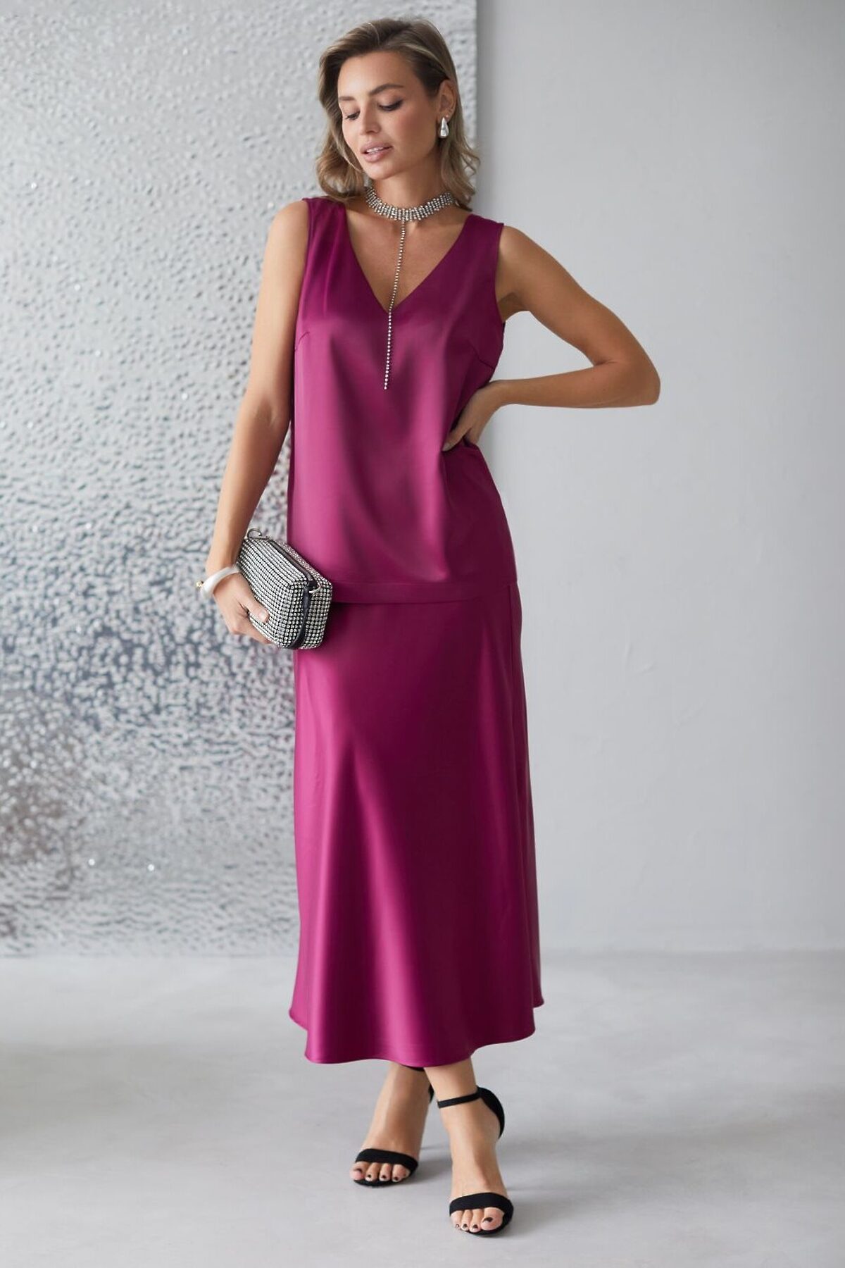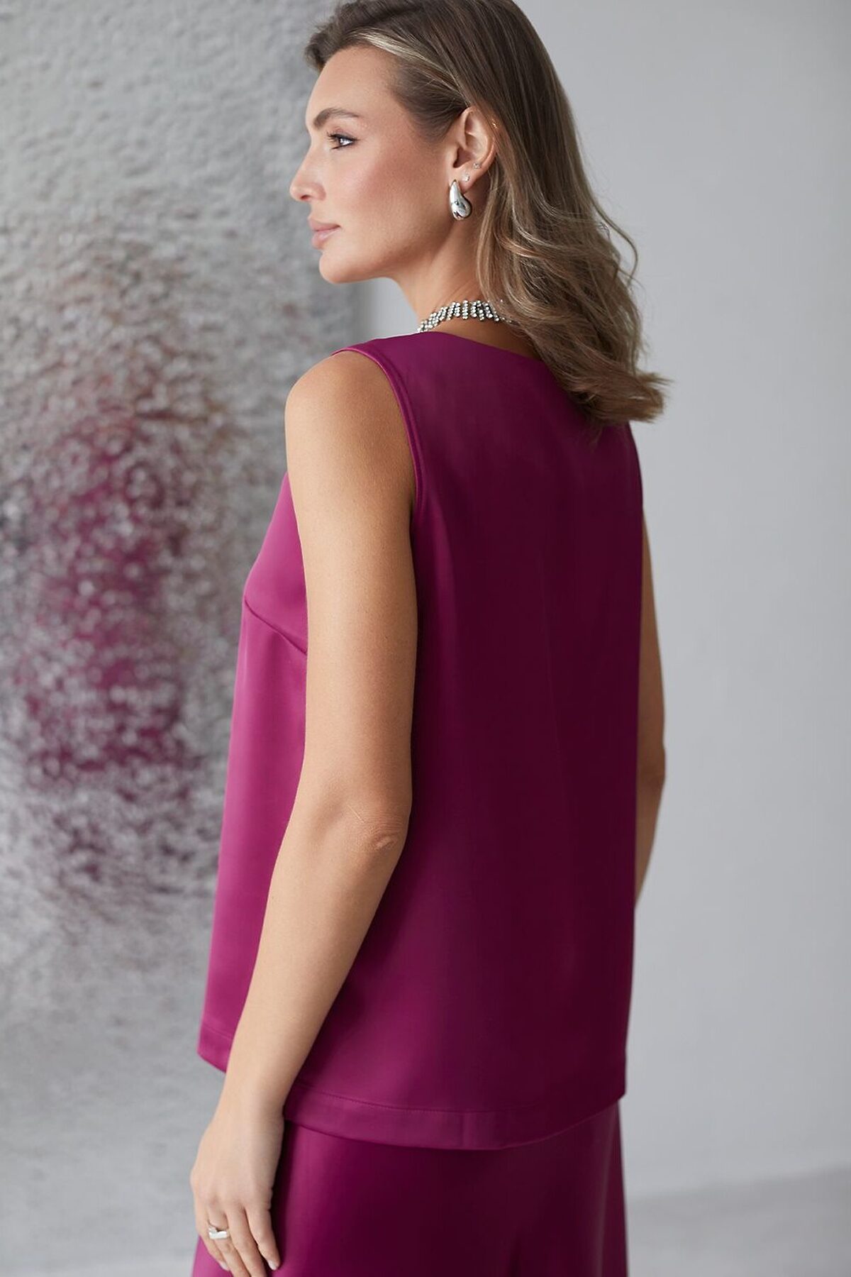 Изящный нарядный топ цвета бургунди с V вырезом выполнен из нежного премиального сатина с небольшим добавлением эластана. Свободный крой обеспечивает комфорт, легкость и свободу движений, подчеркивая изысканность образа и женственность силуэта. Особое внимание привлекает мягкий приглушенный блеск материала, придающий топу дорогое и утонченное звучание. Материал отличается приятной текстурой и долговечностью, что гарантирует долгий срок службы топа. Благодаря струящейся, но плотной ткани, топ мягко ложится по фигуре, придавая легкость и подчеркивая достоинства любого типа фигуры. Приятная на ощупь текстура и хорошая воздухопроницаемость - делает повседневный топ отличным выбором для теплого времени года или для носки в помещении. Топ подойдет как на большие размеры, так и на маленькие — универсальность фасона позволяет чувствовать себя уверенно вне зависимости от комплекции. Декольте оформлено аккуратно, создавая эффектный акцент без излишней открытости. Этот топ идеально подойдет для создания стильного анс