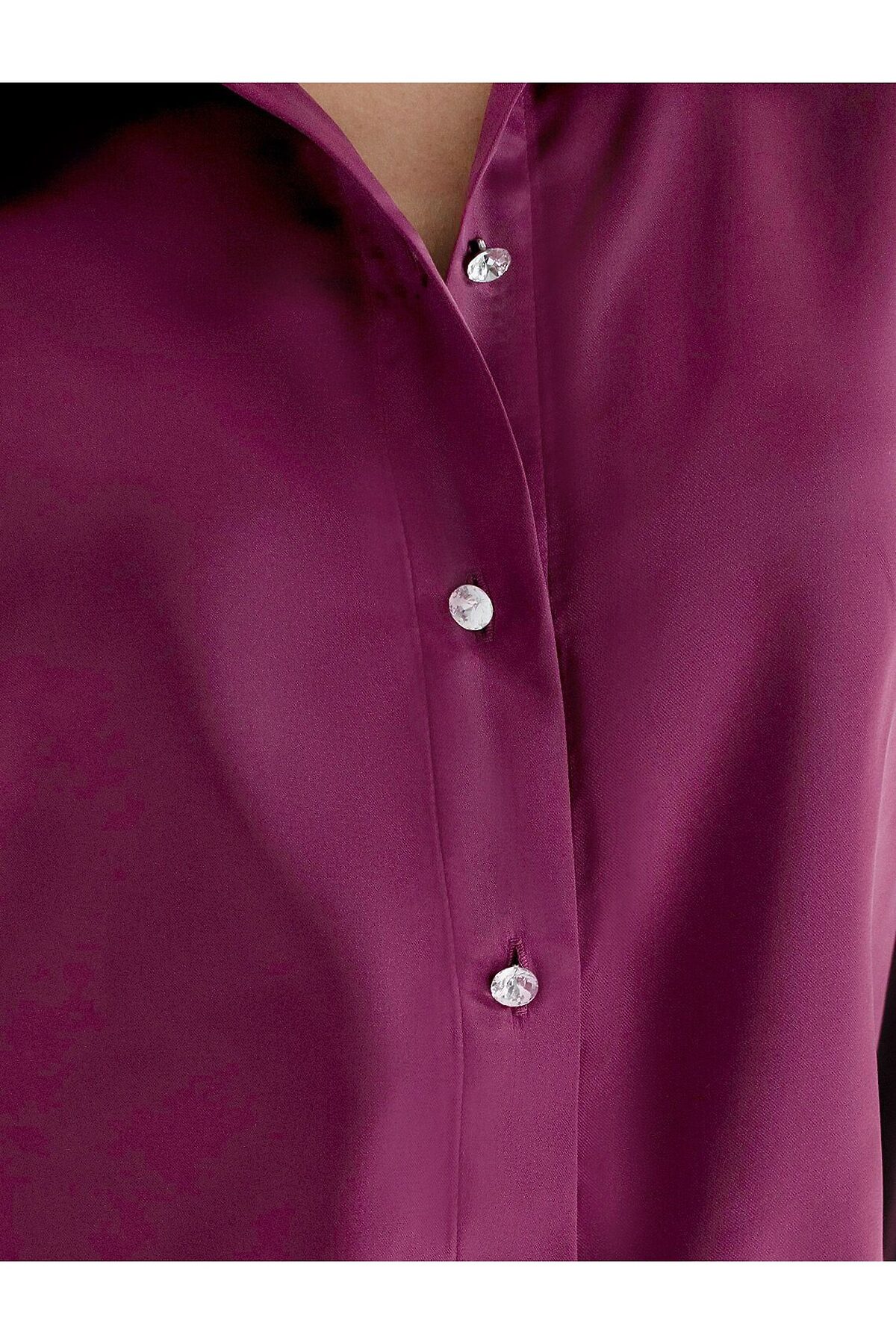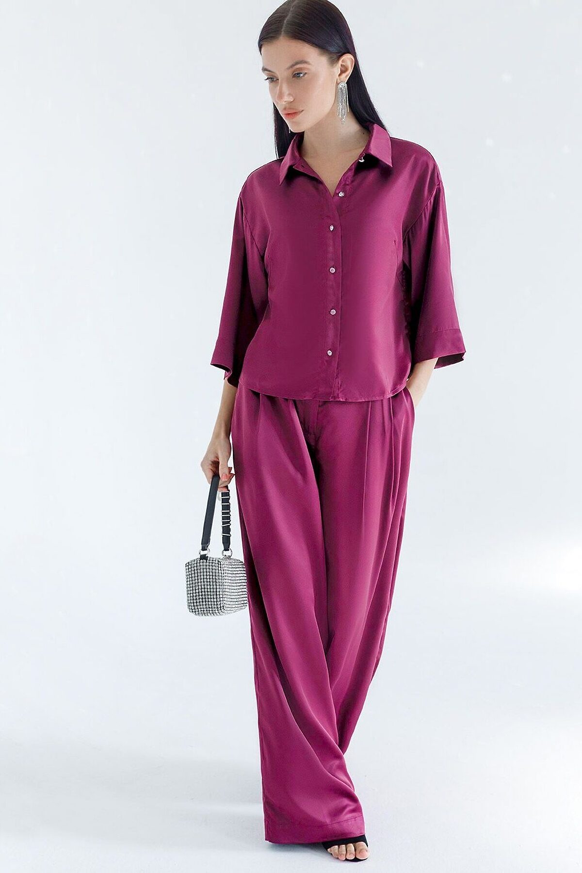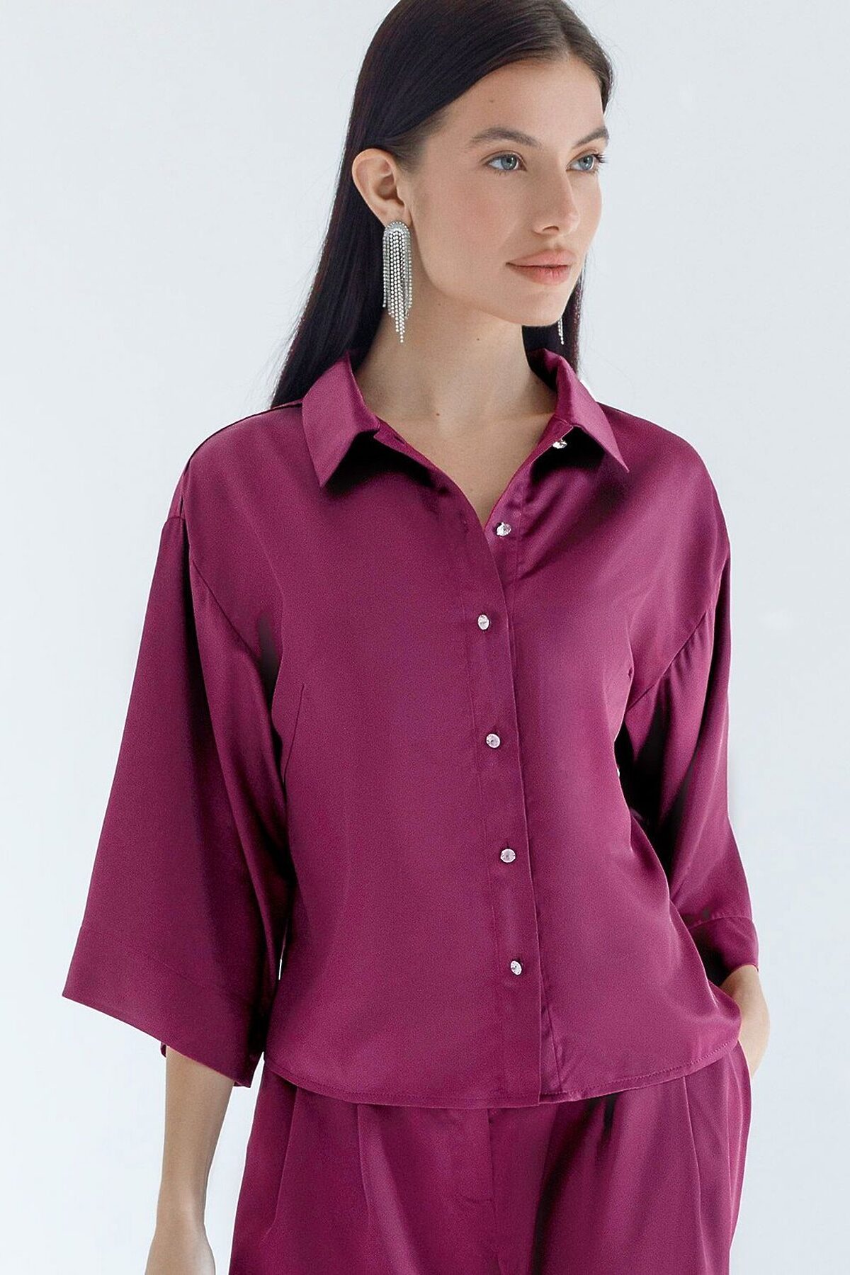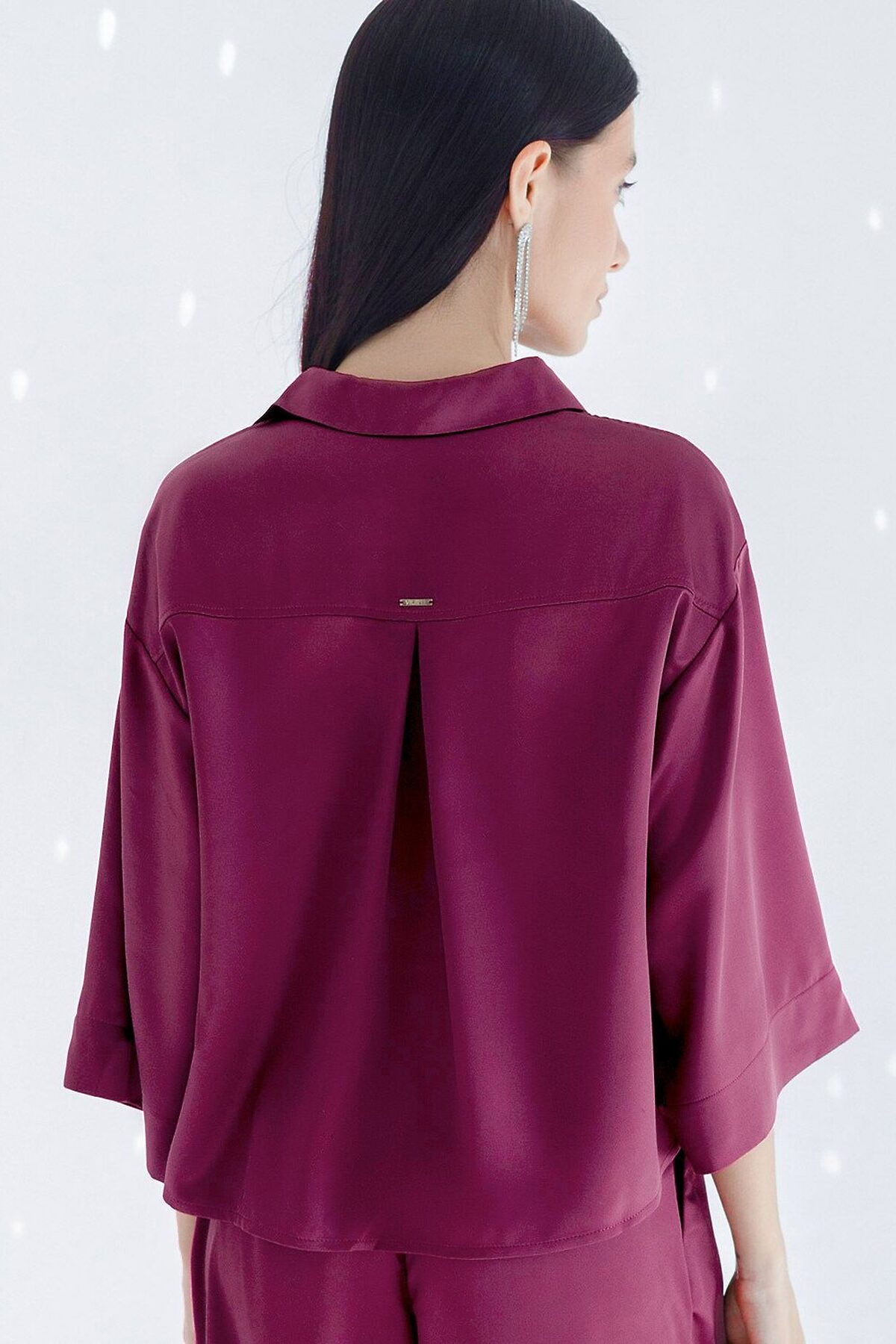 Элегантная блузка цвета бургунди на пуговицах выполнена из плотного струящегося сатина, который мягко ложится по фигуре и создает эффектную посадку. Отложной воротник придает образу женственную и изящную нотку. Материал отличается дышащей структурой, благодаря чему комфорт сохраняется даже в течение всего дня. Широкие рукава обеспечивают свободу движений и подходят для полных рук, делая блузку универсальной для разных типов фигур, в том числе для больших размеров. Красивая гладкая фактура материала подчеркивает утонченность изделия, добавляя легкое сияние к любому образу. Благодаря продуманному крою эта рубашка смотрится стильно как в повседневной жизни, так и на особых мероприятиях. Ткань практична, она приятна на ощупь, легко ухаживается и долго сохраняет первоначальный вид даже после многократных стирок и активной носки. Блузка с короткими рукавами станет отличным выбором для создания элегантного и практичного образа, блузка удобна для повседневного ношения в любое время года. Для женщин, которые ценят пра
