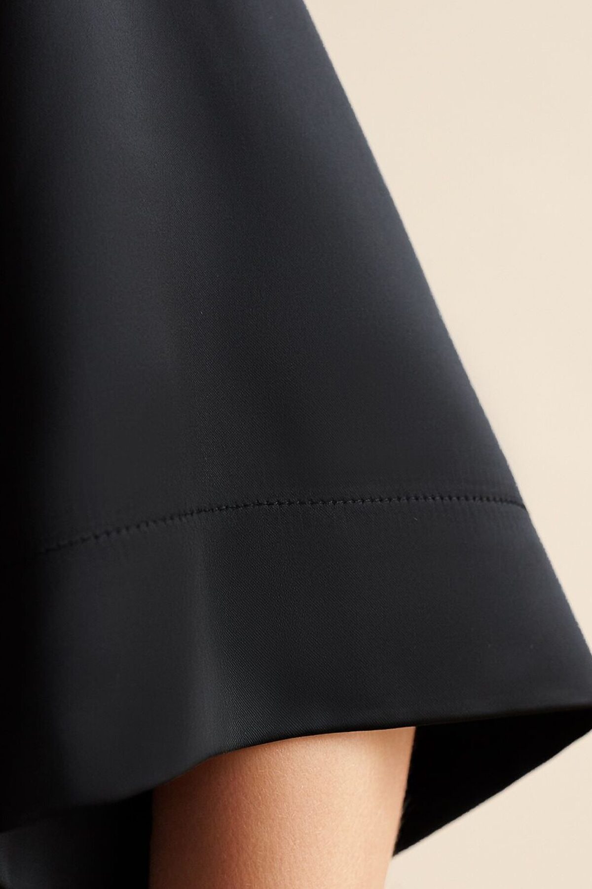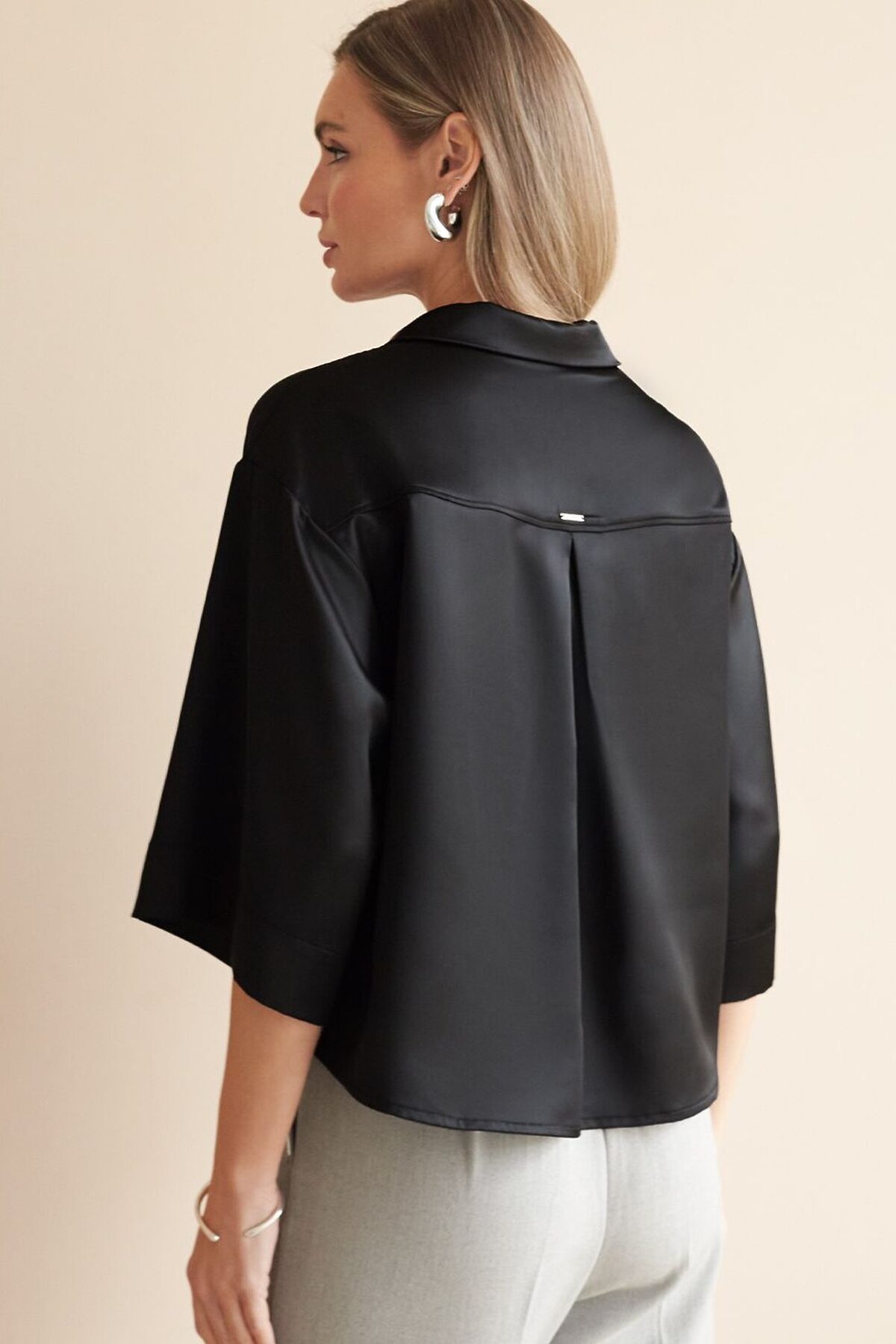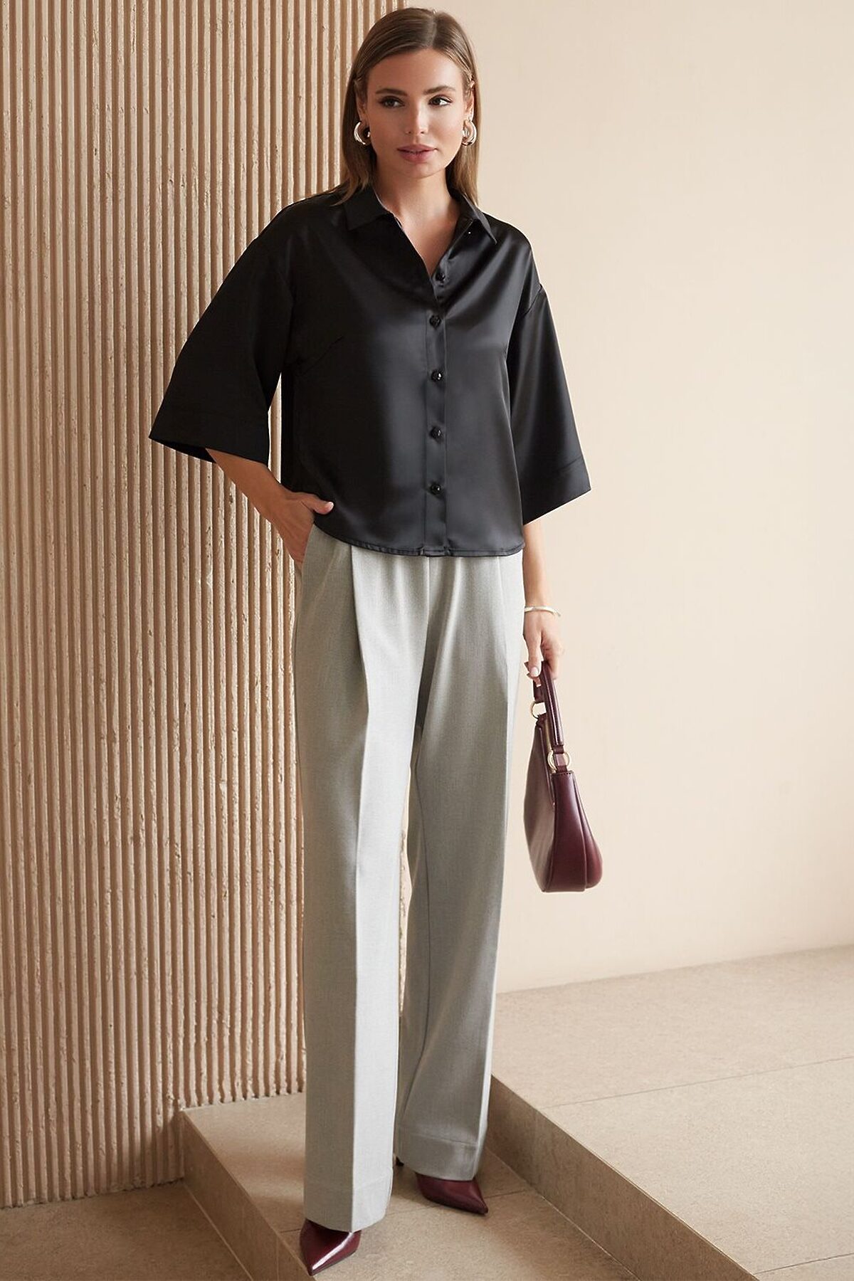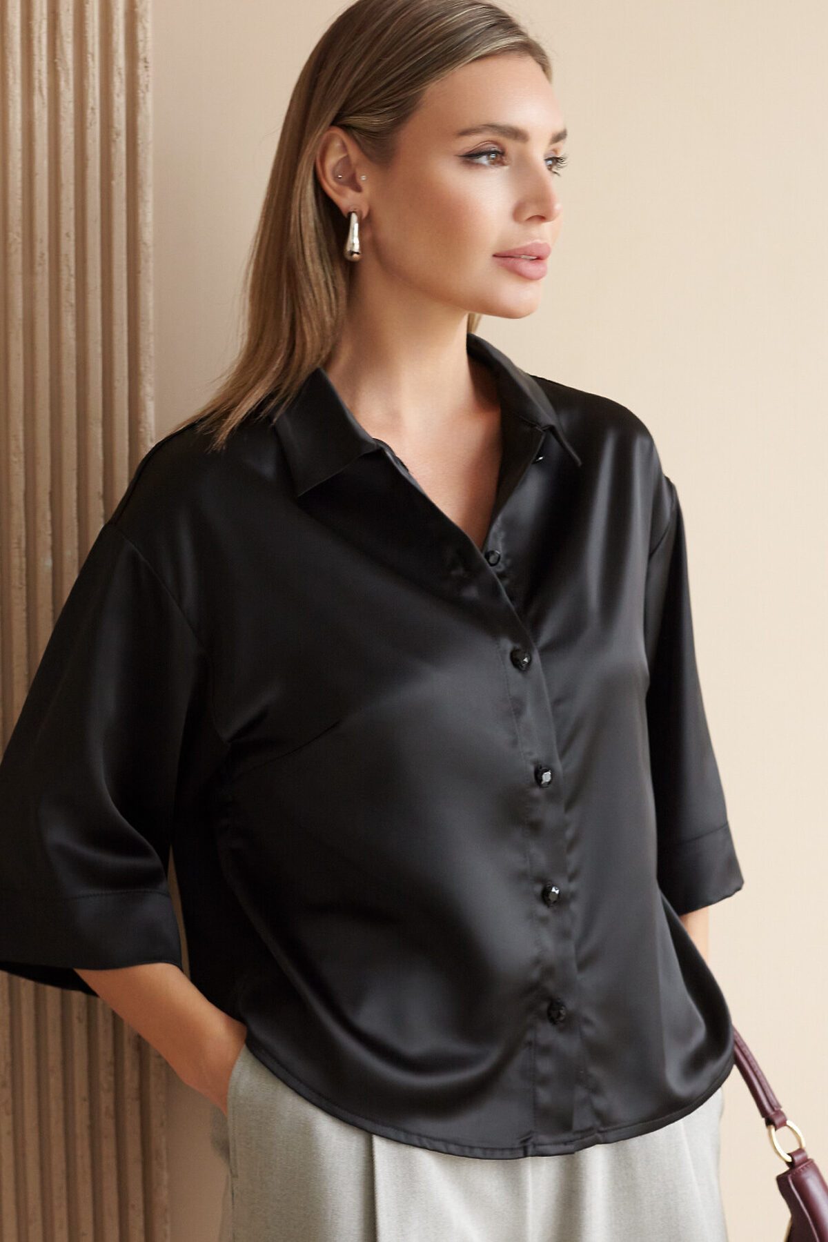Элегантная блузка черного цвета на пуговицах выполнена из плотного струящегося сатина, который мягко ложится по фигуре и создает эффектную посадку. Отложной воротник придает образу женственную и изящную нотку. Материал отличается дышащей структурой, благодаря чему комфорт сохраняется даже в течение всего дня. Широкие рукава обеспечивают свободу движений и подходят для полных рук, делая блузку универсальной для разных типов фигур, в том числе для больших размеров. Красивая гладкая фактура материала подчеркивает утонченность изделия, добавляя легкое сияние к любому образу. Благодаря продуманному крою эта рубашка смотрится стильно как в повседневной жизни, так и на особых мероприятиях. Ткань практична, она приятна на ощупь, легко ухаживается и долго сохраняет первоначальный вид даже после многократных стирок и активной носки. Блузка с короткими рукавами станет отличным выбором для создания элегантного и практичного образа, блузка удобна для повседневного ношения в любое время года. Для женщин, которые ценят прак