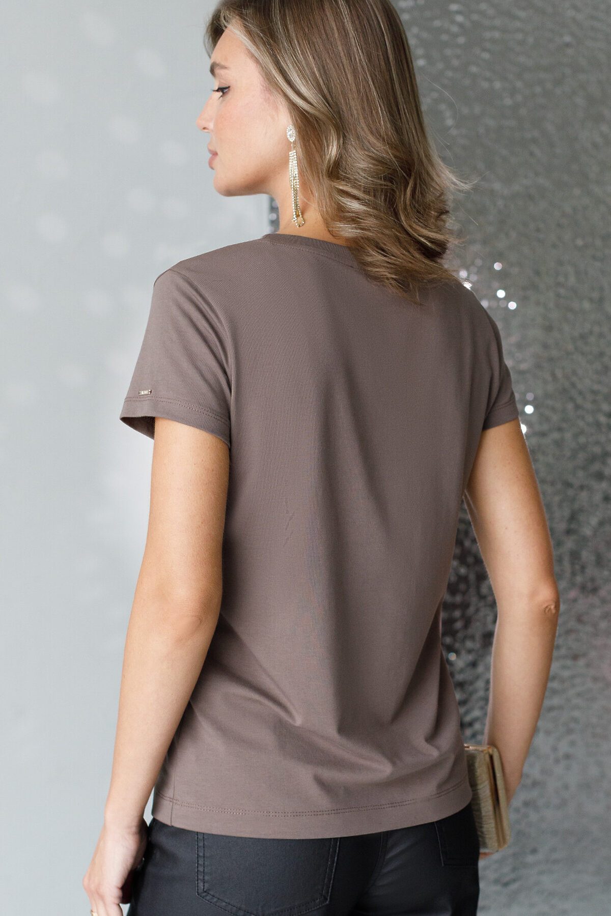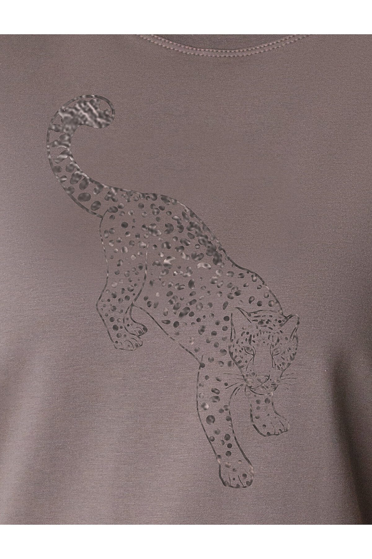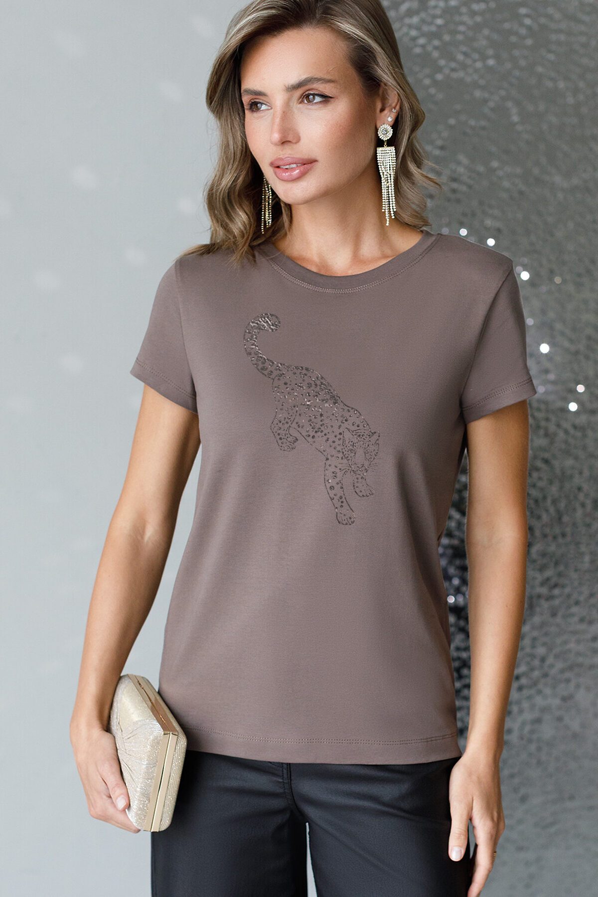 Стильная базовая футболка кофейного цвета с серебристым принтом фольгой выполнена из плотного хлопка с эластаном для комфортной посадки на любую фигуру. Прямая футболка классического кроя с круглым вырезом, прекрасно подходит для разных типов фигуры, в том числе и на большие размеры. Мягкость хлопка вместе с небольшой долей эластана гарантирует идеальную посадку и свободу движений. Легкая натуральная дышащая ткань премиального качества делает футболку с коротким рукавом идеальным вариантом для повседневной носки дома, на работу или офис. Однотонная футболка дополнена авторским аккуратным принтом с изображением леопарда, который придает праздничный и элегантный вид без лишней вычурности. Блестящий анималистичный принт аккуратно украшает, добавляя изысканный акцент и создавая легкий мерцающий эффект. Эта эффектная футболка станет отличным выбором на праздник, подчеркивая образ сияющей и уверенной в себе девушки или женщины. Если вы ищете комфортный и одновременно привлекательный наряд для особых моментов, э