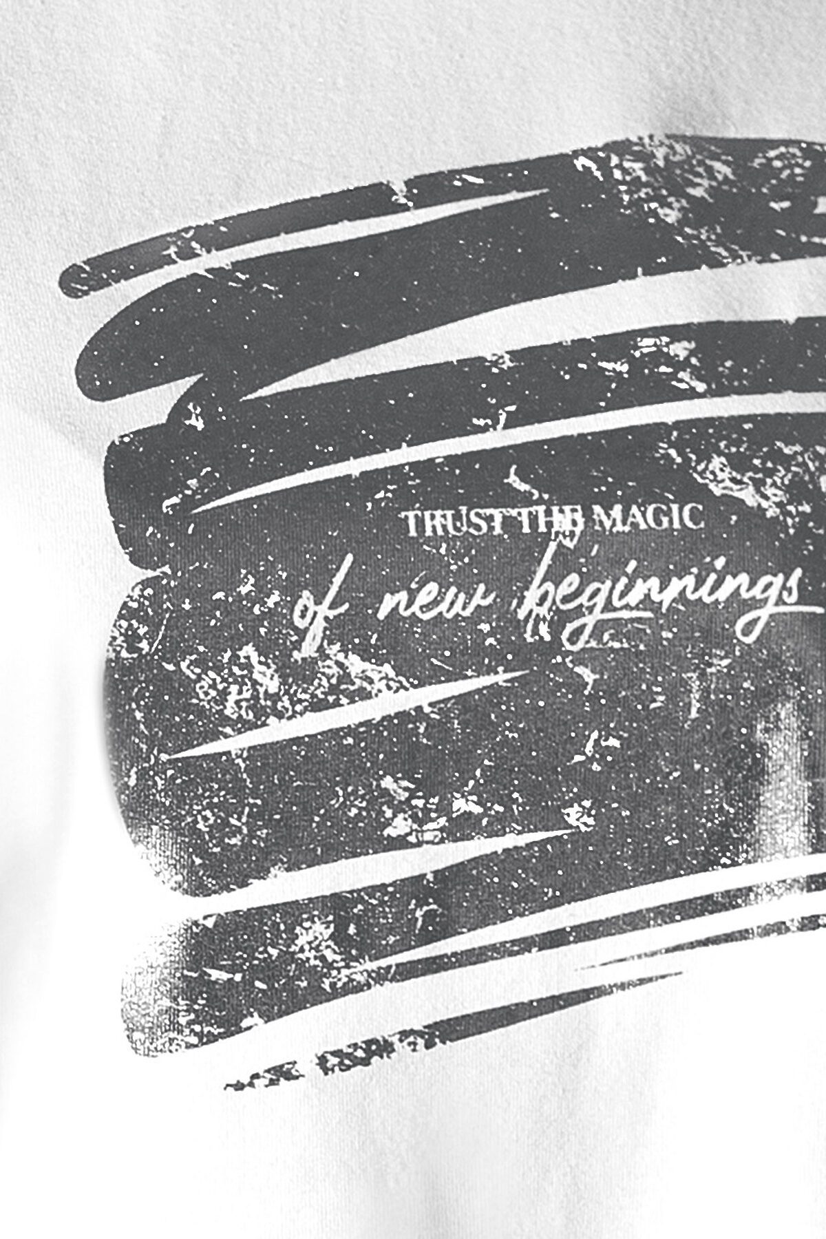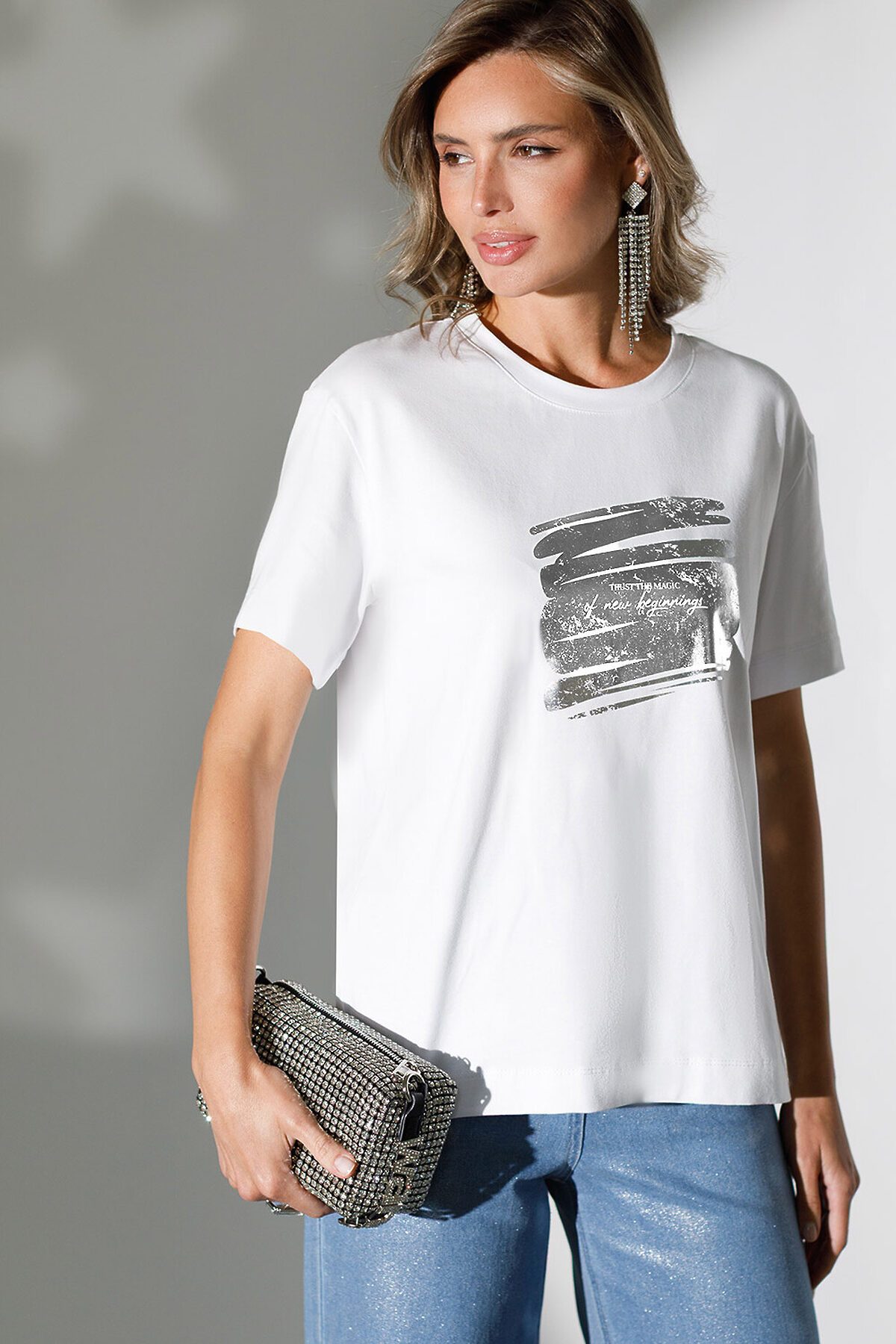 Стильная базовая футболка белого цвета с серебристым принтом фольгой выполнена из плотного хлопка с эластаном для комфортной посадки на любую фигуру. Прямая футболка классического кроя с круглым вырезом, прекрасно подходит для разных типов фигуры, в том числе и на большие размеры. Мягкость хлопка вместе с небольшой долей эластана гарантирует идеальную посадку и свободу движений. Легкая натуральная дышащая ткань премиального качества делает футболку с коротким рукавом идеальным вариантом для повседневной носки дома, на работу или офис. Однотонная футболка дополнена авторским аккуратным принтом с минималистичной надписью, который придает праздничный и элегантный вид без лишней вычурности. Блестящий принт аккуратно украшает, добавляя изысканный акцент и создавая легкий мерцающий эффект. Перевод надписи Trust the magic of new beginnings - Доверьтесь магии новых начинаний. Эта эффектная футболка станет отличным выбором на праздник, подчеркивая образ сияющей и уверенной в себе девушки или женщины. Если вы ищете