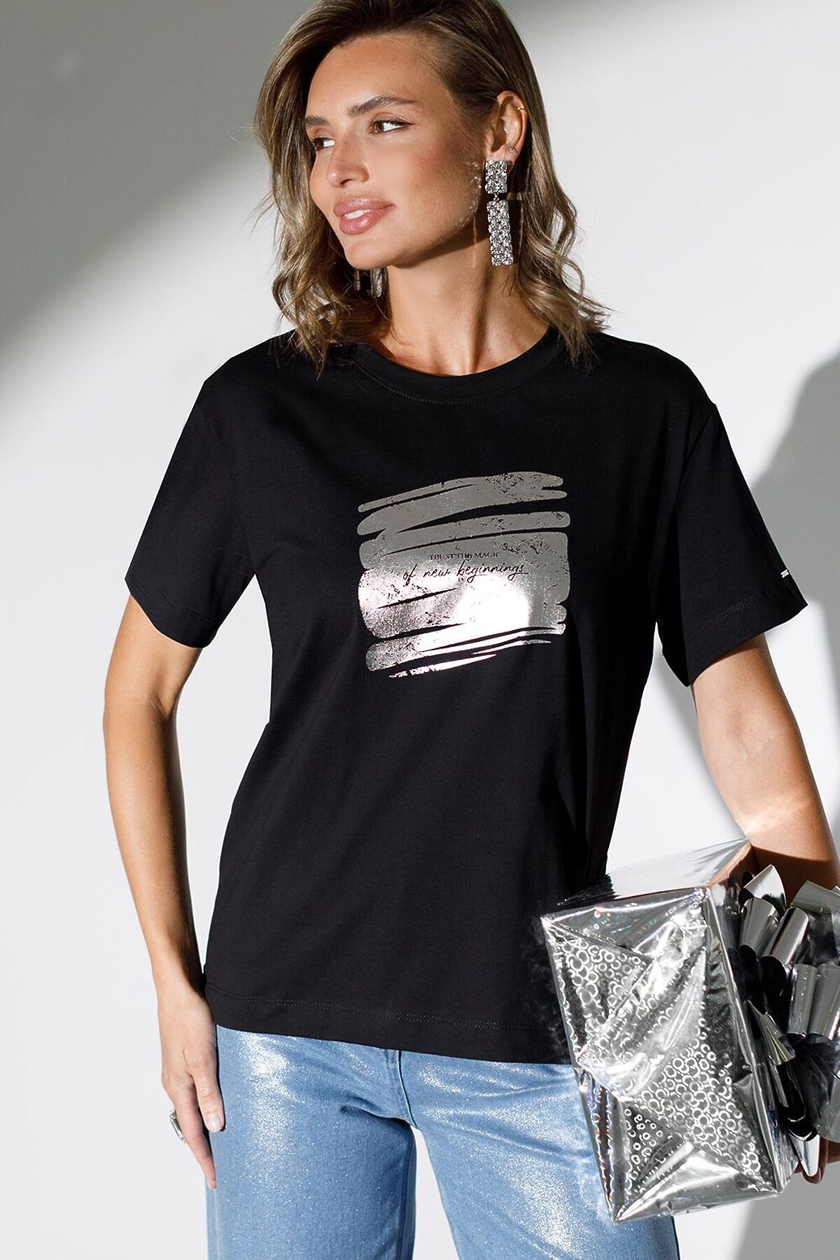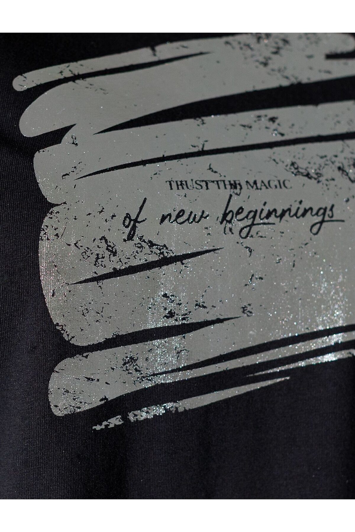 Стильная базовая футболка черного цвета с серебристым принтом фольгой выполнена из плотного хлопка с эластаном для комфортной посадки на любую фигуру. Прямая футболка классического кроя с круглым вырезом, прекрасно подходит для разных типов фигуры, в том числе и на большие размеры. Мягкость хлопка вместе с небольшой долей эластана гарантирует идеальную посадку и свободу движений. Легкая натуральная дышащая ткань премиального качества делает футболку с коротким рукавом идеальным вариантом для повседневной носки дома, на работу или офис. Однотонная футболка дополнена авторским аккуратным принтом с минималистичной надписью, который придает праздничный и элегантный вид без лишней вычурности. Блестящий принт аккуратно украшает, добавляя изысканный акцент и создавая легкий мерцающий эффект. Перевод надписи Trust the magic of new beginnings - Дооверьтесь магии новых начинаний. Эта эффектная футболка станет отличным выбором на праздник, подчеркивая образ сияющей и уверенной в себе девушки или женщины. Если вы ище