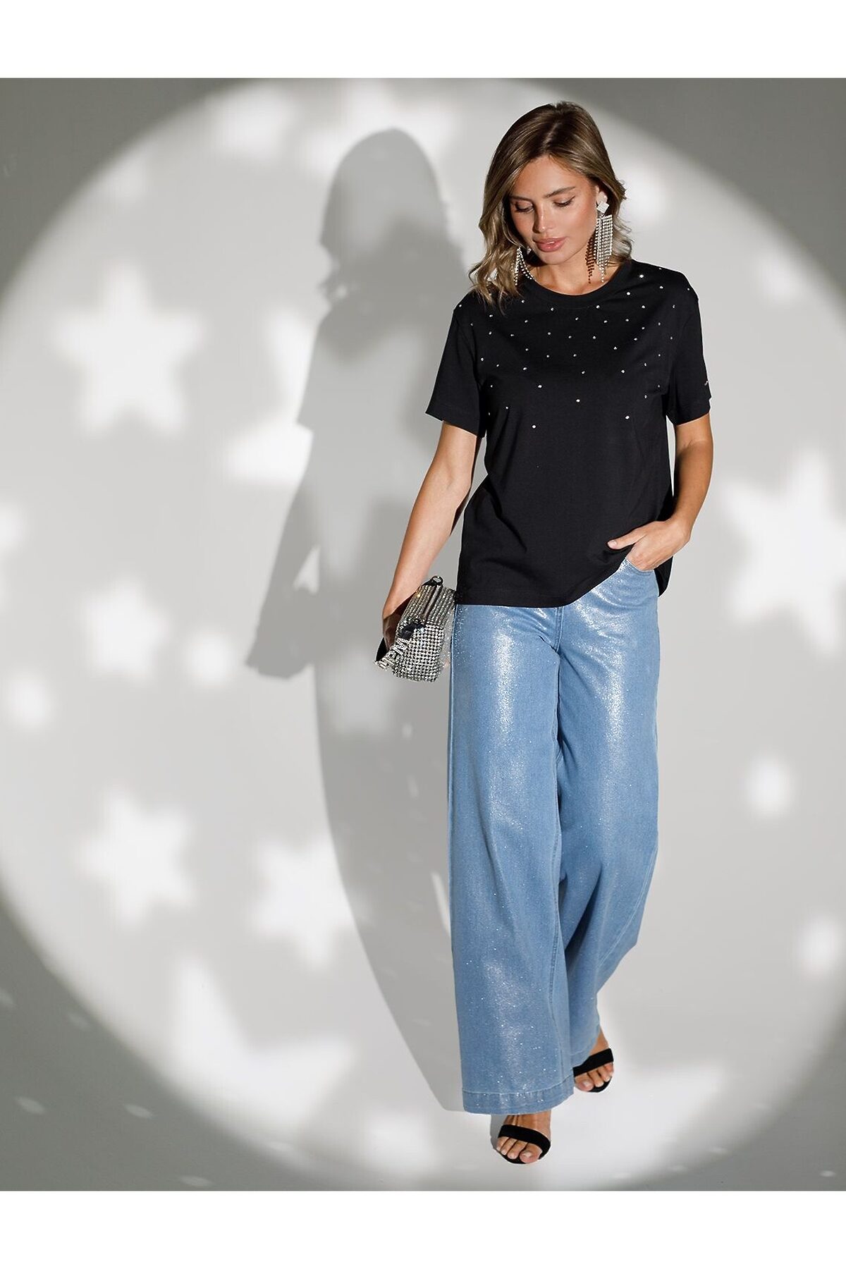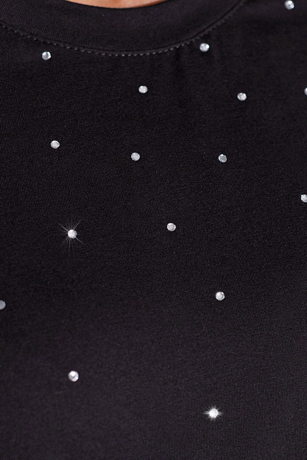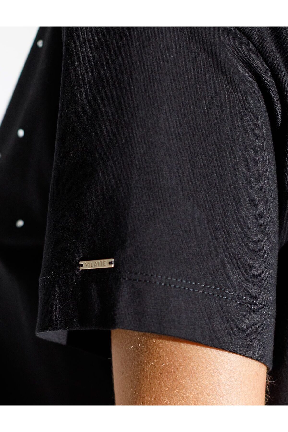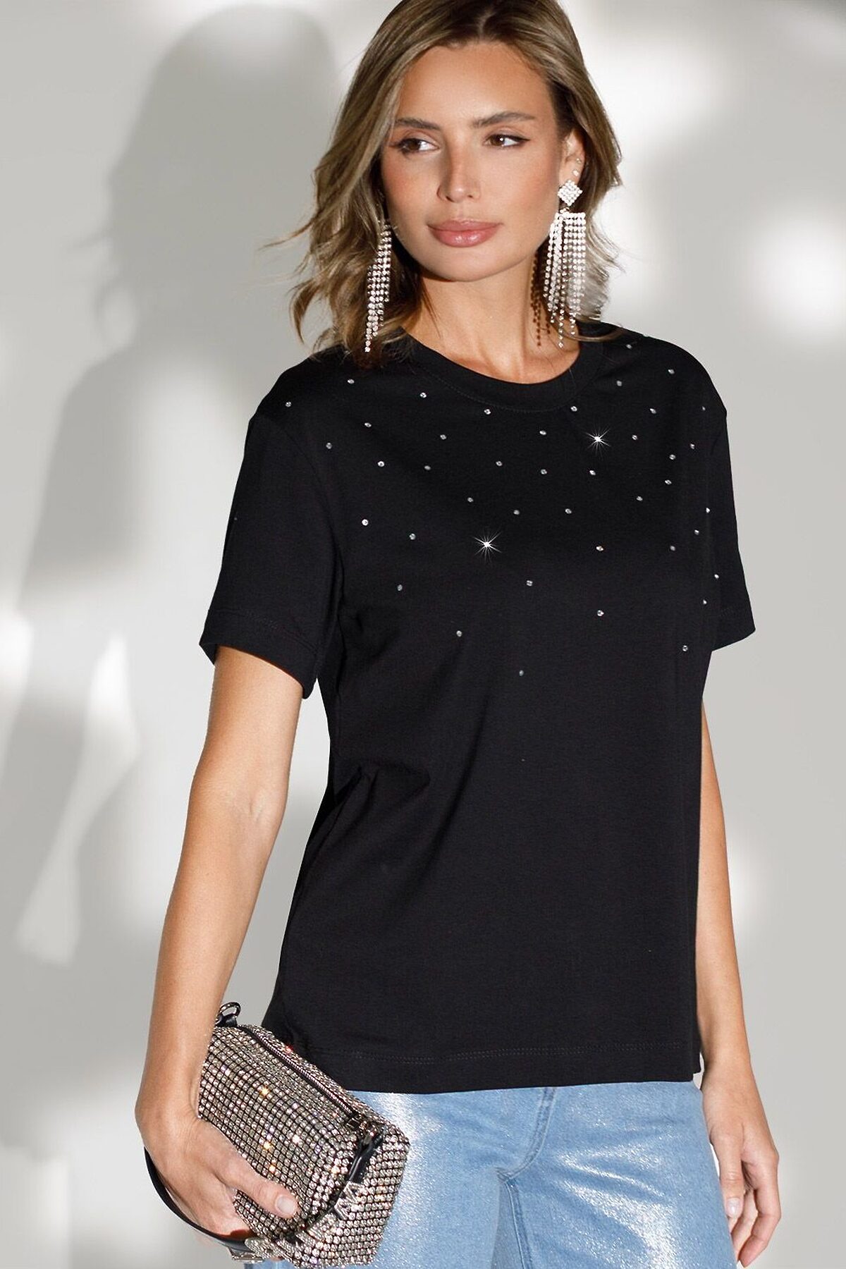 Стильная базовая футболка черного цвета с принтом стразами выполнена из плотного хлопка с эластаном для комфортной посадки на любую фигуру. Прямая футболка классического кроя с круглым вырезом, прекрасно подходит для разных типов фигуры, в том числе и на большие размеры. Мягкость хлопка вместе с небольшой долей эластана гарантирует идеальную посадку и свободу движений. Легкая натуральная дышащая ткань премиального качества делает футболку с коротким рукавом идеальным вариантом для повседневной носки дома, на работу или офис. Однотонная футболка дополнена авторским аккуратным принтом, который придает праздничный и элегантный вид без лишней вычурности. Блестящий принт в виде россыпи страз аккуратно украшает, добавляя изысканный акцент и создавая легкий мерцающий эффект. Эта эффектная футболка станет отличным выбором на праздник, подчеркивая образ сияющей и уверенной в себе девушки или женщины. Если вы ищете комфортный и одновременно привлекательный наряд для особых моментов, эта футболка станет надежным ре