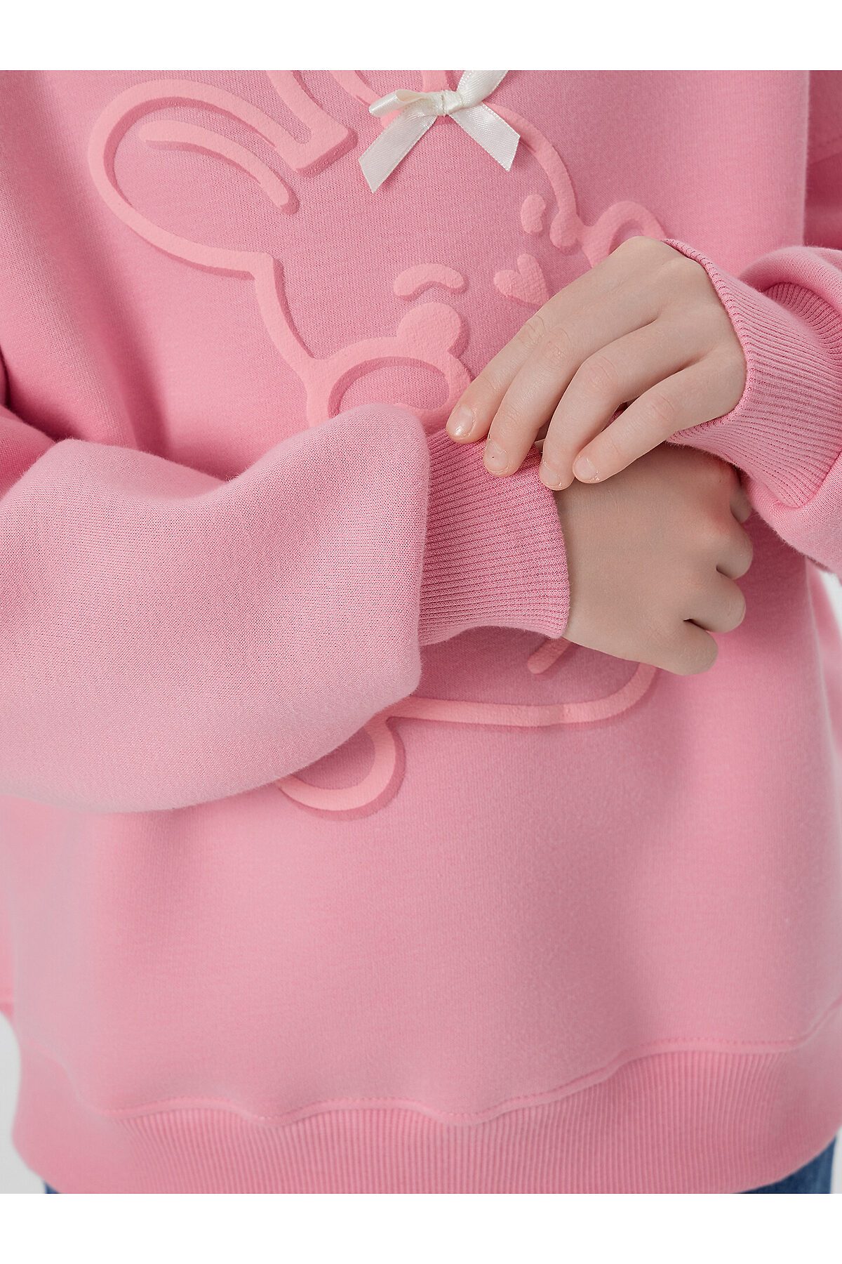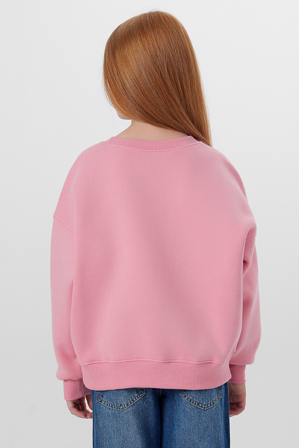 Свитшот свободного силуэта. Рукава длинные, втачные. Линия плеча спущена. Плечевой шов смещен вперед. Горловина круглой формы c окантовкой из рибаны. Низ рукавов и низ изделия обработаны рибаной .