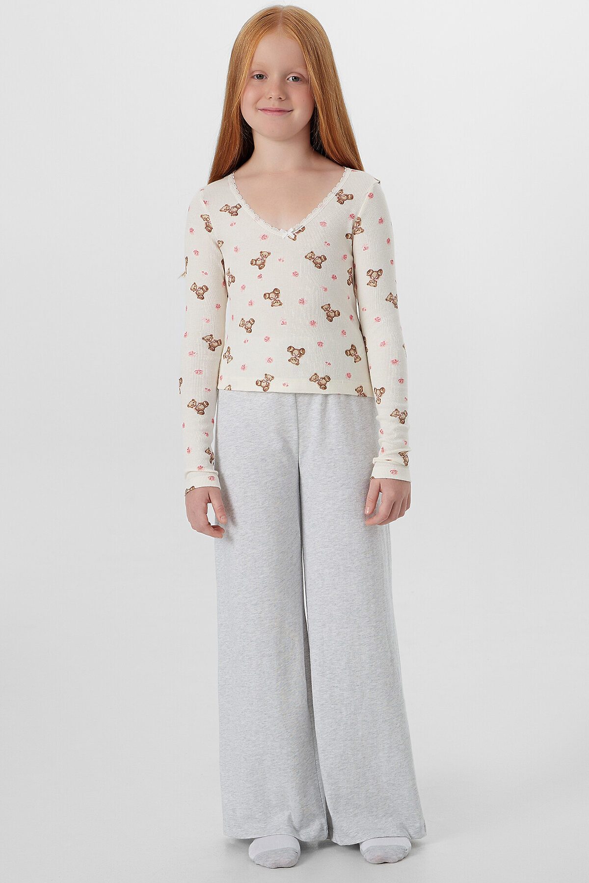 Комплект для девочек состоит из джемпера и брюк. Джемпер укороченный, прилегающего силуэта, выполнен из трикотажной рибаны 2*2 R-25 (R22-001.01.180) 100% хлопок, 115 см, 180 гр/м?. Горловина V-образной формы, обработана кружевом 15 мм, Devsel L20166-1.5. Рукава длинные втачные, одношовные. Перед и спинка цельнокроеные. Низ джемпера, рукавов и брюк обработан на 2х игольной плоскошовной машине швом в подгибку. Брюки длинные, прямые, свободные, выполнены из кулирного полотна SJ-10 (SJ-001.01.140) 100% хлопок, 180 см, 140 гр/м?. Пояс цельнокроенный с эластичной тесьмой внутри (внутренняя резина 30RV) ширина 30мм.