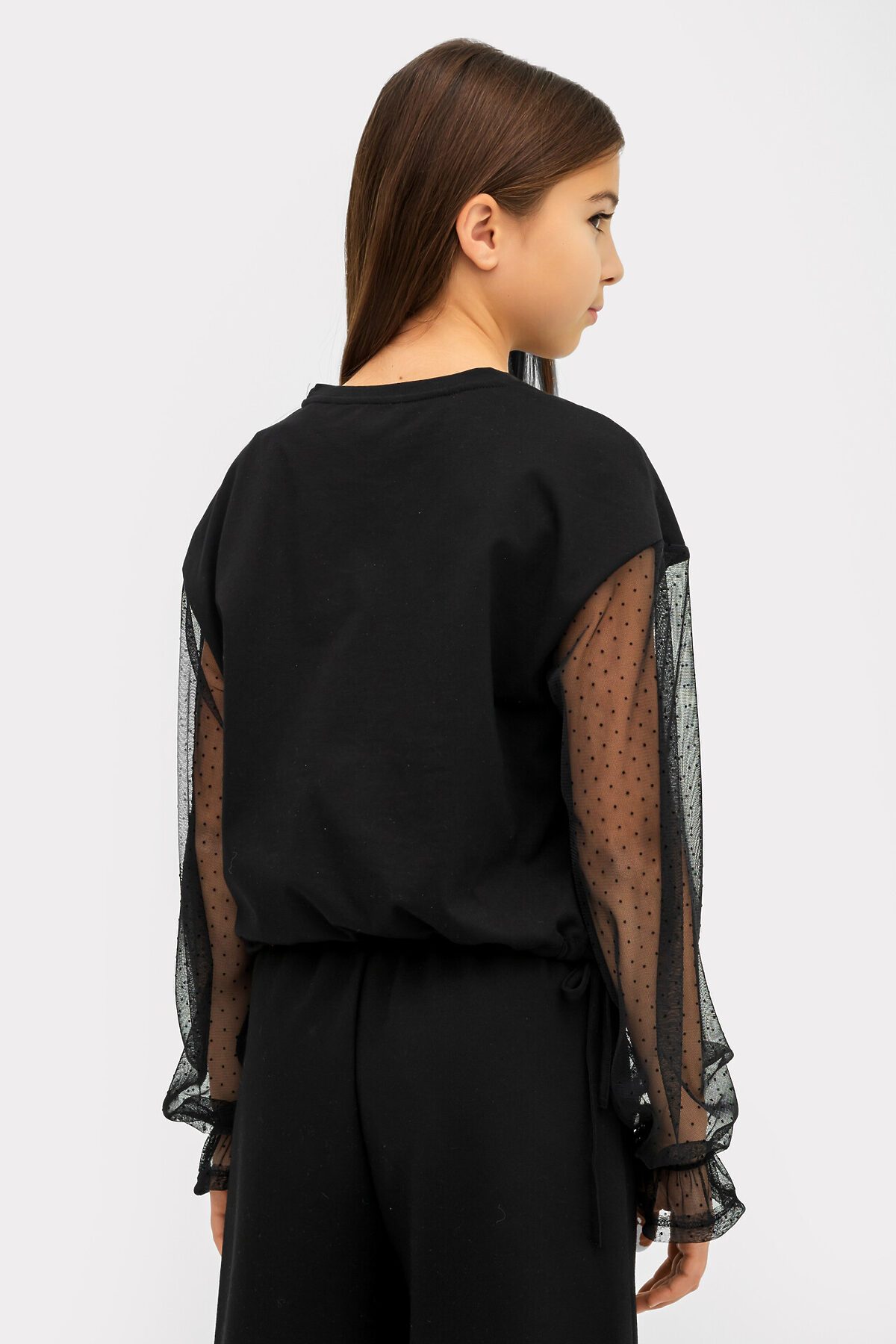 Блуза свободного силуэта. Линия плеча спущена. Горловина круглая обработана обтачкой из основного полотна. Шов втачивания обтачки закрыт бейкой из основного полотна. Рукава длинные, втачные, выполнены из полотна трикотажного сетки. По низу рукавов с отступом от края, с внутренней стороны настрочена жилка вязаная. Перед и спинка из кулирного трикотажного полотна. По низу в боковых швах разрезы с завязками на шнур из основного полотна.