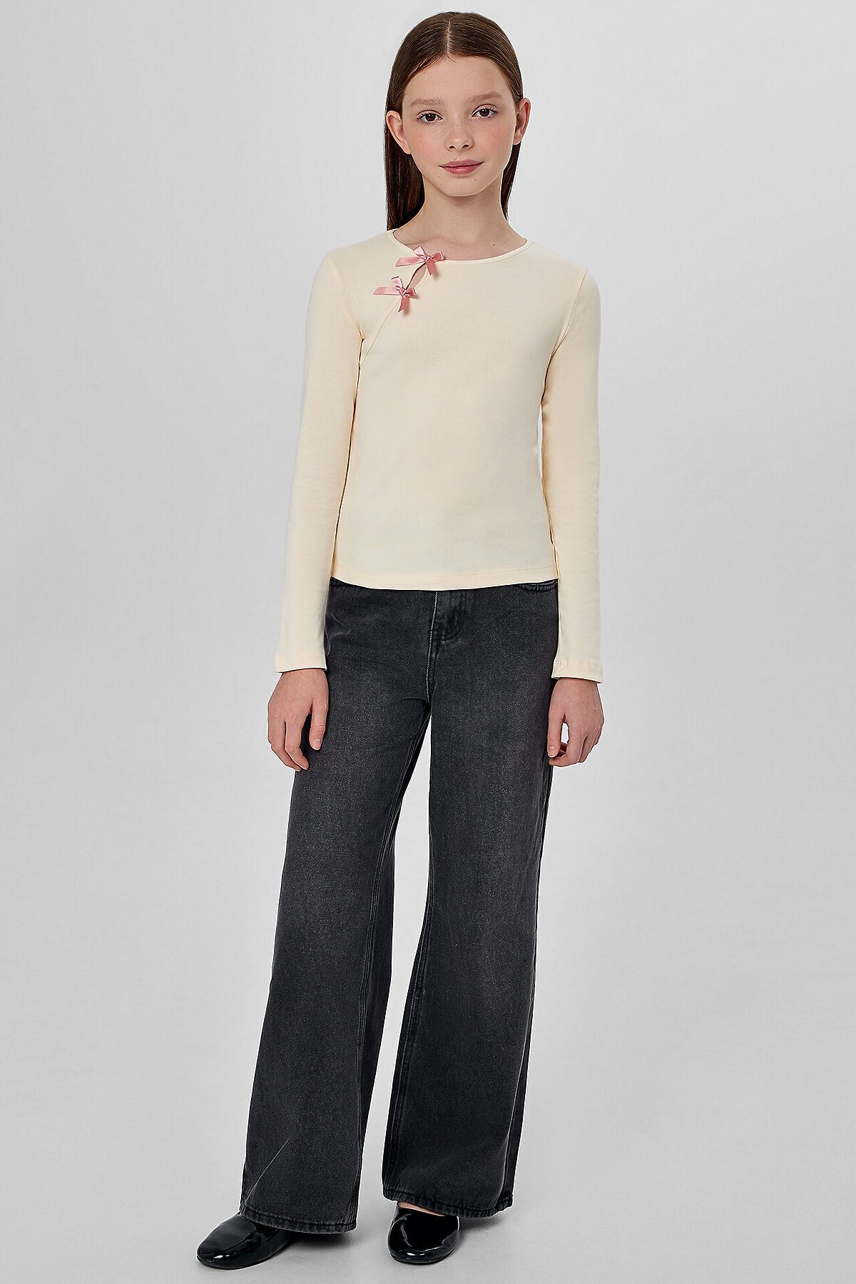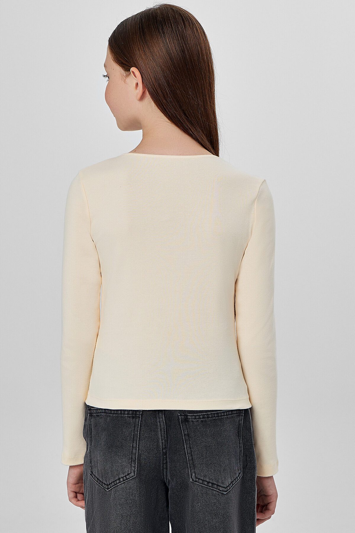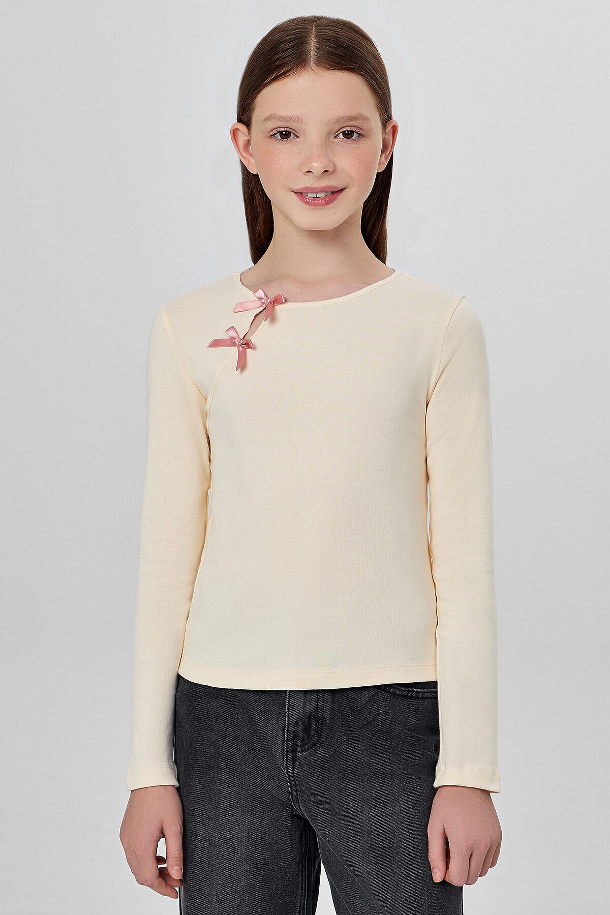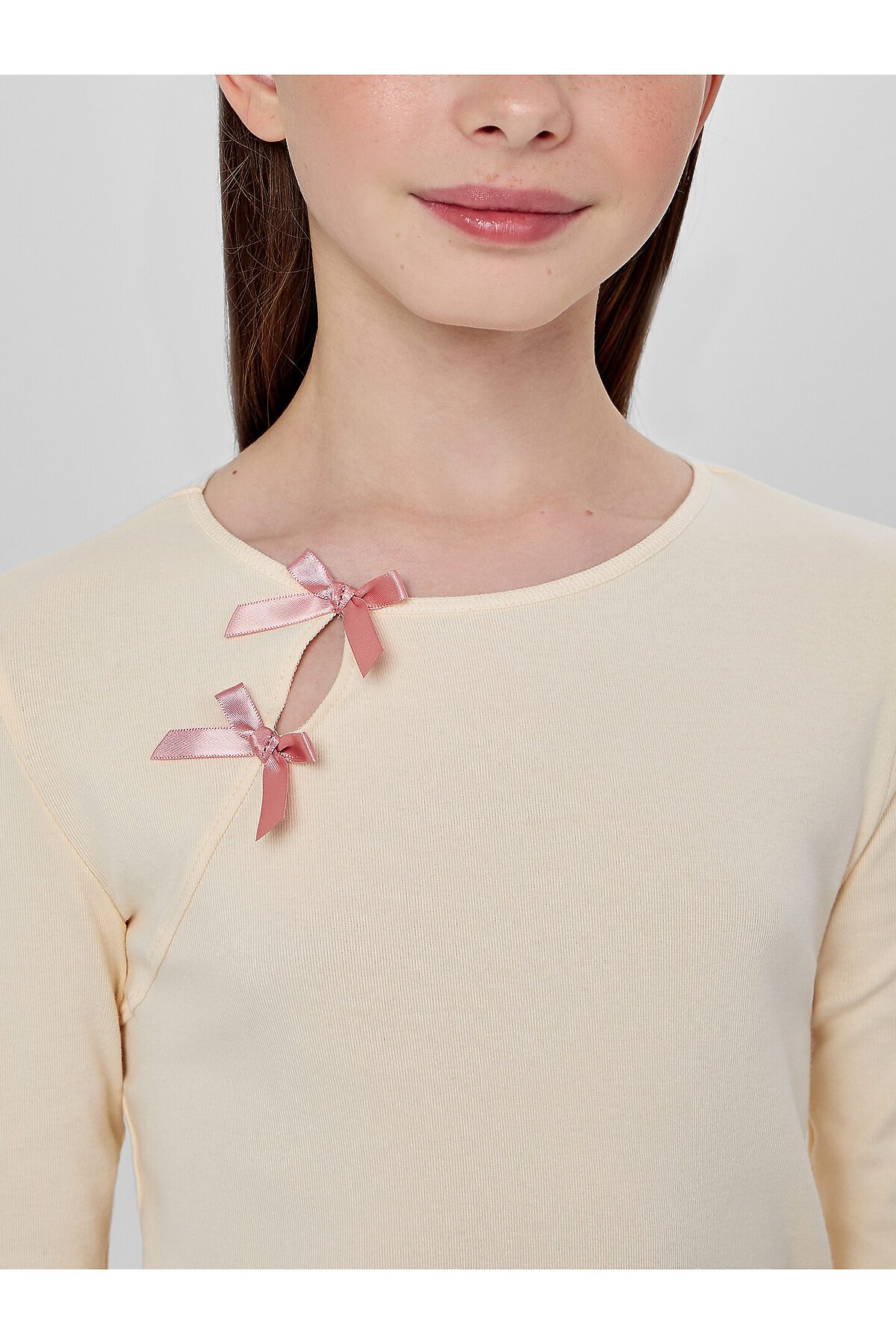 Украшением модели служит декоративный вырез на передней части, дополненный нашитыми бантиками, которые добавляют образу нежности и милого шарма. Длинные рукава и низ изделия обработаны мягким швом, который не раздражает кожу и обеспечивает аккуратную посадку.