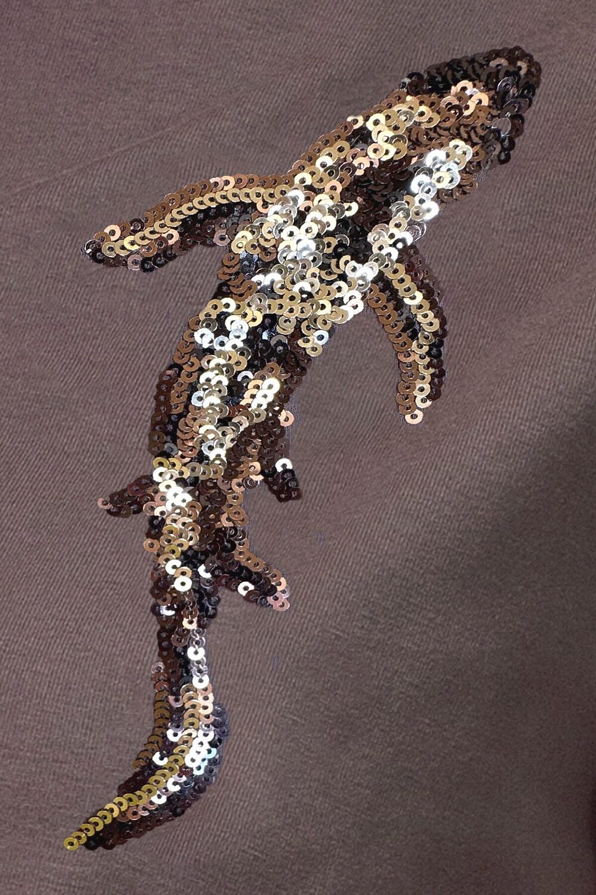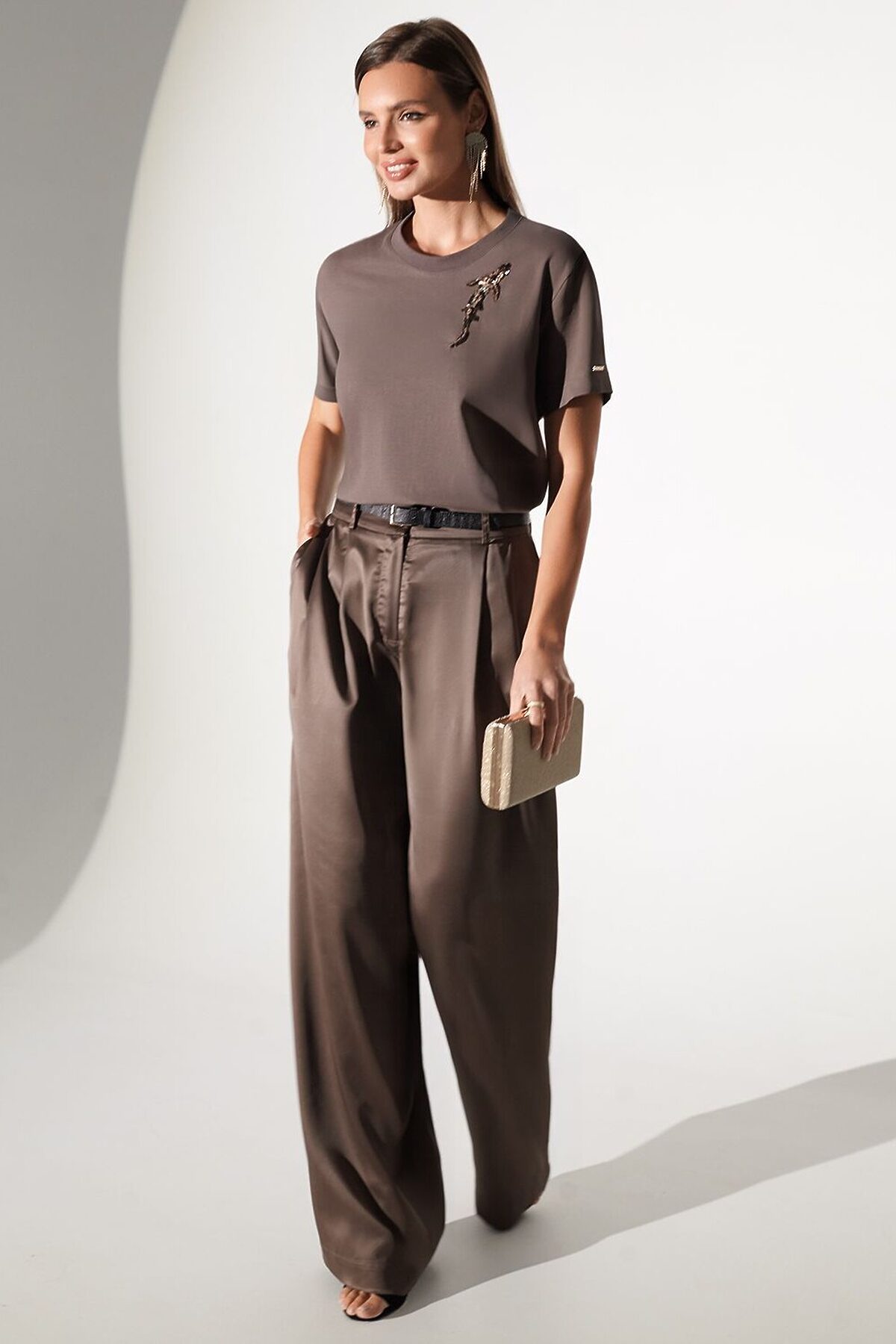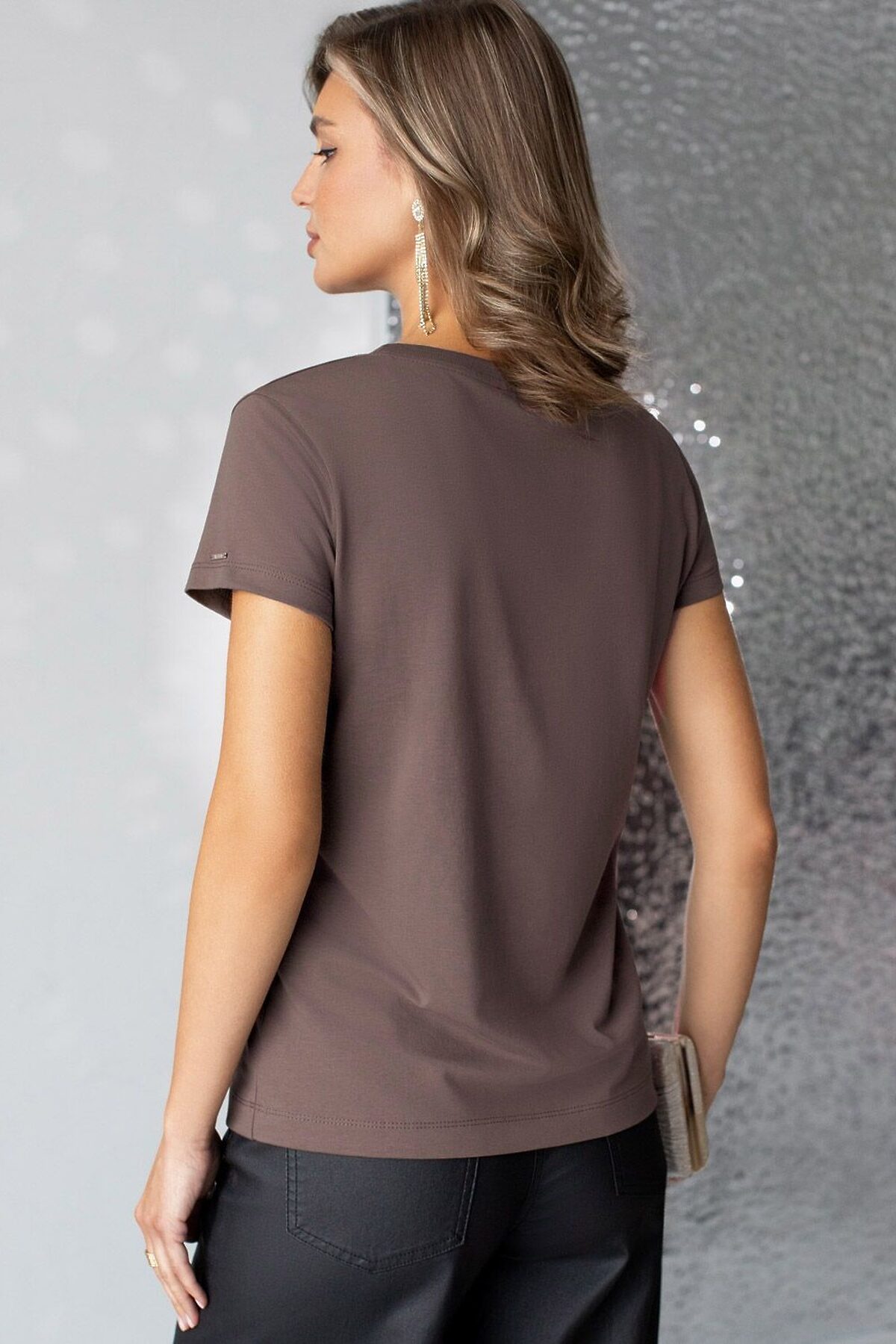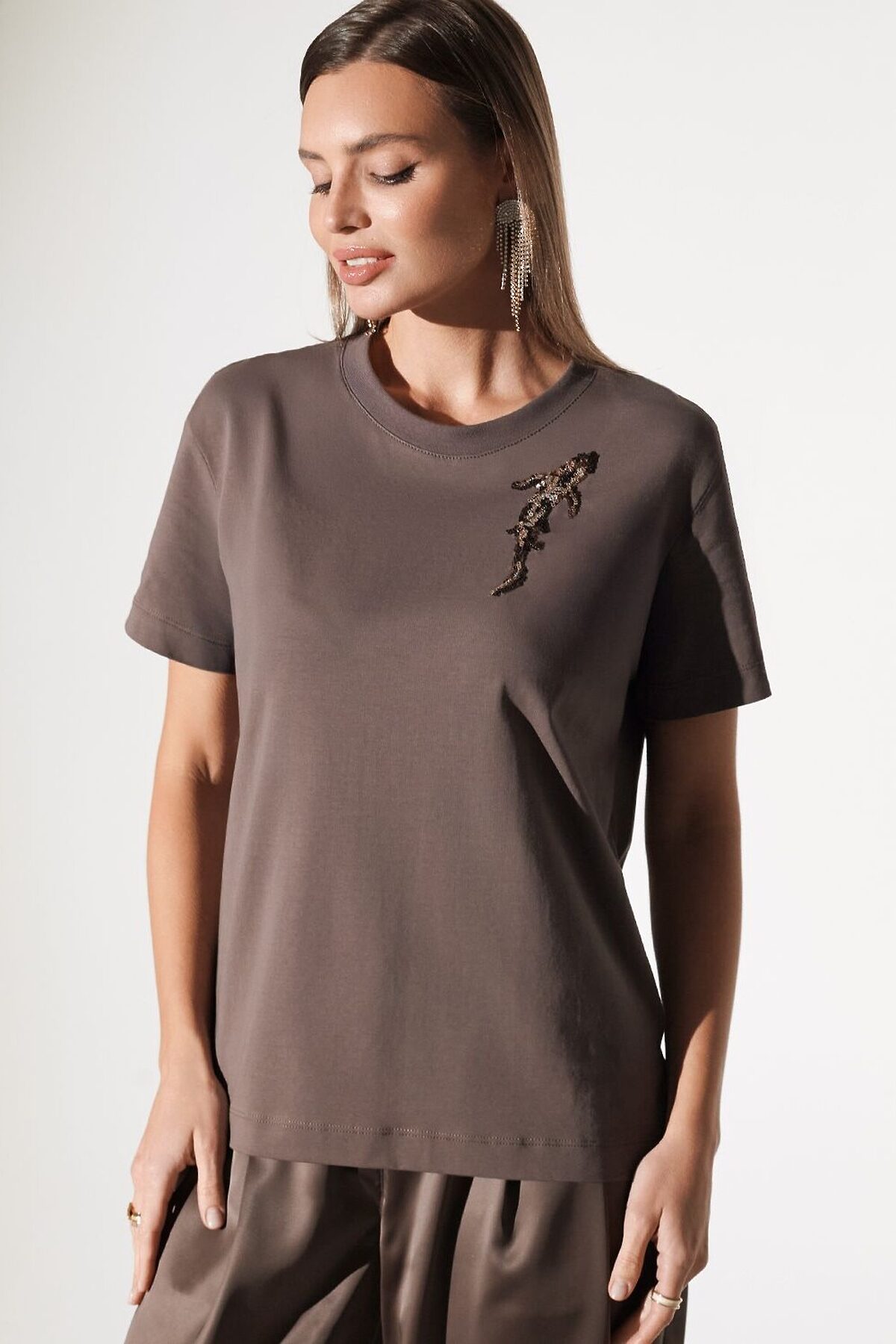 Стильная базовая футболка кофейного цвета с принтом пайетками в виде рыбки выполнена из плотного хлопка с эластаном для комфортной посадки на любую фигуру. Прямая футболка классического кроя с круглым вырезом, прекрасно подходит для разных типов фигуры, в том числе и на большие размеры. Мягкость хлопка вместе с небольшой долей эластана гарантирует идеальную посадку и свободу движений. Легкая натуральная дышащая ткань премиального качества делает футболку с коротким рукавом идеальным вариантом для повседневной носки дома, на работу или офис. Однотонная футболка дополнена авторским аккуратным принтом зебра, который придает праздничный и элегантный вид без лишней вычурности. Блестящий анималистичный принт аккуратно украшает, добавляя изысканный акцент и создавая легкий мерцающий эффект. Эта эффектная футболка станет отличным выбором на праздник, подчеркивая образ сияющей и уверенной в себе девушки или женщины. Если вы ищете комфортный и одновременно привлекательный наряд для особых моментов, эта футболка ста