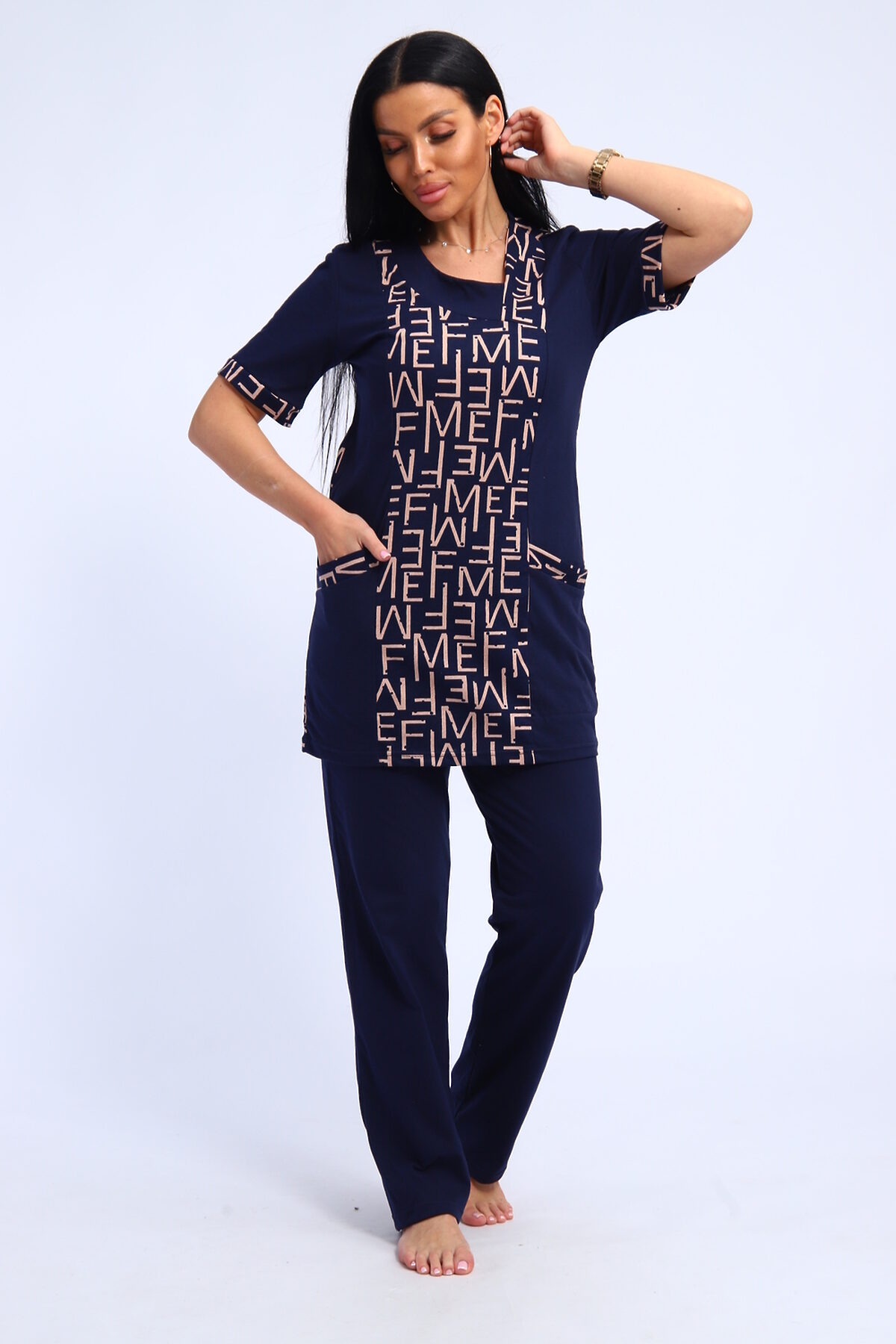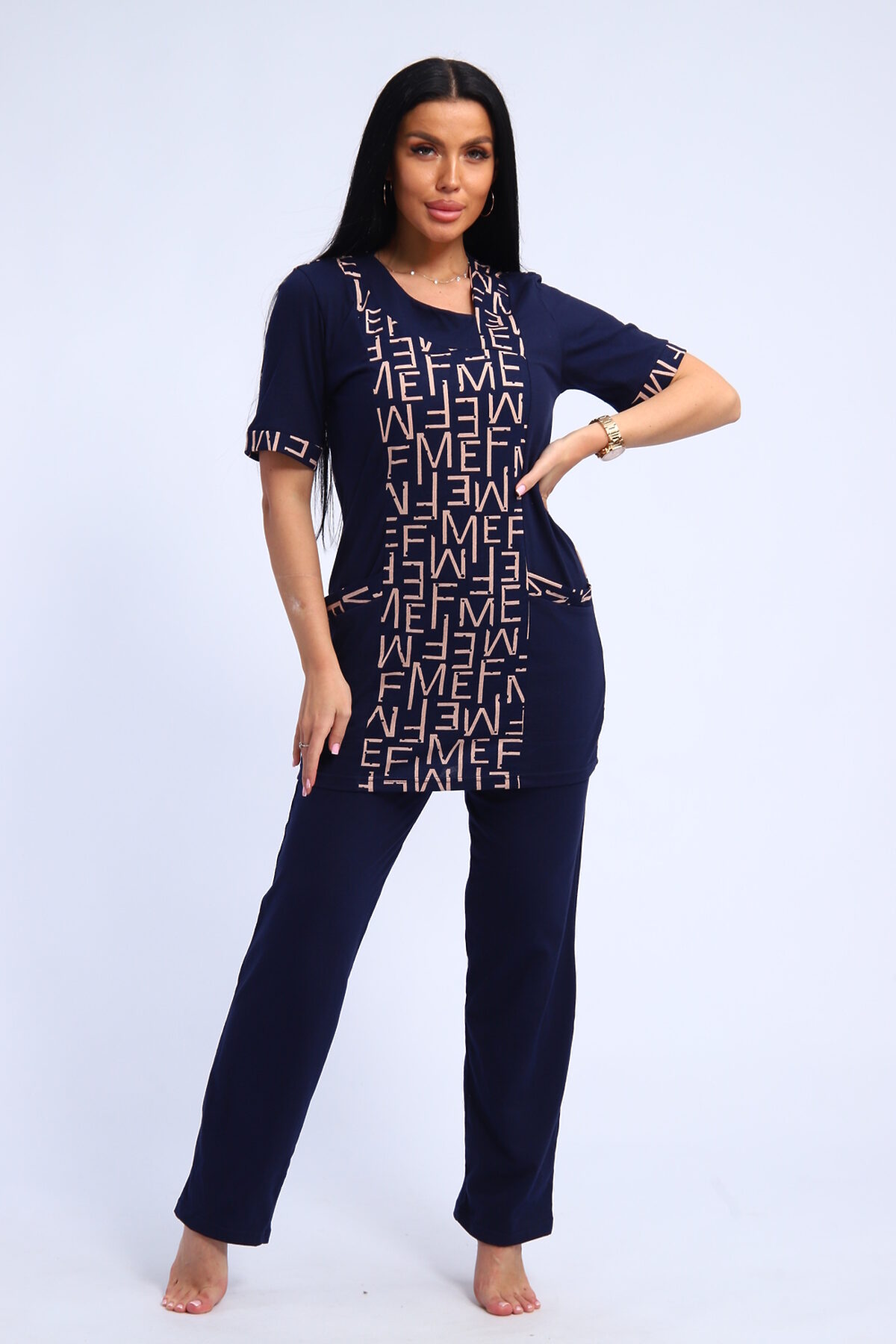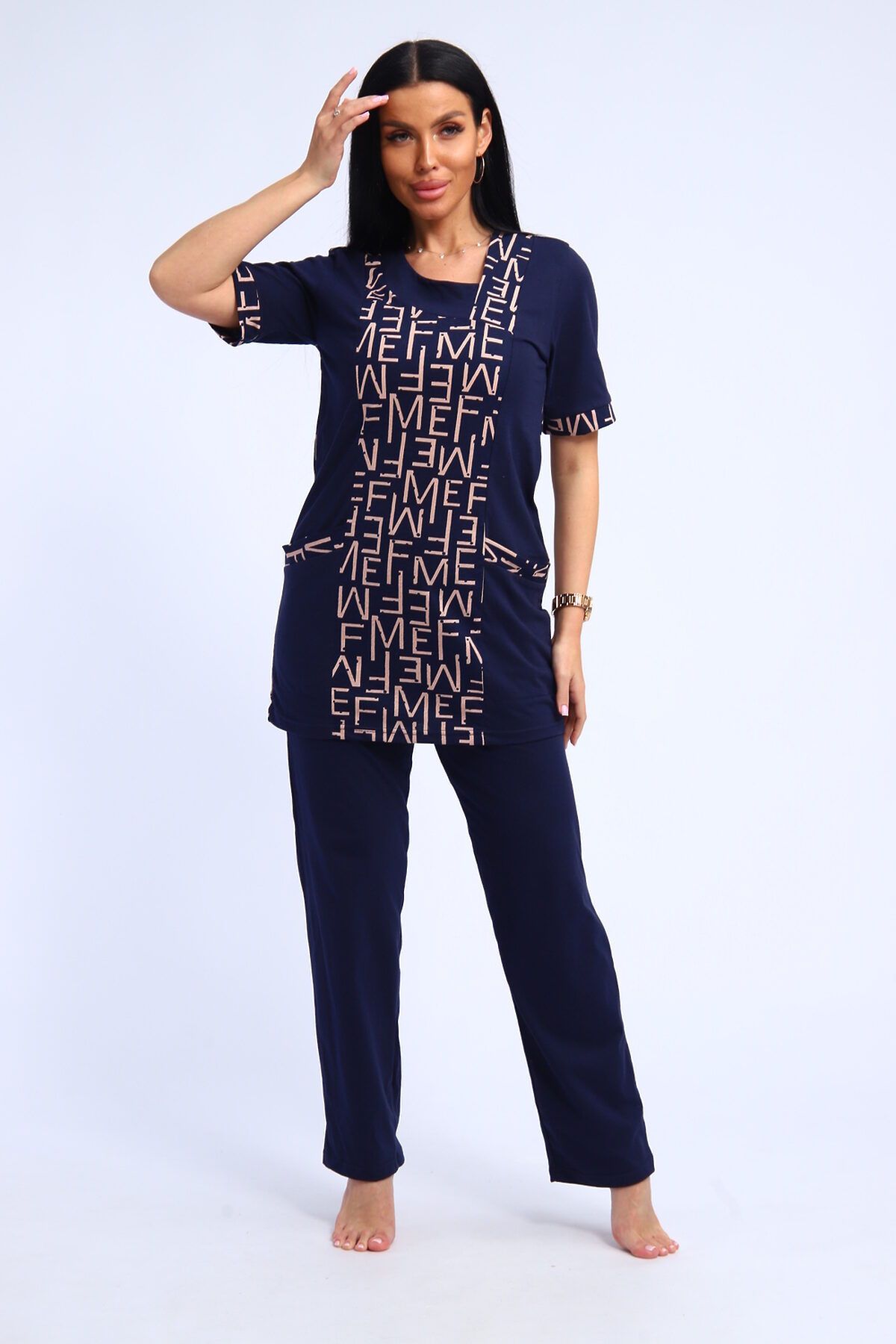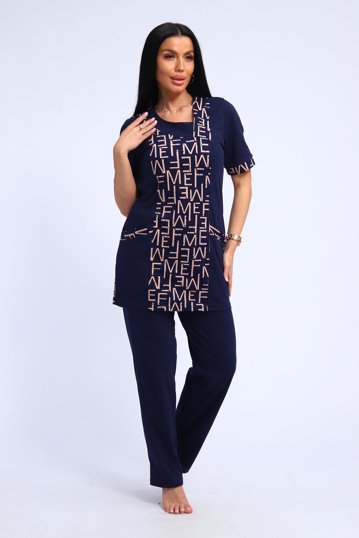 Костюм женский туника и брюки. Брюки прямого кроя. Туника полуприлегающего силуэта с карманами, рукав короткий.