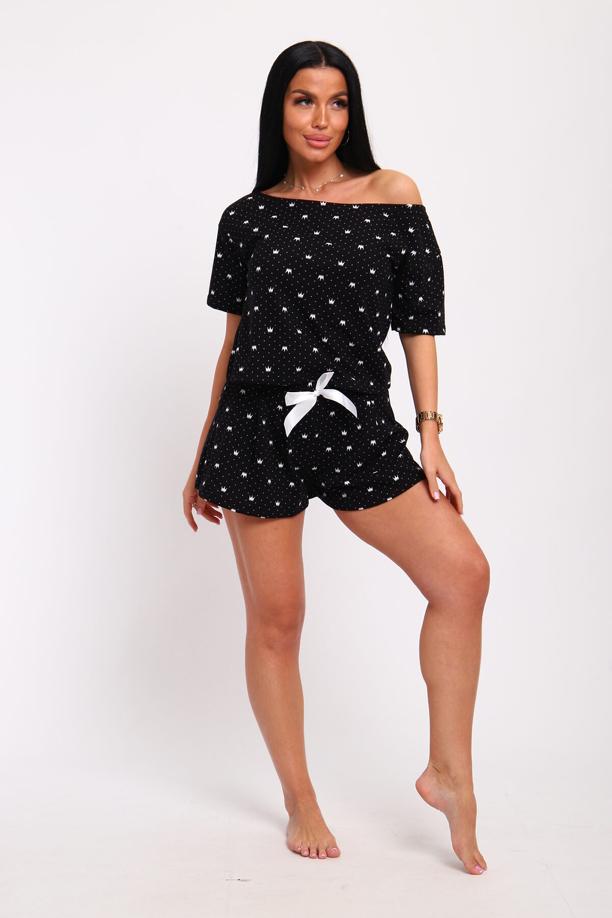 Пижама женская футболка и шорты. Футболка свободного кроя с широким вырезом горловины. Рукав короткий на спущенном плече.