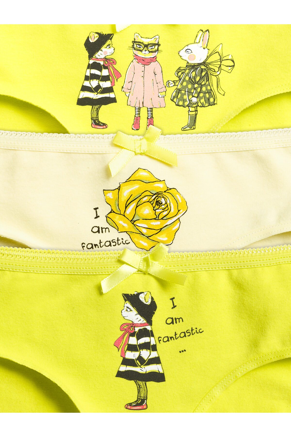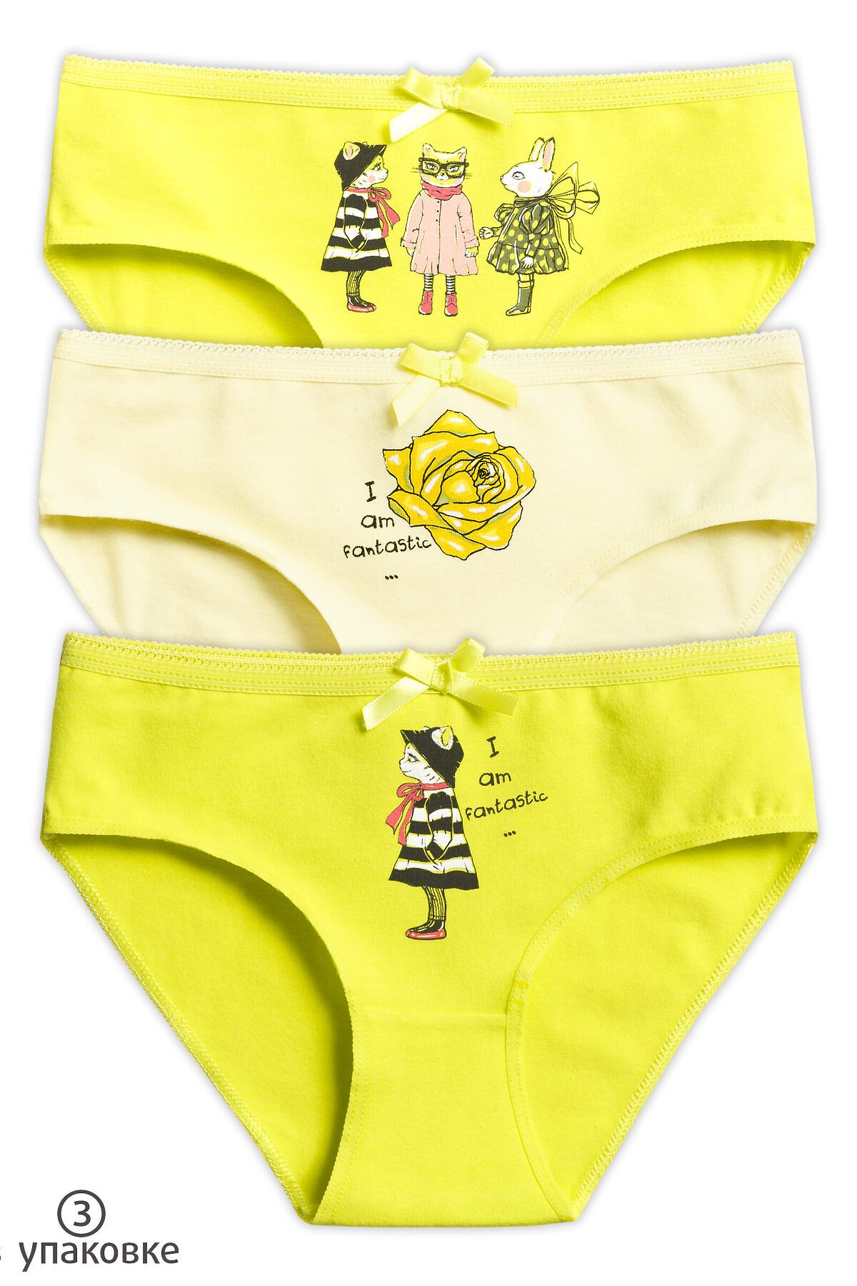 Трусики слипы со средней посадкой для девочек. В комплекте 3 изделия. По талии эластик с фестонным краем, декорирован атласным бантиком. Обработка эластиком по ноге.