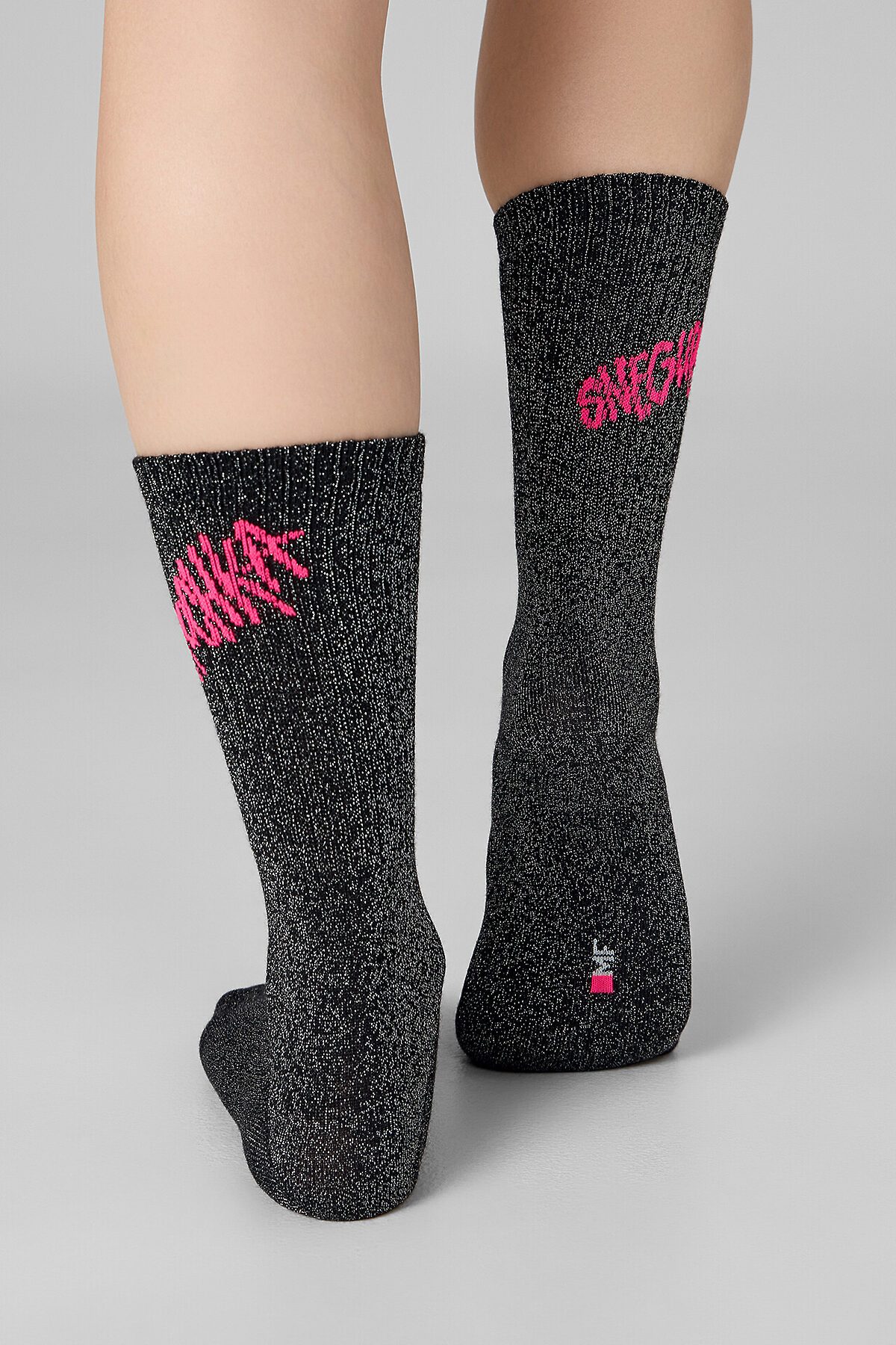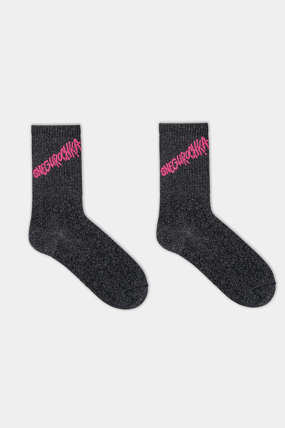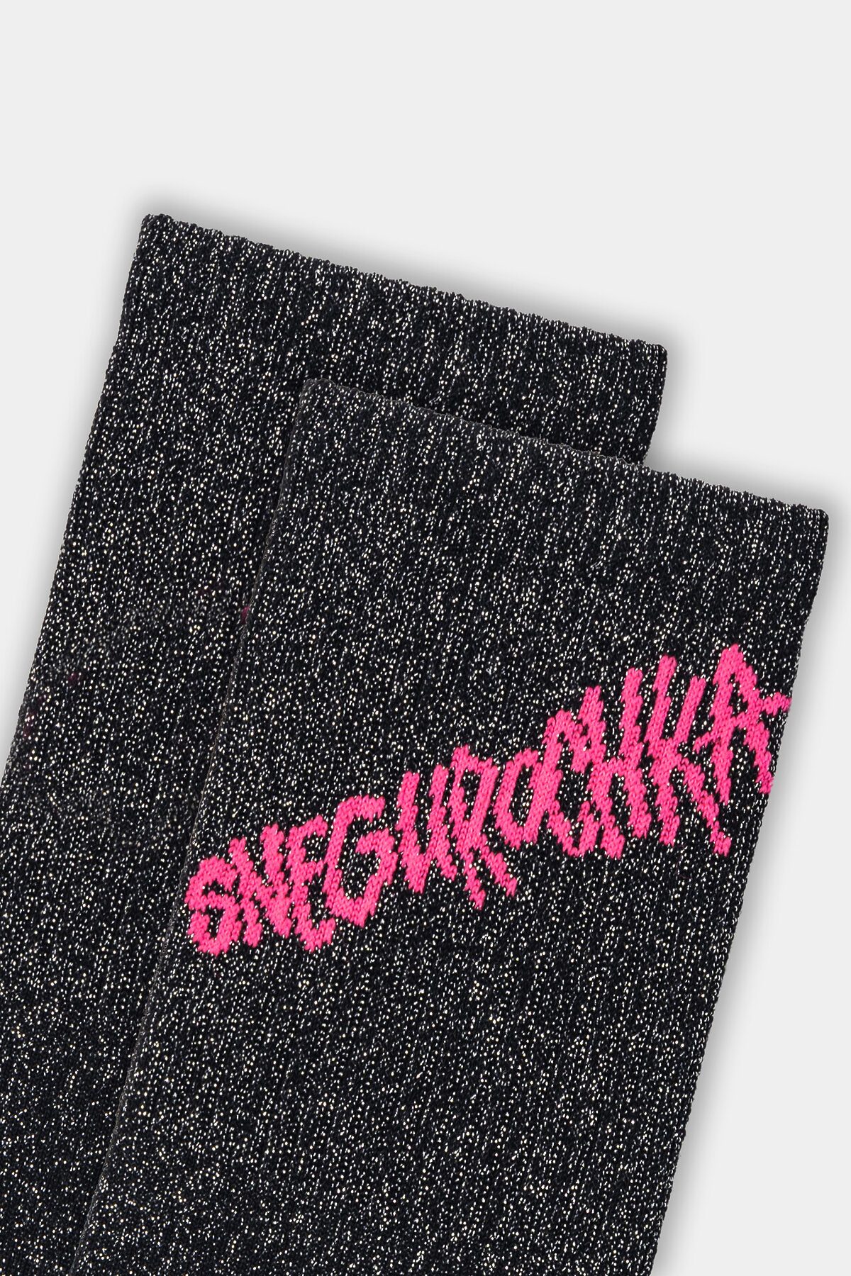 рис.3437 Женские носки высокие с плотным бортом и рисунком в виде надписи "SNEGUROCHKA" с использованием люрекса в основу.