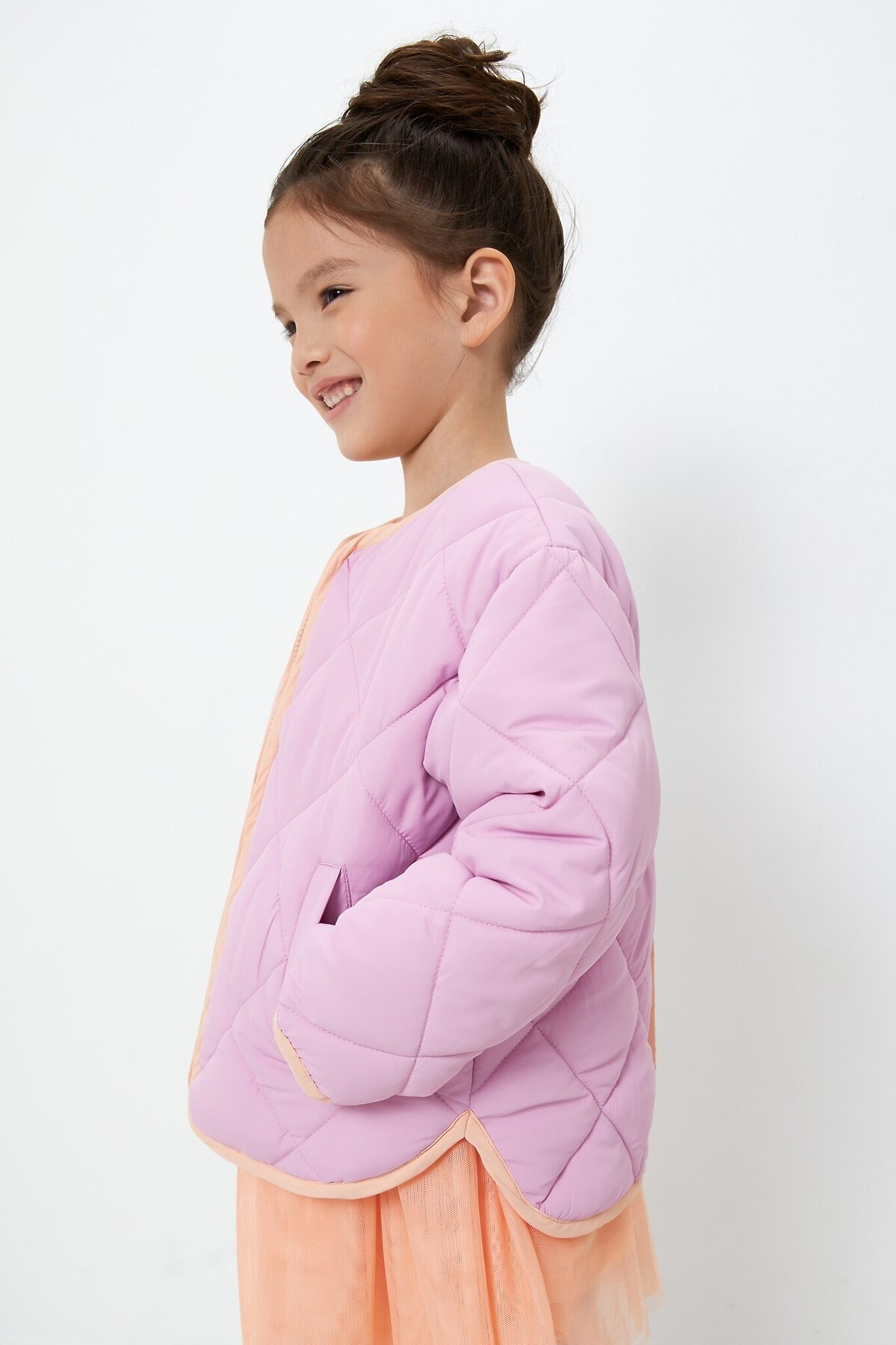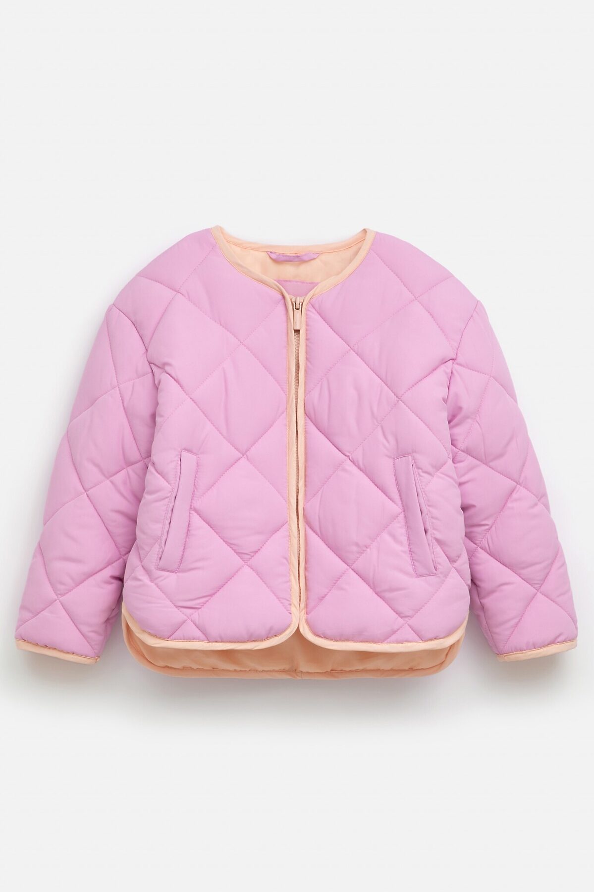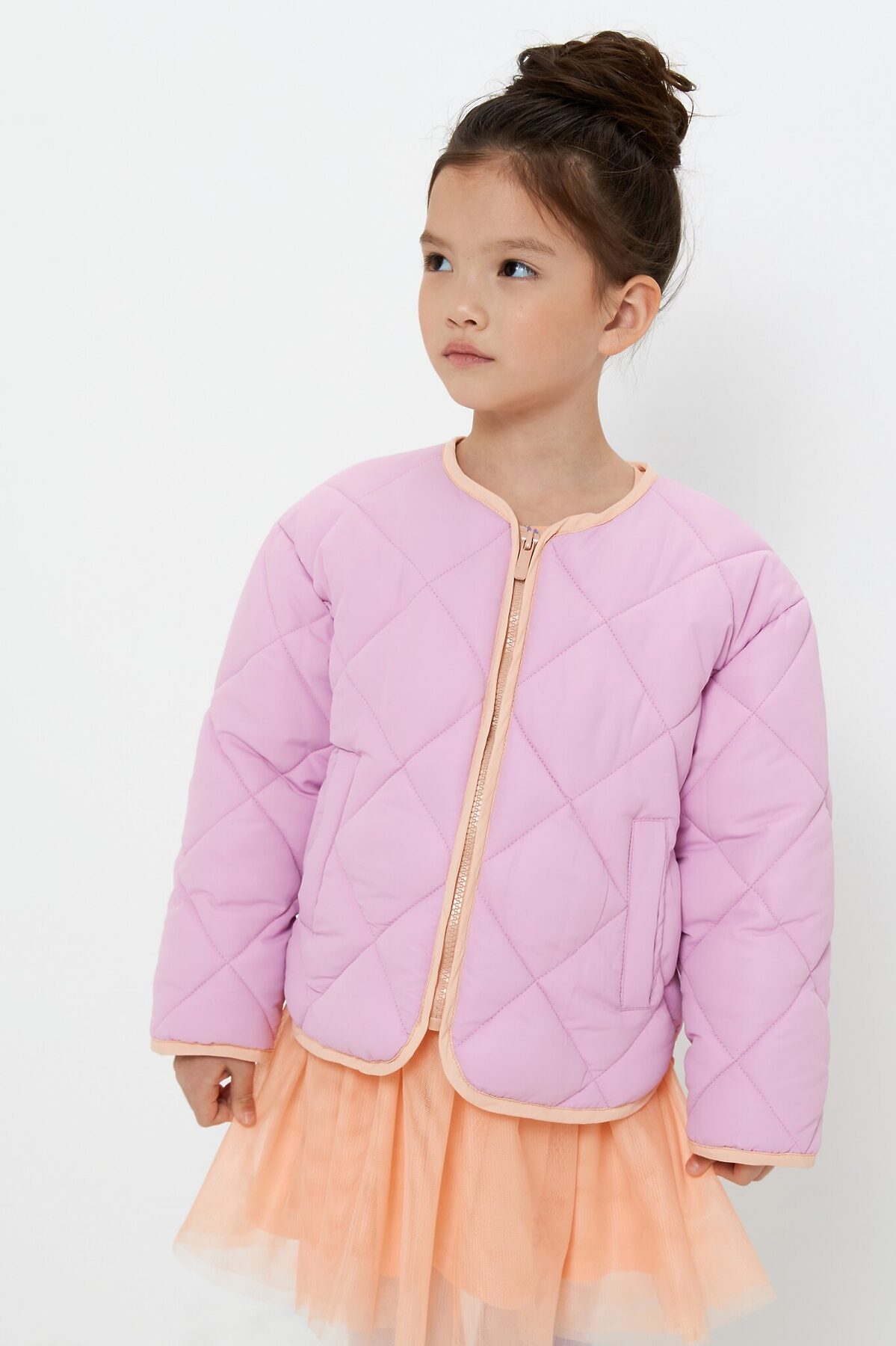 Стеганая утепленная куртка без капюшона для девочки. Выполнена из влагозащитной ткани, утеплена легким, удерживающим тепло искусственным пухом. Мягкая контрастная подкладка выполнена из стандартной подкладочной износостойкой ткани и простегана вместе с вместе с наполнителем и тканью верха. Застежка на контрастную молнию. Низ изделия, капюшон и низ рукавов декорированы контрастной окантовкой. Спереди два прорезных кармана. Рекомендованный температурный режим от -10 до +10 С*. Представлена в цветах: голубой, розовый, цветочный принт. Состав ткани верха: полиэстер – 100%. Плотность ткани: 60 гр/м2. Состав ткани подклада: полиэстер – 100%. Плотность ткани: 65 гр/м2. Состав утеплителя: полиэстер – 100%. Плотность ткани: 200 гр/м2. Рост/размер одежды модели на фото: 110. *Температурный режим носит рекомендательный характер. Ощущение тепла и холода зависит от теплообмена ребенка.
