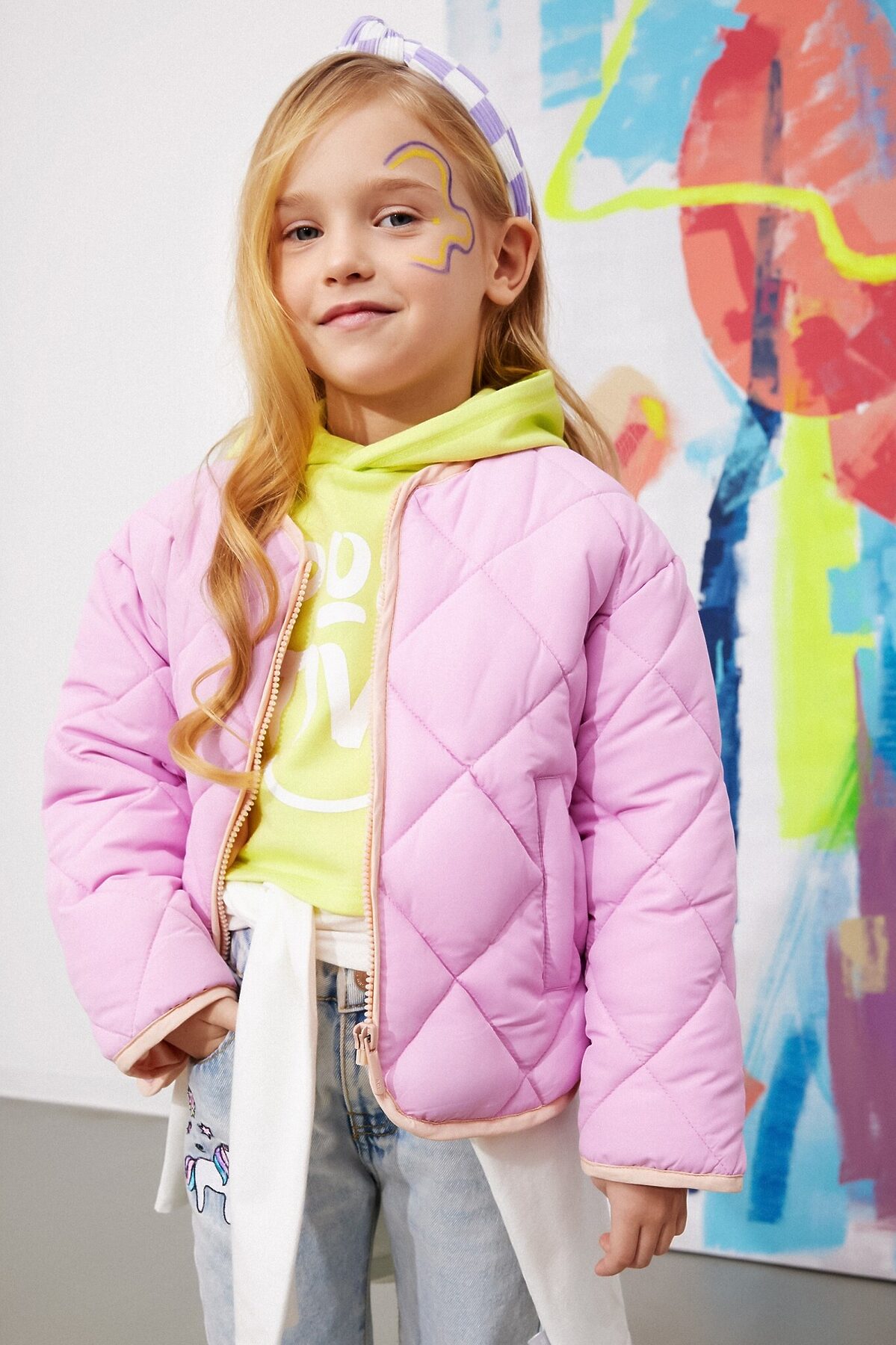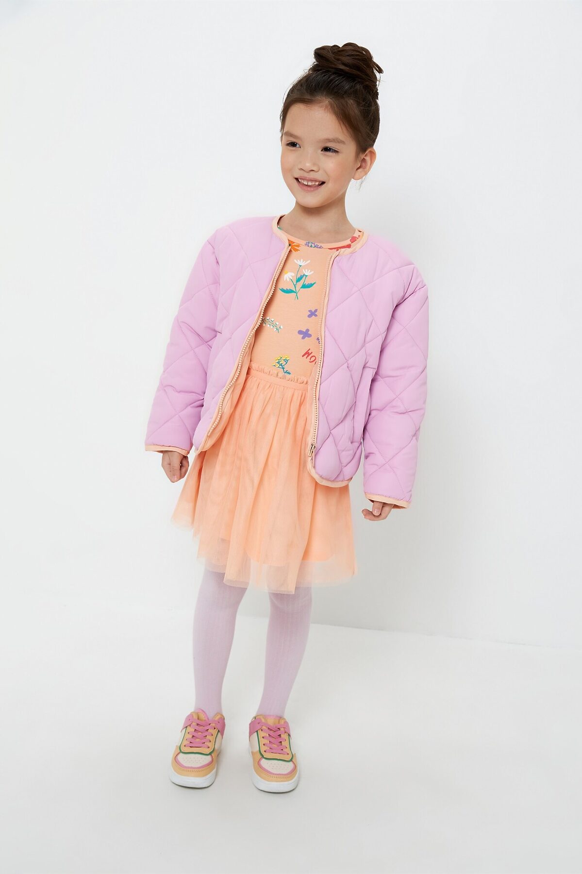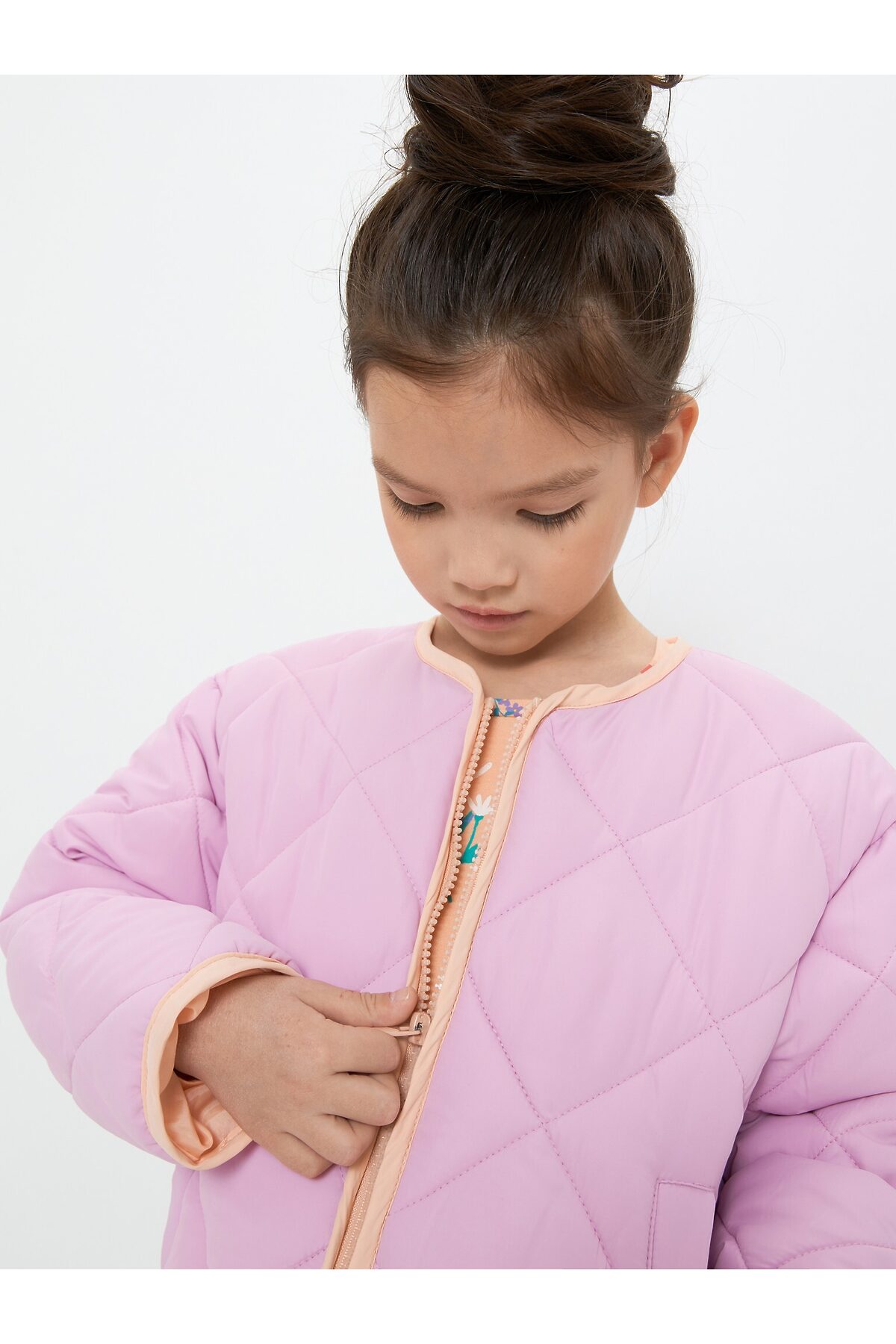 Стеганая утепленная куртка без капюшона для девочки. Выполнена из влагозащитной ткани, утеплена легким, удерживающим тепло искусственным пухом. Мягкая контрастная подкладка выполнена из стандартной подкладочной износостойкой ткани и простегана вместе с вместе с наполнителем и тканью верха. Застежка на контрастную молнию. Низ изделия, капюшон и низ рукавов декорированы контрастной окантовкой. Спереди два прорезных кармана. Рекомендованный температурный режим от -10 до +10 С*. Представлена в цветах: голубой, розовый, цветочный принт. Состав ткани верха: полиэстер – 100%. Плотность ткани: 60 гр/м2. Состав ткани подклада: полиэстер – 100%. Плотность ткани: 65 гр/м2. Состав утеплителя: полиэстер – 100%. Плотность ткани: 200 гр/м2. Рост/размер одежды модели на фото: 110. *Температурный режим носит рекомендательный характер. Ощущение тепла и холода зависит от теплообмена ребенка.