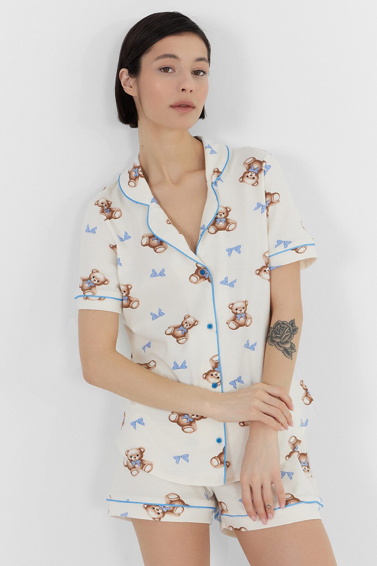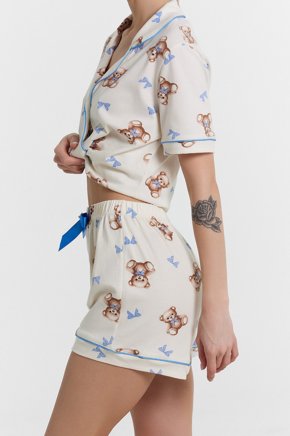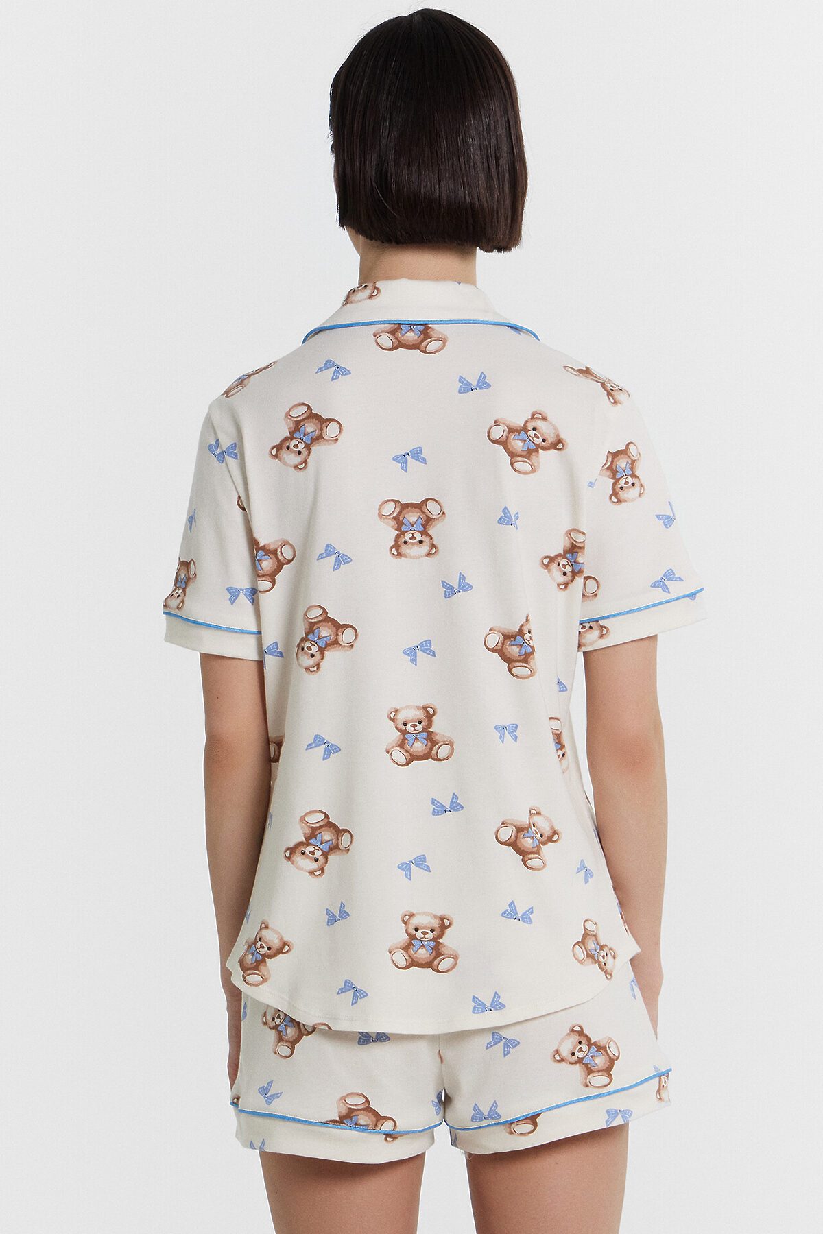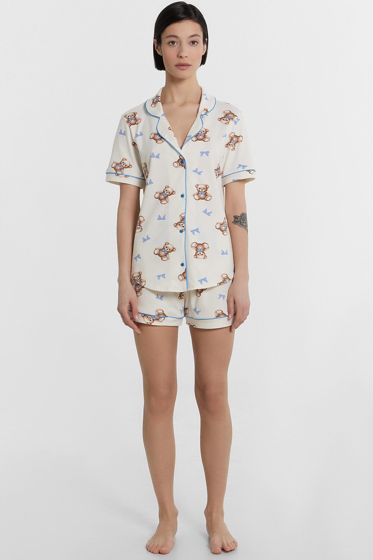 Хлопковый женский комплект актуального свободного силуэта. Рубашка прямая, с отложным воротником и лацканами, короткими рукавами, застегивается на пуговицы. Дополняют ее свободные шорты длины мини, с резиновой тесьмой в поясе и атласной тесьмой, которая завязывается на бантик. Особенность модели – контрастные канты на рукавах, воротнике и передней части рубашки. Рекомендуем для сна, отдыха и домашних дел!