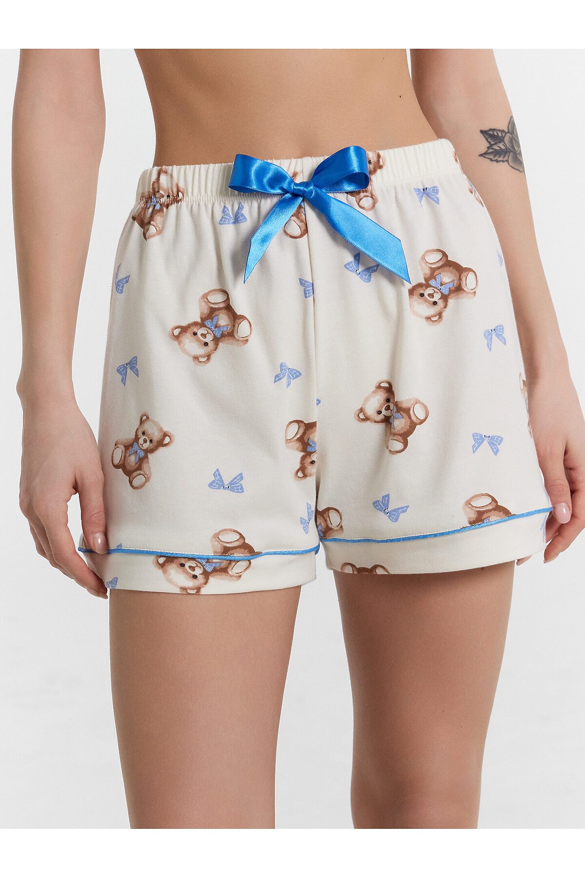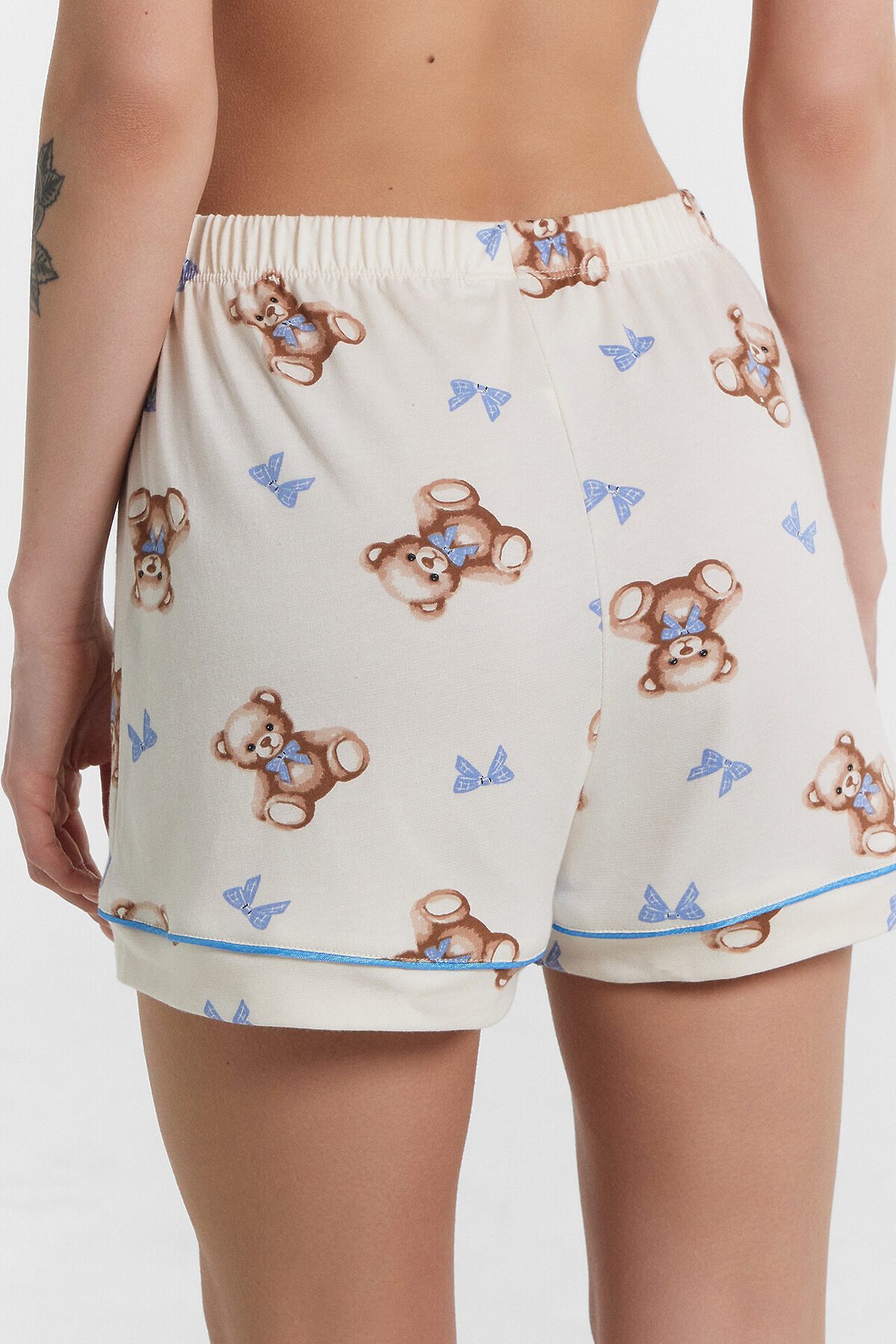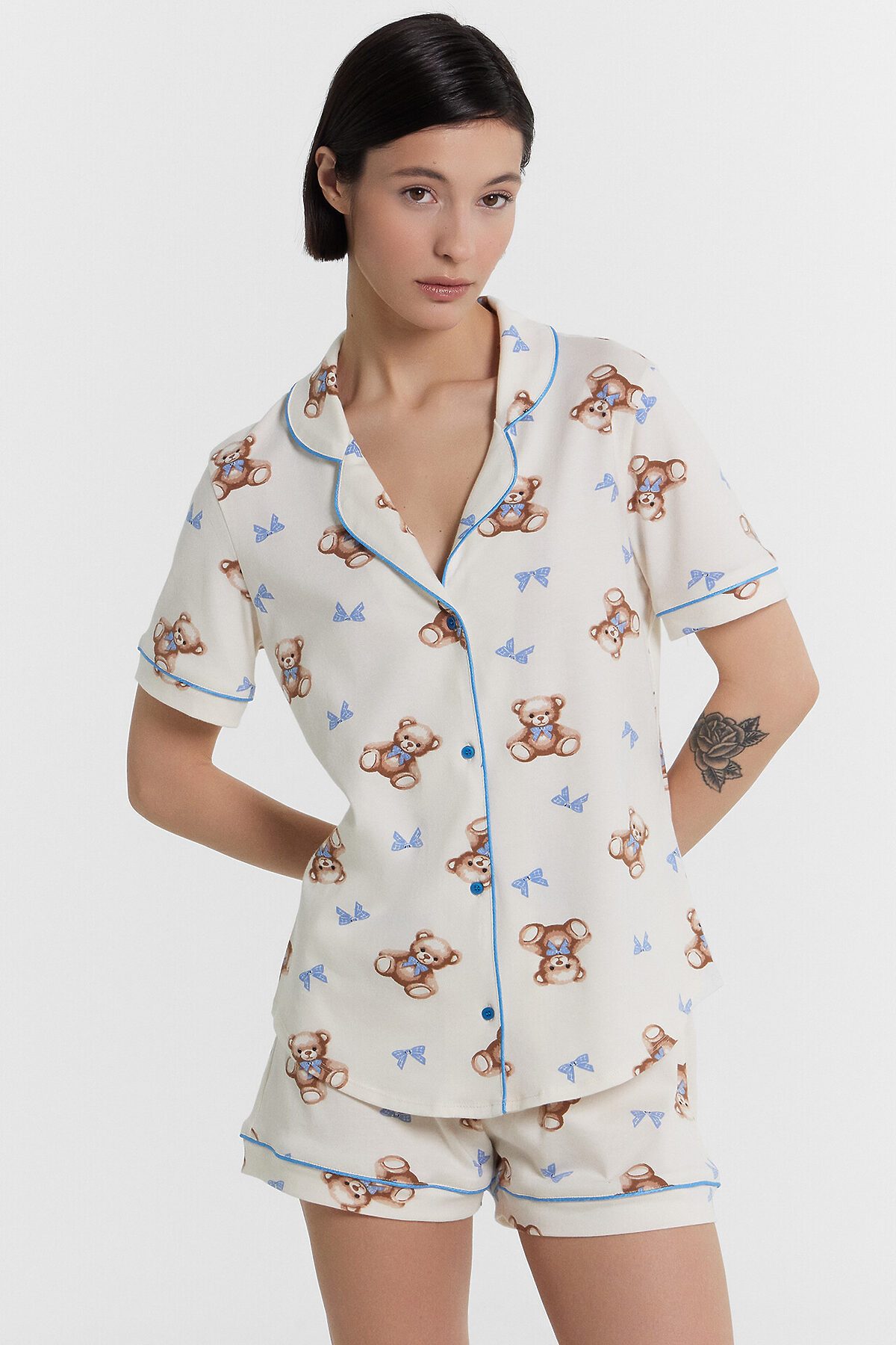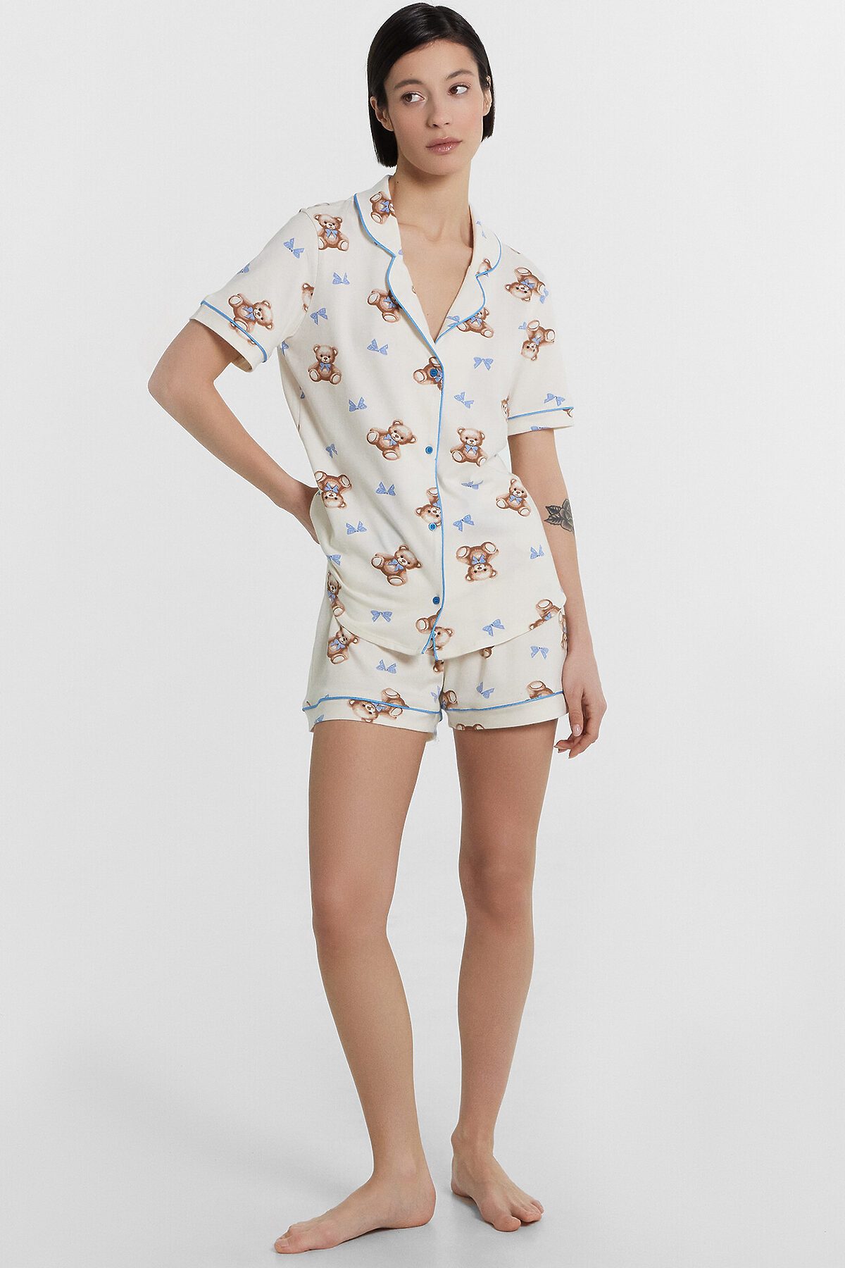Хлопковый женский комплект актуального свободного силуэта. Рубашка прямая, с отложным воротником и лацканами, короткими рукавами, застегивается на пуговицы. Дополняют ее свободные шорты длины мини, с резиновой тесьмой в поясе и атласной тесьмой, которая завязывается на бантик. Особенность модели – контрастные канты на рукавах, воротнике и передней части рубашки. Рекомендуем для сна, отдыха и домашних дел!