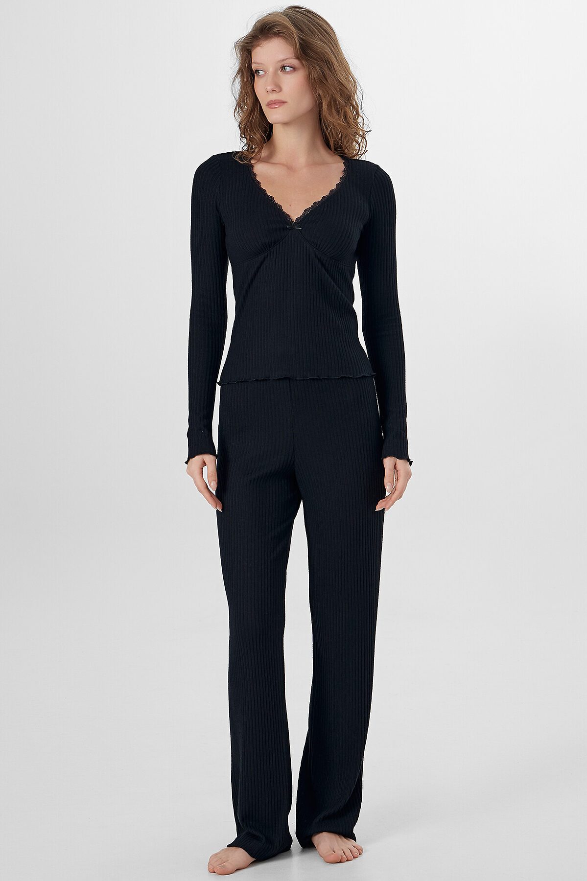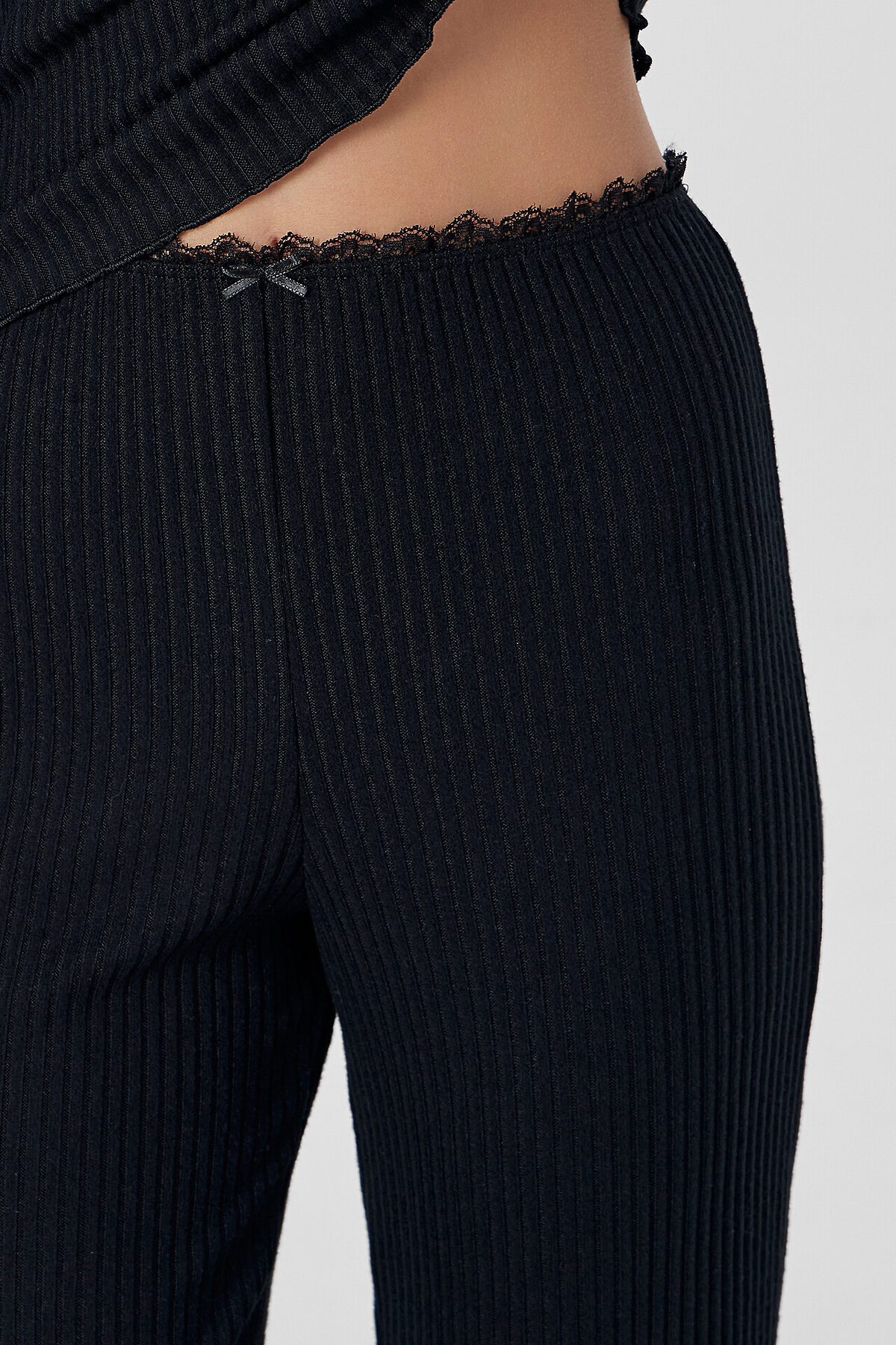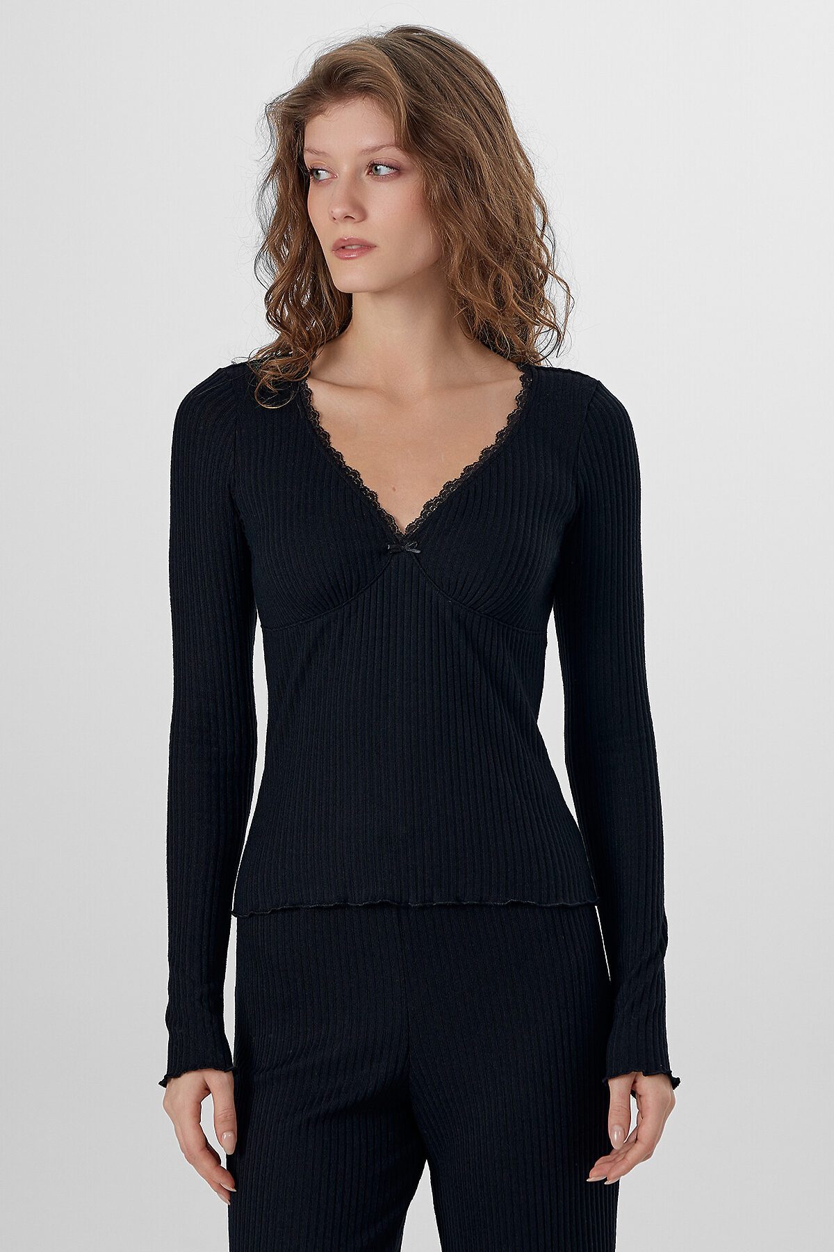 Джемпер женский прилегающего силуэта. Перед с подрезом под грудью, со сборкой. Горловина V-образной формы окантована эл тесьмой с зубом 1.5см (1914 devsel новая) арт. L141-1.5. Рукав втачной, длинный. Низ изделия и рукавов обработаны на микрооверлоке. Декор бантик. Брюки прямого силуэта. Пояс окантован эл тесьмой с зубом 1.5см (1914 devsel новая) арт. L141-1.5. Низ изделия обработан швом в подгибку. Декор бантик 6737-0011А.