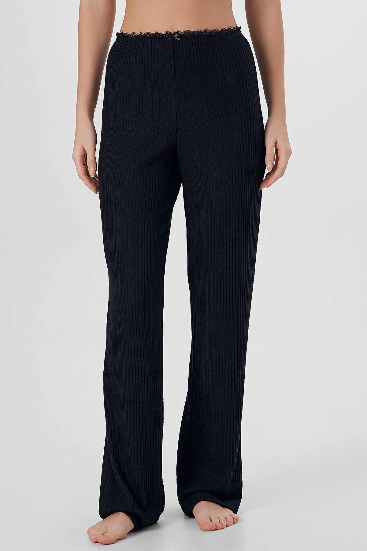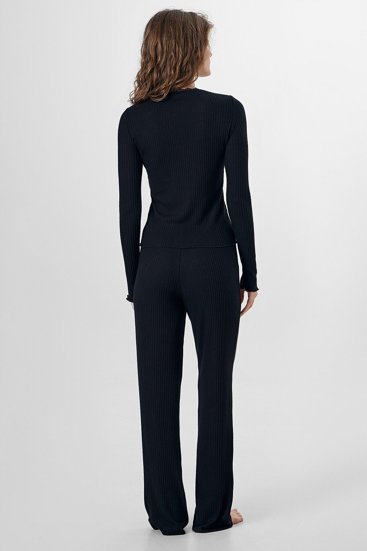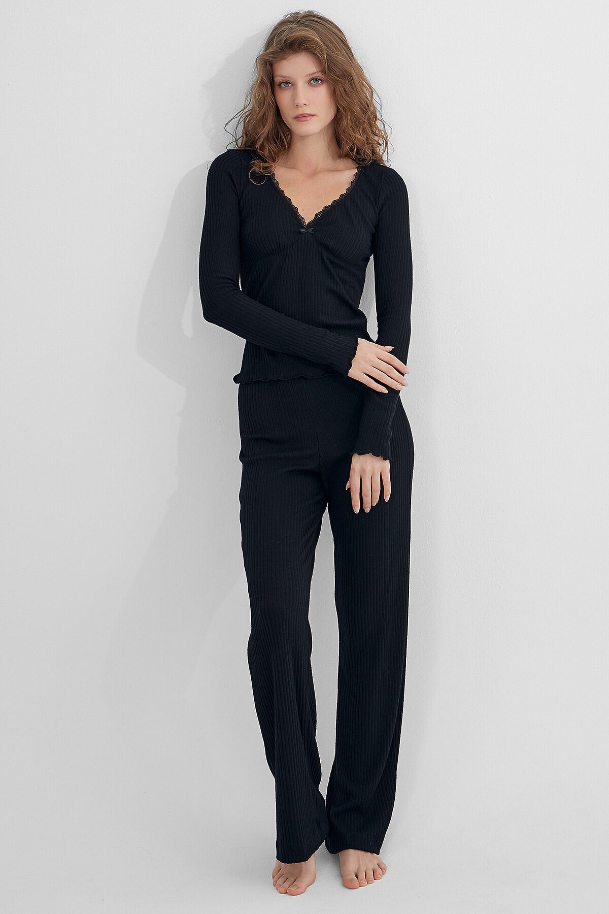 Джемпер женский прилегающего силуэта. Перед с подрезом под грудью, со сборкой. Горловина V-образной формы окантована эл тесьмой с зубом 1.5см (1914 devsel новая) арт. L141-1.5. Рукав втачной, длинный. Низ изделия и рукавов обработаны на микрооверлоке. Декор бантик. Брюки прямого силуэта. Пояс окантован эл тесьмой с зубом 1.5см (1914 devsel новая) арт. L141-1.5. Низ изделия обработан швом в подгибку. Декор бантик 6737-0011А.