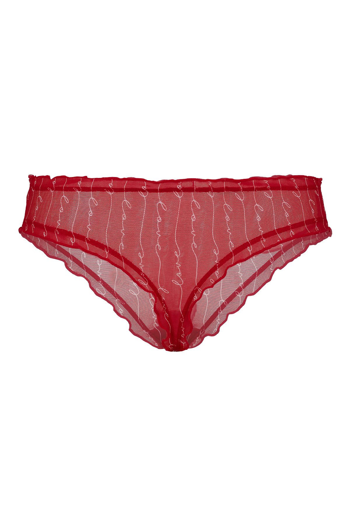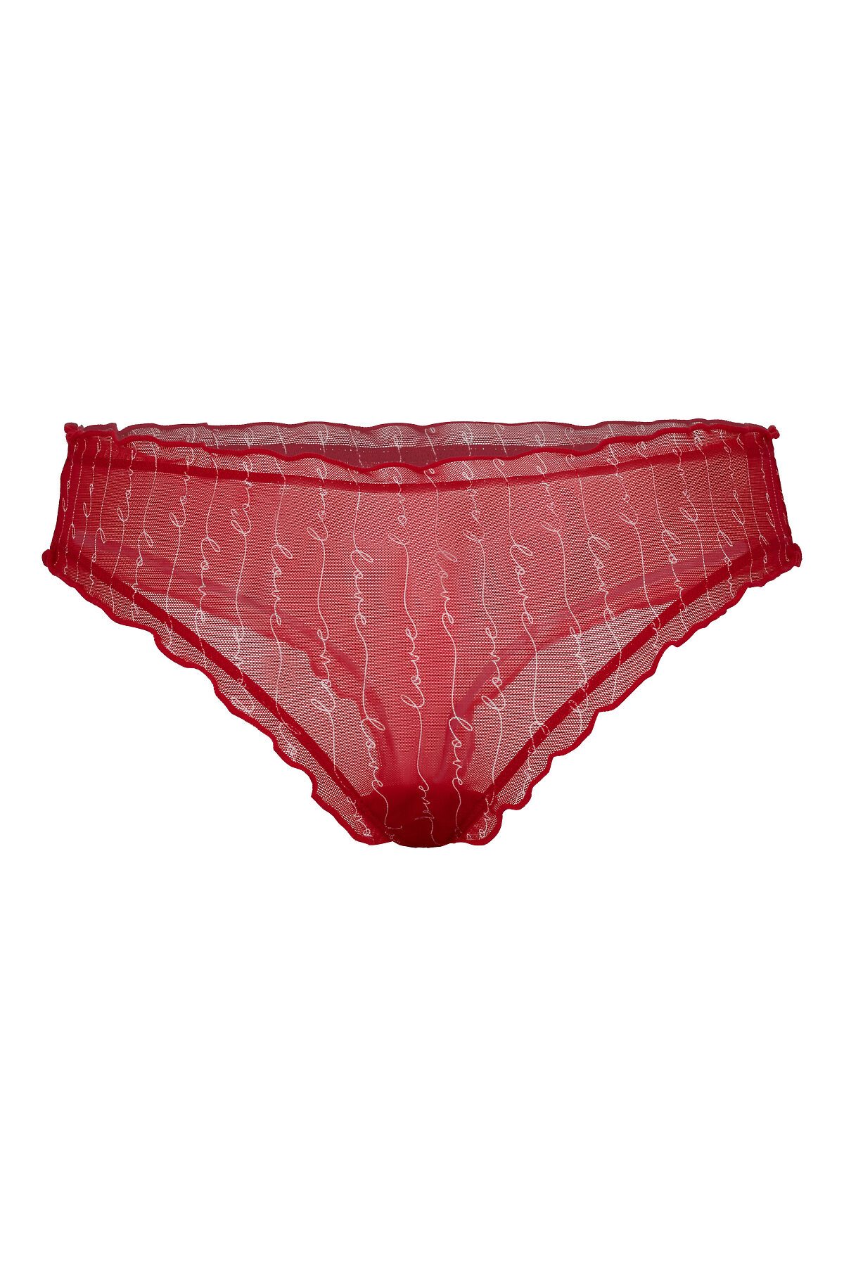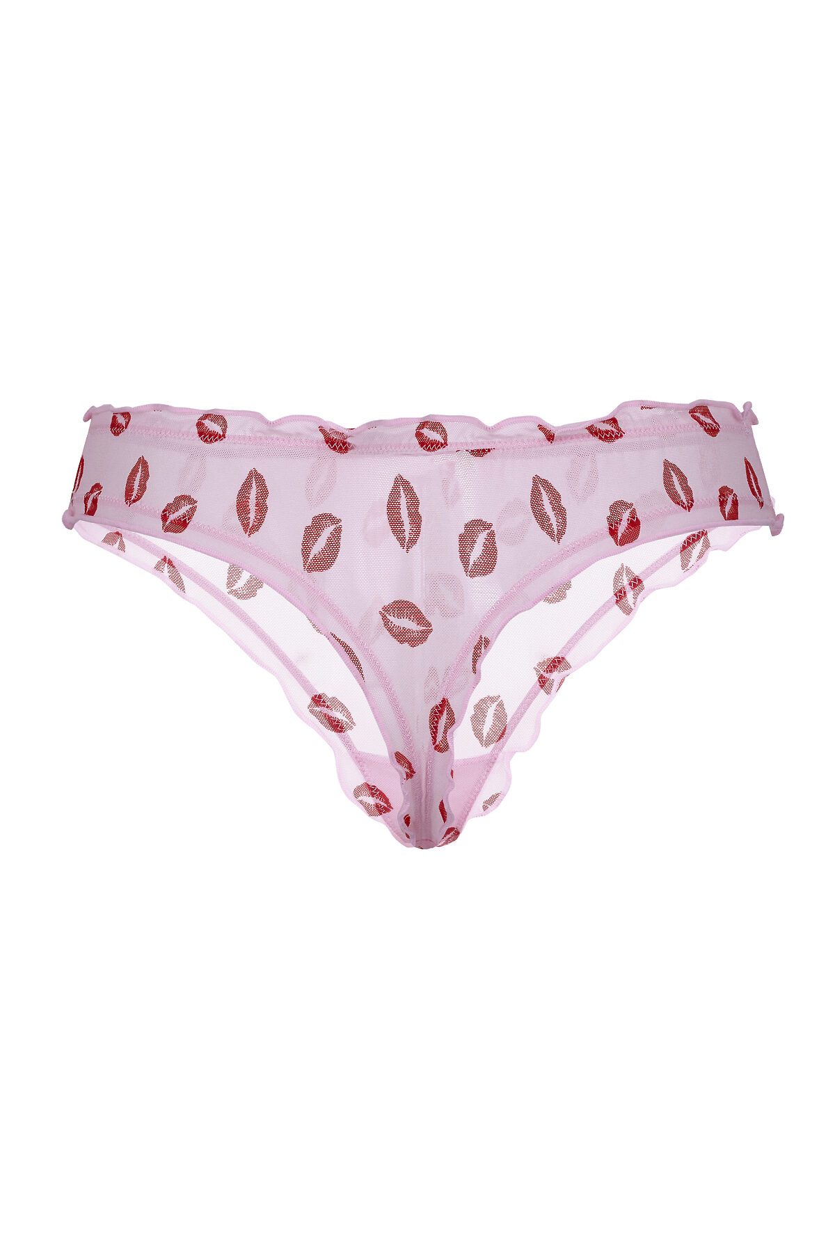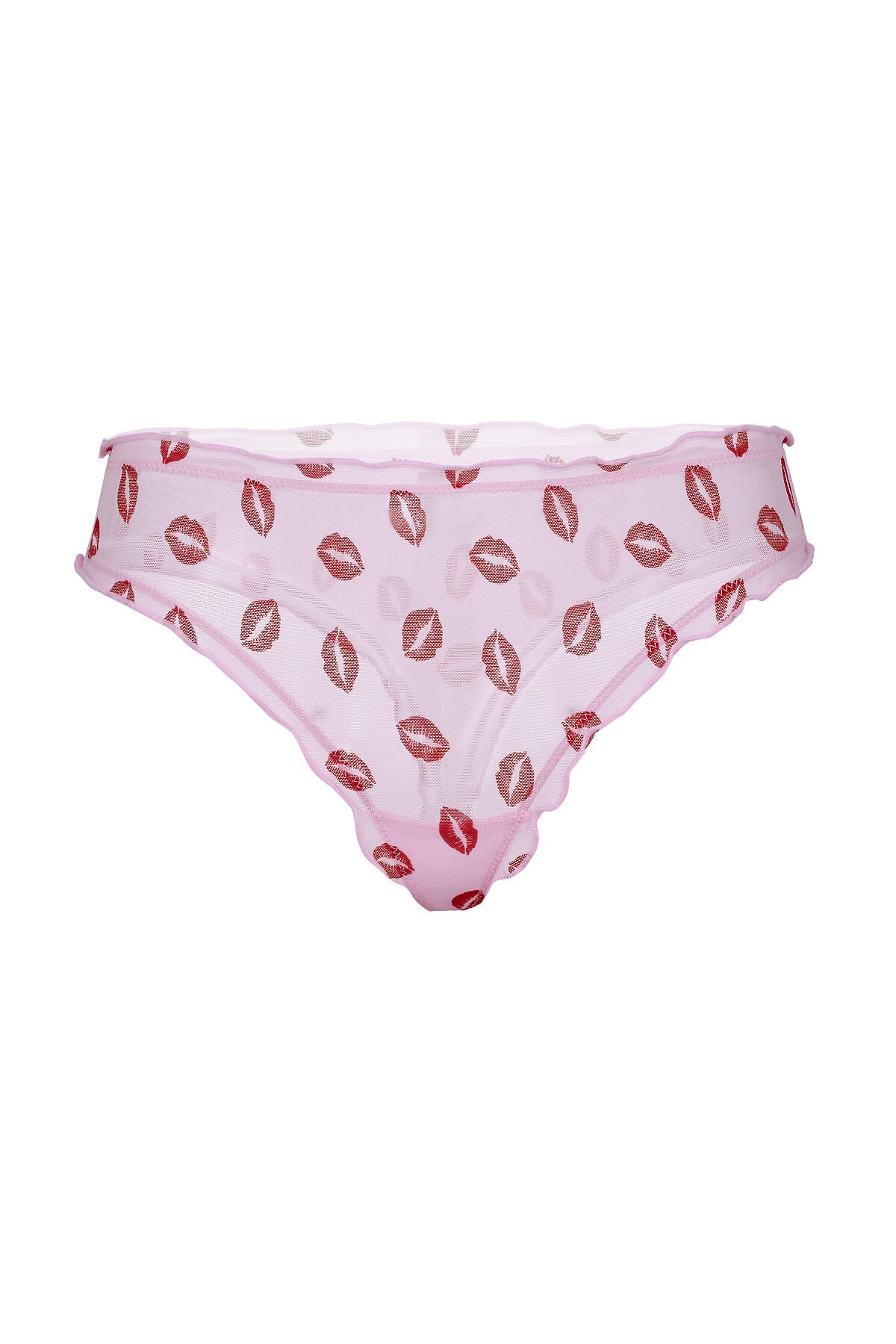 Трусики brazilian со средней посадкой выполнены из мягкой принтованой сетки. Нежная резинка по талии и краю ножек с рюшами. Набор в подарочной коробочке с сердечком состоит из двух трусиков в разных цветах : нежно-розового с принтом "поцелуй" и красного с надписью "love". Ластовица из хлопка.