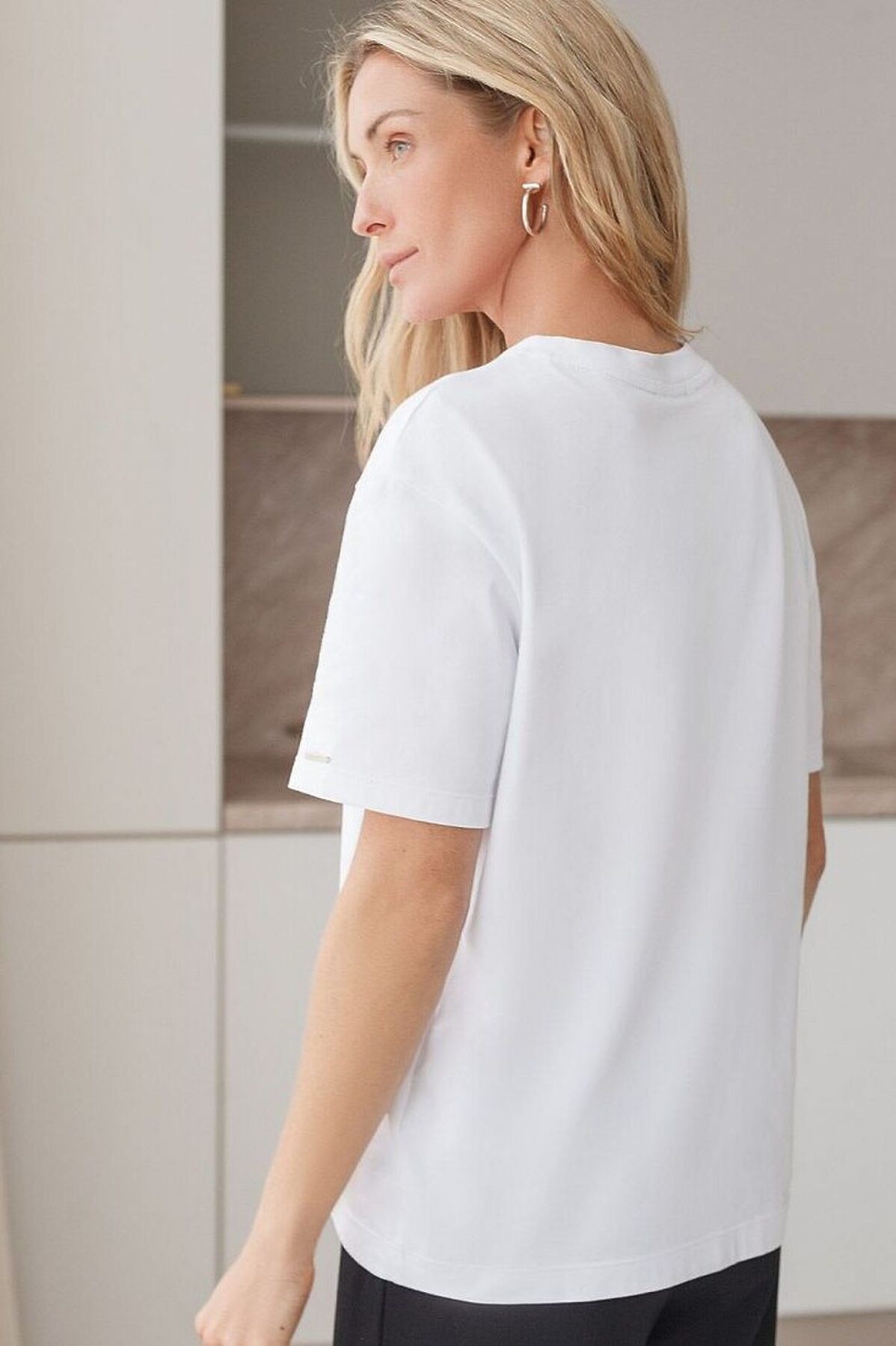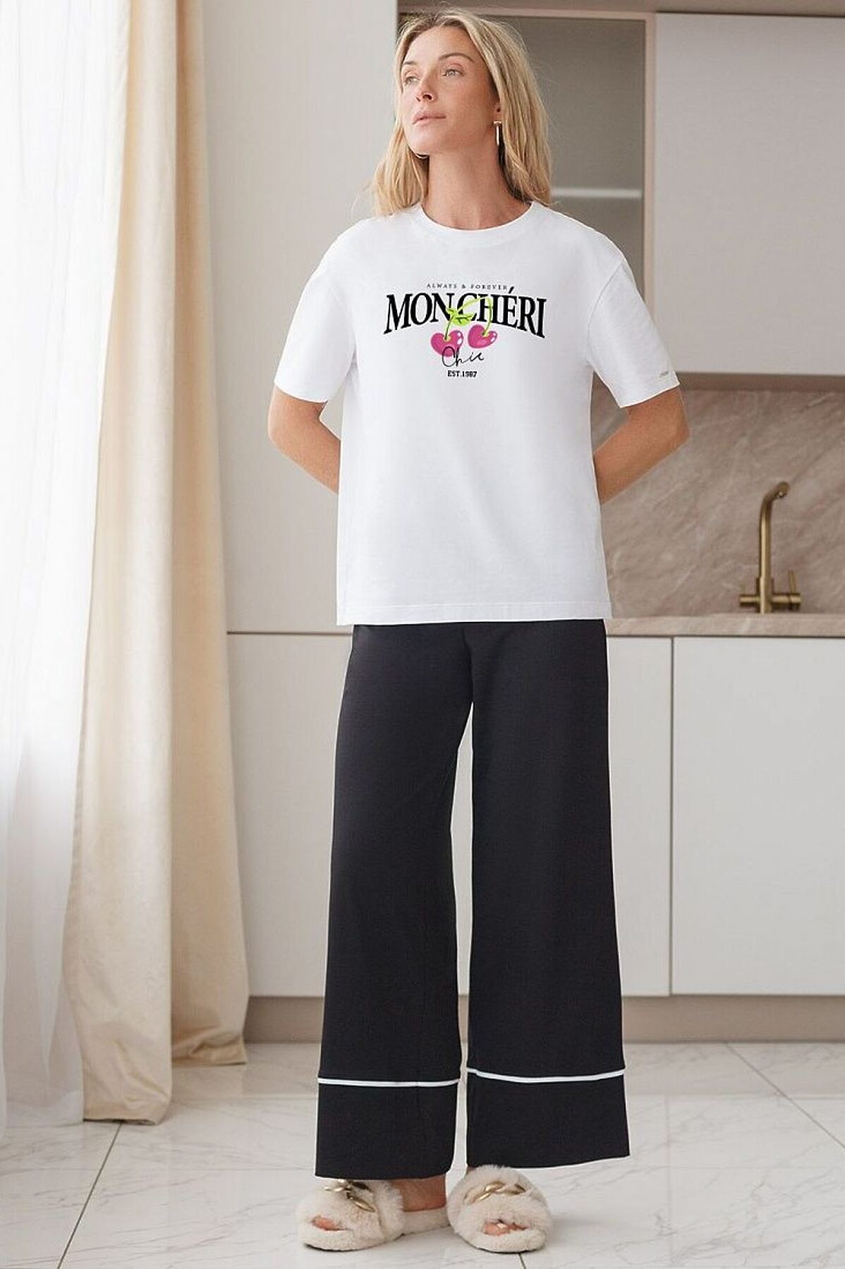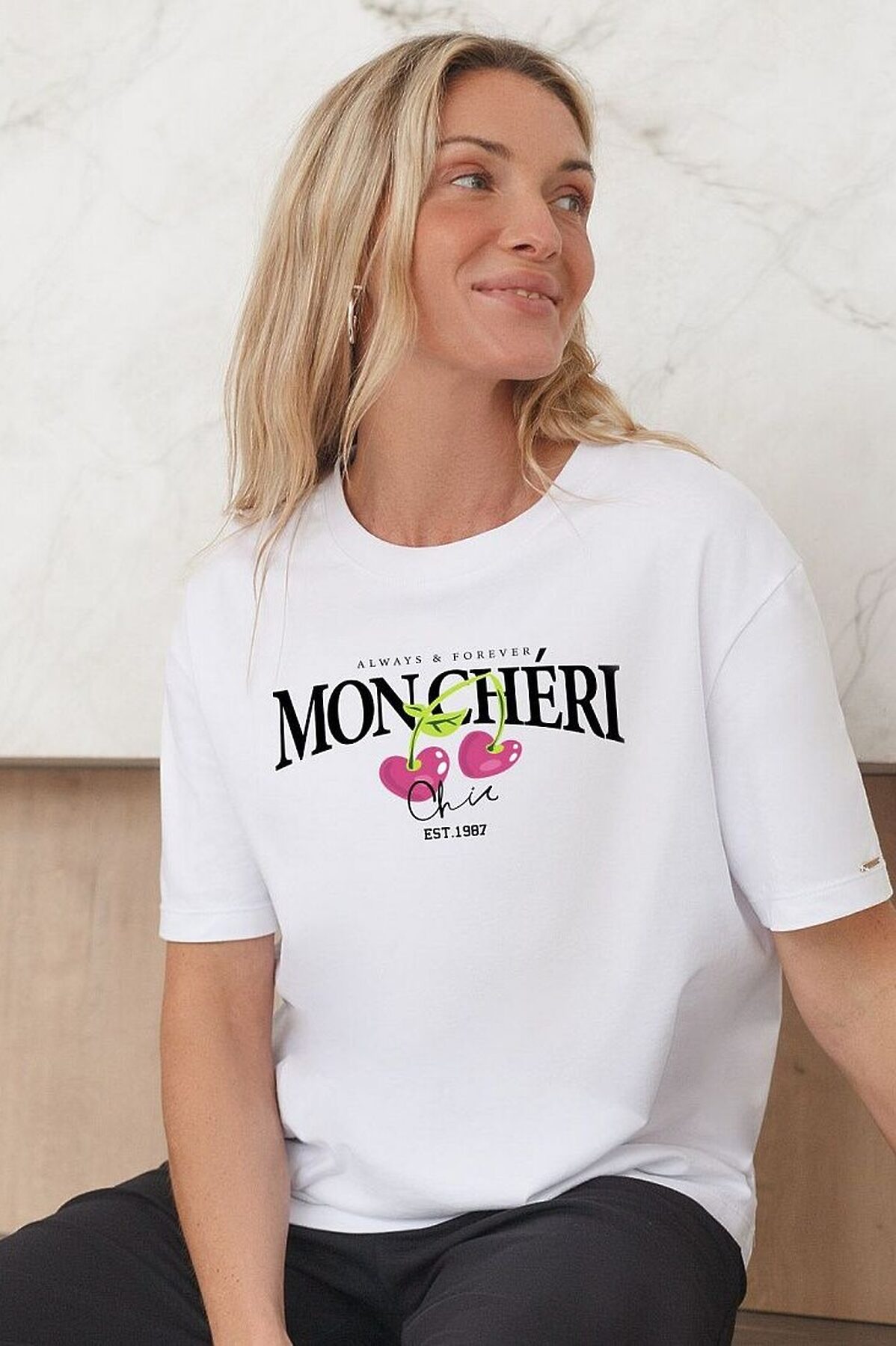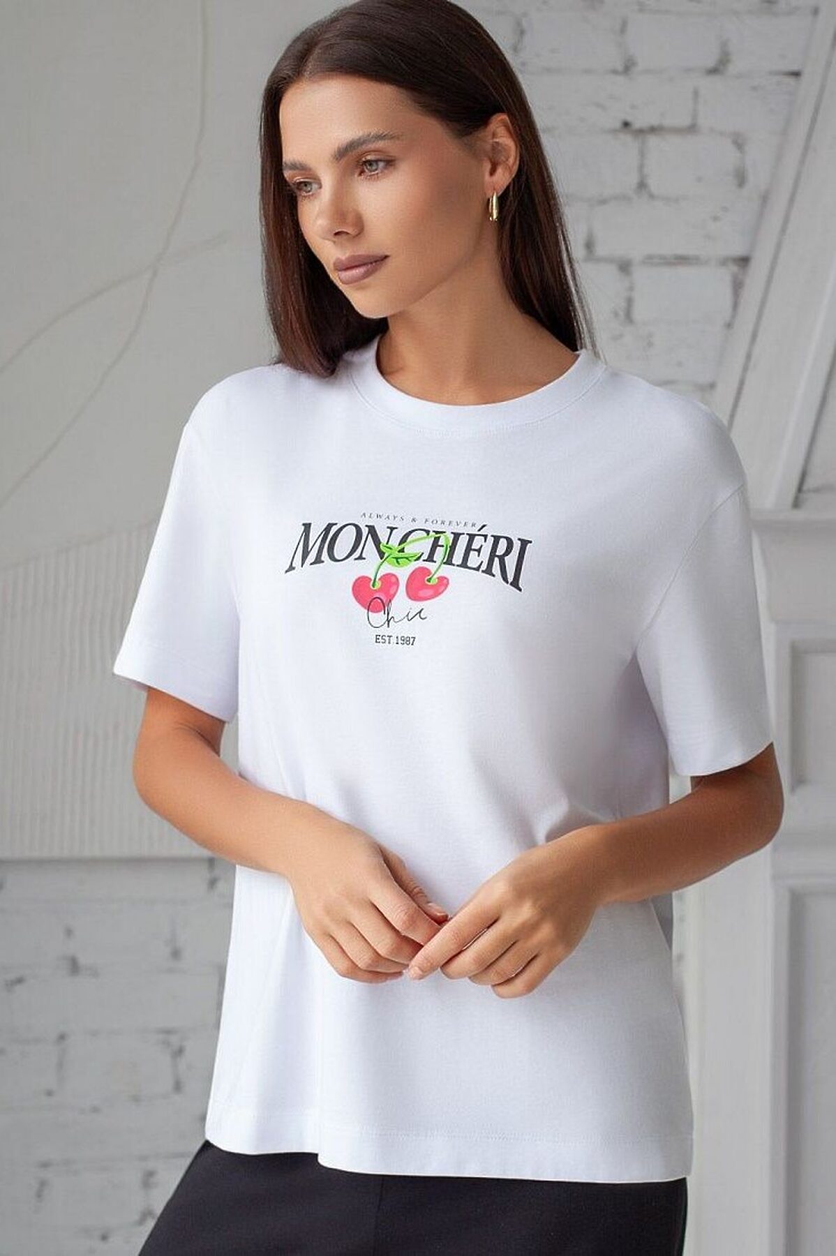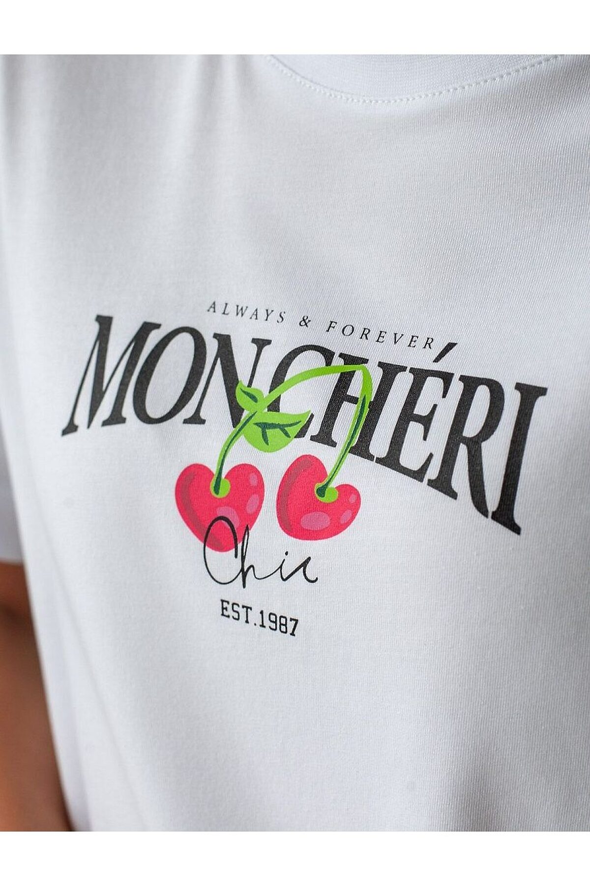 Футболка белого цвета изготовлена из премиального хлопка с эластаном, она обеспечивает невероятное ощущение уюта и легкости. Натуральный материал сохраняет форму и цвет после множества стирок, обеспечивая долговечность изделия, а его высокая воздухопроницаемость создает ощущение свежести даже в течение долгого дня. Особое внимание привлекает стильный принт в виде ягод вишни с минималистичной надписью. Перевод надписи Always and Forever Moncheri - Всегда и Навсегда Мончери. Принт выполнен красками с устойчивым покрытием, который добавляет изделию оригинальности и позволяет выразить индивидуальность. Свободный крой футболки дарит удобство и не стесняет движений, что делает ее идеальной для повседневной носки или активного отдыха, подчеркивает современный взгляд на моду. На рукаве металлический логотип бренда. Подойдет девушкам и женщинам на любую фигуру, вы будете чувствовать себя в ней уверенно и комфортно. Отлично впишется в гардероб благодаря универсальному дизайну, который легко сочетать с джинсами, шор
