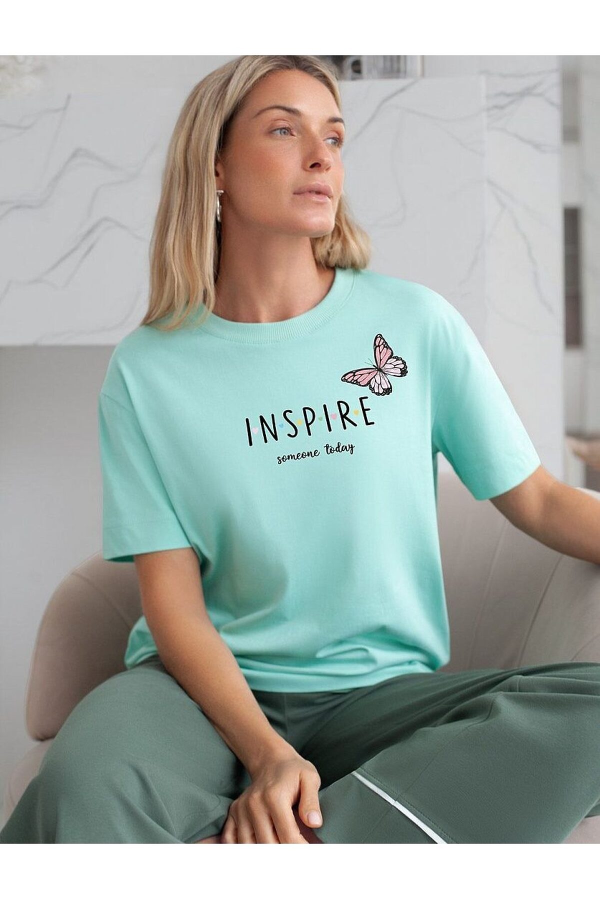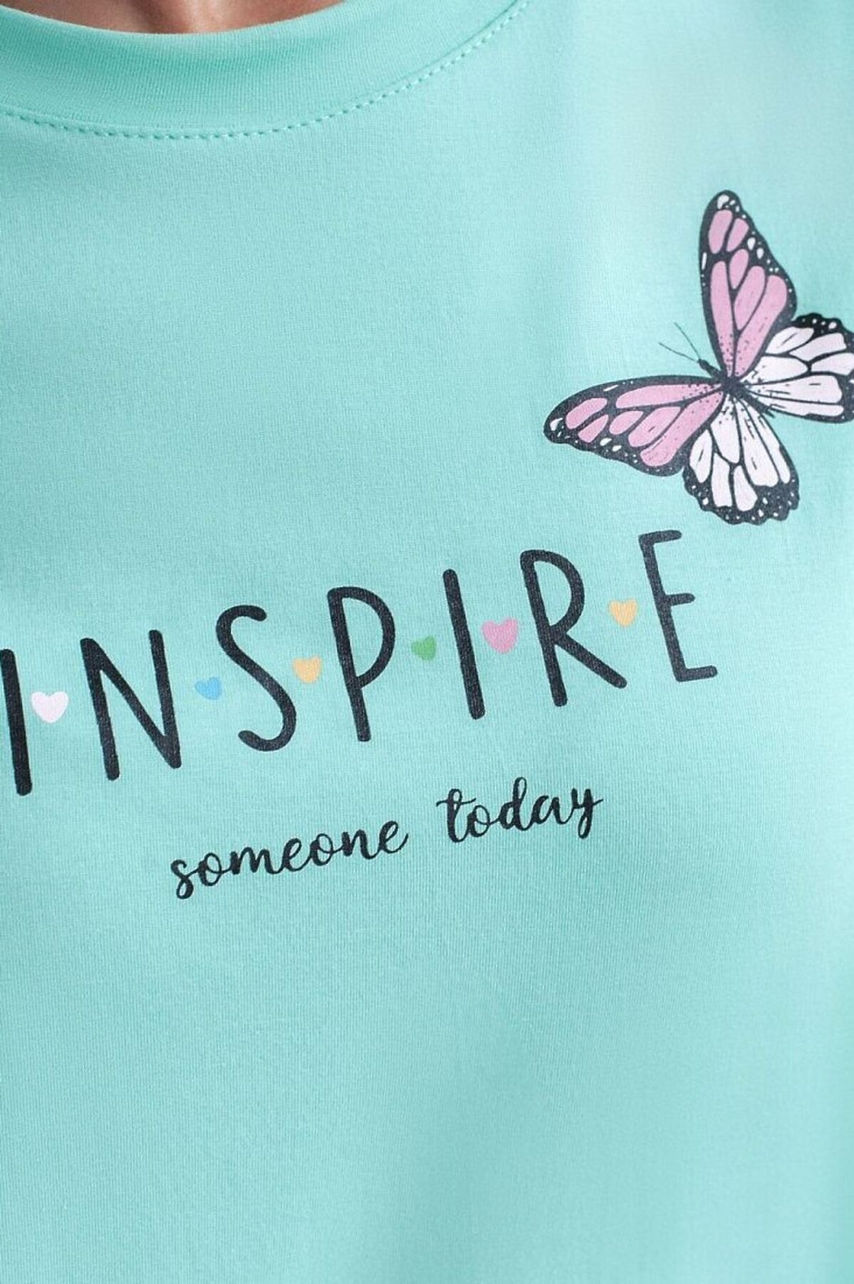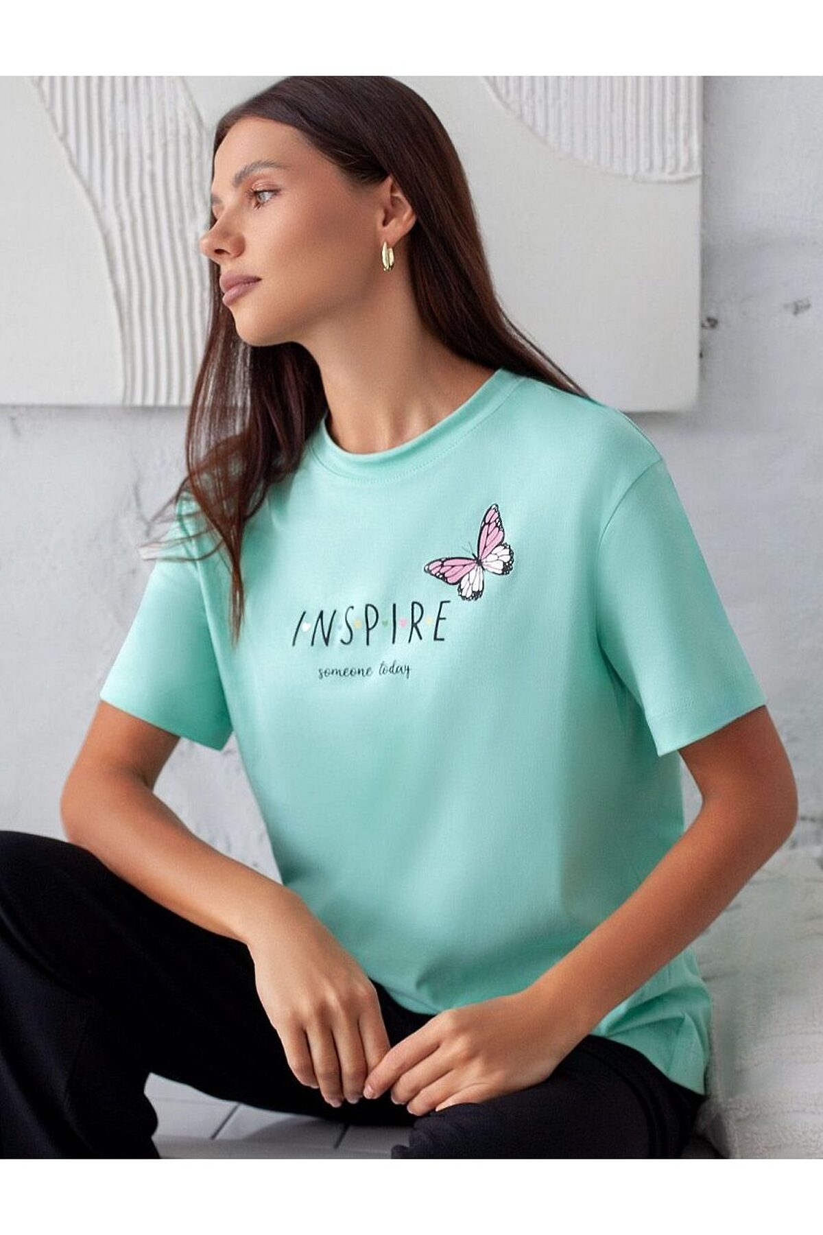 Футболка мятного цвета изготовлена из премиального хлопка с эластаном, она обеспечивает невероятное ощущение уюта и легкости. Натуральный материал сохраняет форму и цвет после множества стирок, обеспечивая долговечность изделия, а его высокая воздухопроницаемость создает ощущение свежести даже в течение долгого дня. Особое внимание привлекает стильный принт в виде бабочки с минималистичной надписью, перевод надписи Inspire Someone Today - Вдохновите кого-нибудь сегодня . Принт выполненны красками с устойчивым покрытием, который добавляет изделию оригинальности и позволяет выразить индивидуальность. Свободный крой футболки дарит удобство и не стесняет движений, что делает ее идеальной для повседневной носки или активного отдыха, подчеркивает современный взгляд на моду. На рукаве металлический логотип бренда. Подойдет девушкам и женщинам на любую фигуру, вы будете чувствовать себя в ней уверенно и комфортно. Отлично впишется в гардероб благодаря универсальному дизайну, который легко сочетать с джинсами, шор