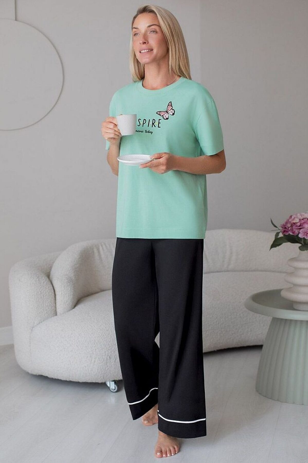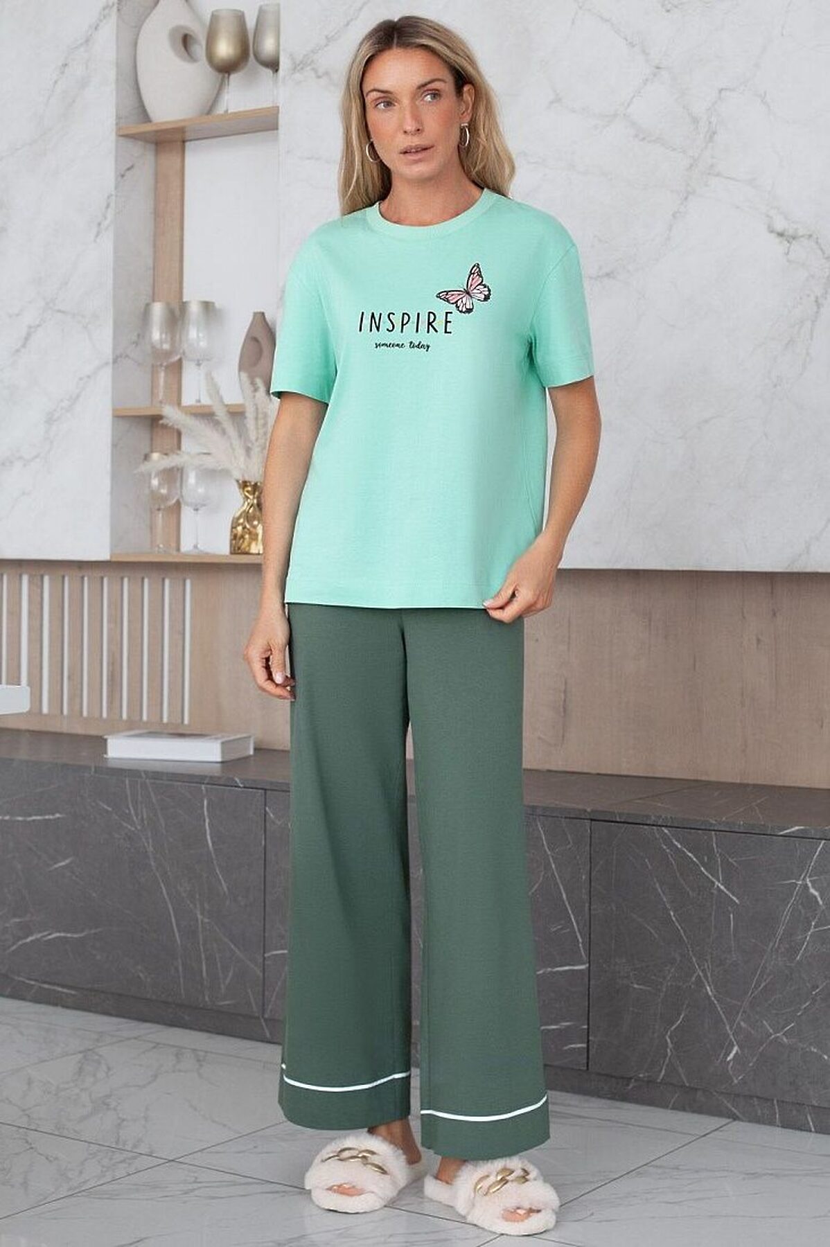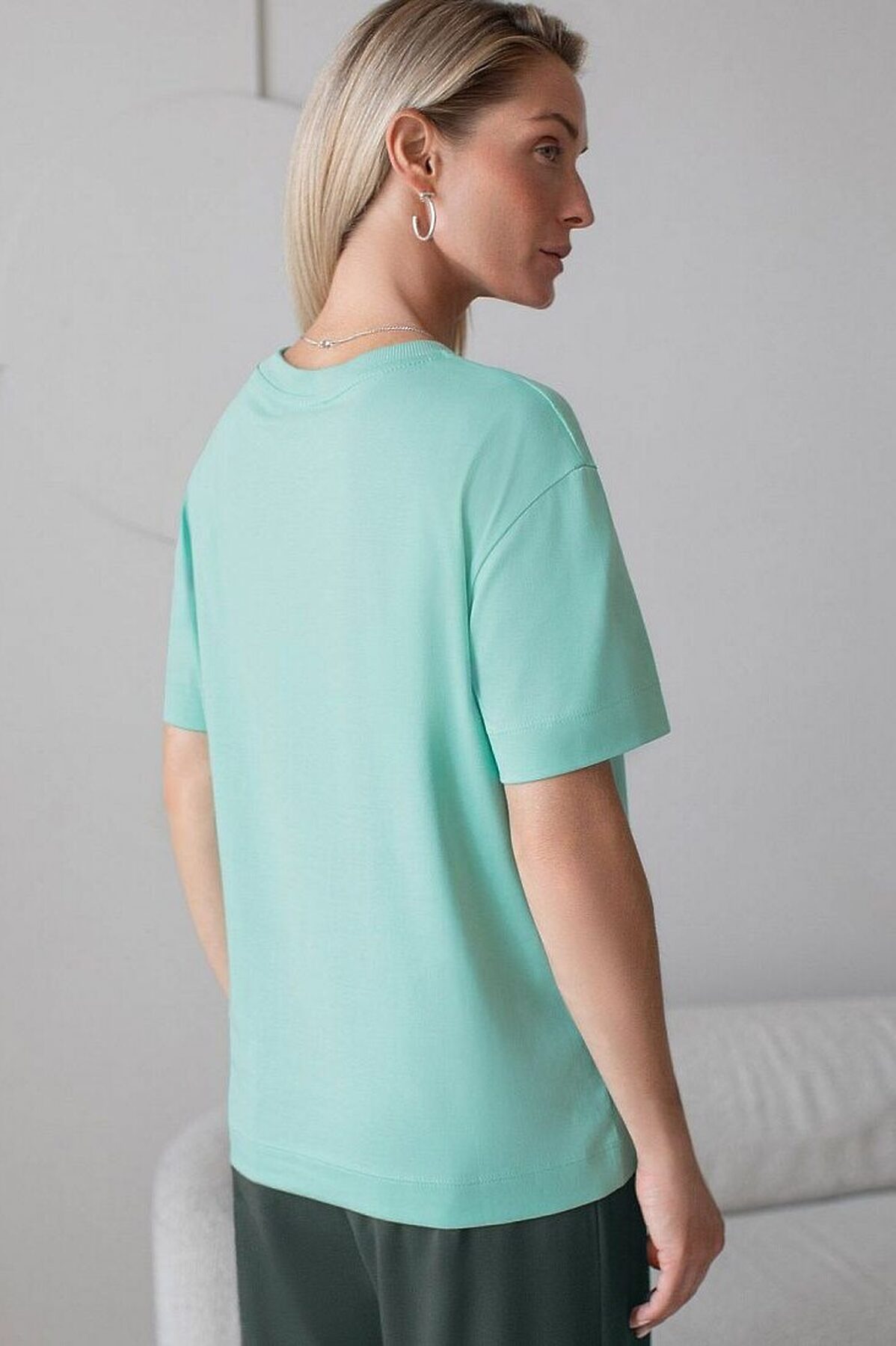 Футболка мятного цвета изготовлена из премиального хлопка с эластаном, она обеспечивает невероятное ощущение уюта и легкости. Натуральный материал сохраняет форму и цвет после множества стирок, обеспечивая долговечность изделия, а его высокая воздухопроницаемость создает ощущение свежести даже в течение долгого дня. Особое внимание привлекает стильный принт в виде бабочки с минималистичной надписью, перевод надписи Inspire Someone Today - Вдохновите кого-нибудь сегодня . Принт выполненны красками с устойчивым покрытием, который добавляет изделию оригинальности и позволяет выразить индивидуальность. Свободный крой футболки дарит удобство и не стесняет движений, что делает ее идеальной для повседневной носки или активного отдыха, подчеркивает современный взгляд на моду. На рукаве металлический логотип бренда. Подойдет девушкам и женщинам на любую фигуру, вы будете чувствовать себя в ней уверенно и комфортно. Отлично впишется в гардероб благодаря универсальному дизайну, который легко сочетать с джинсами, шор